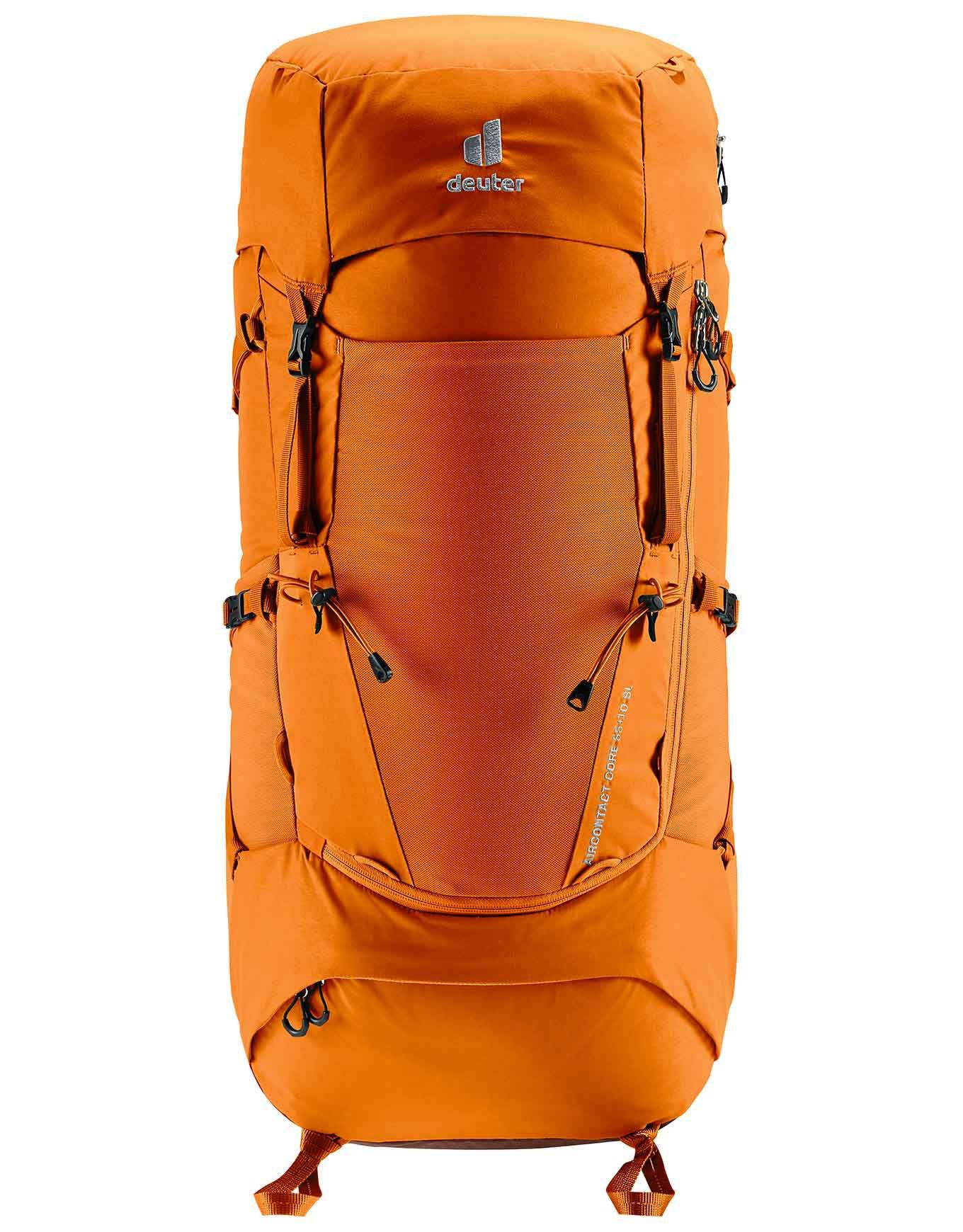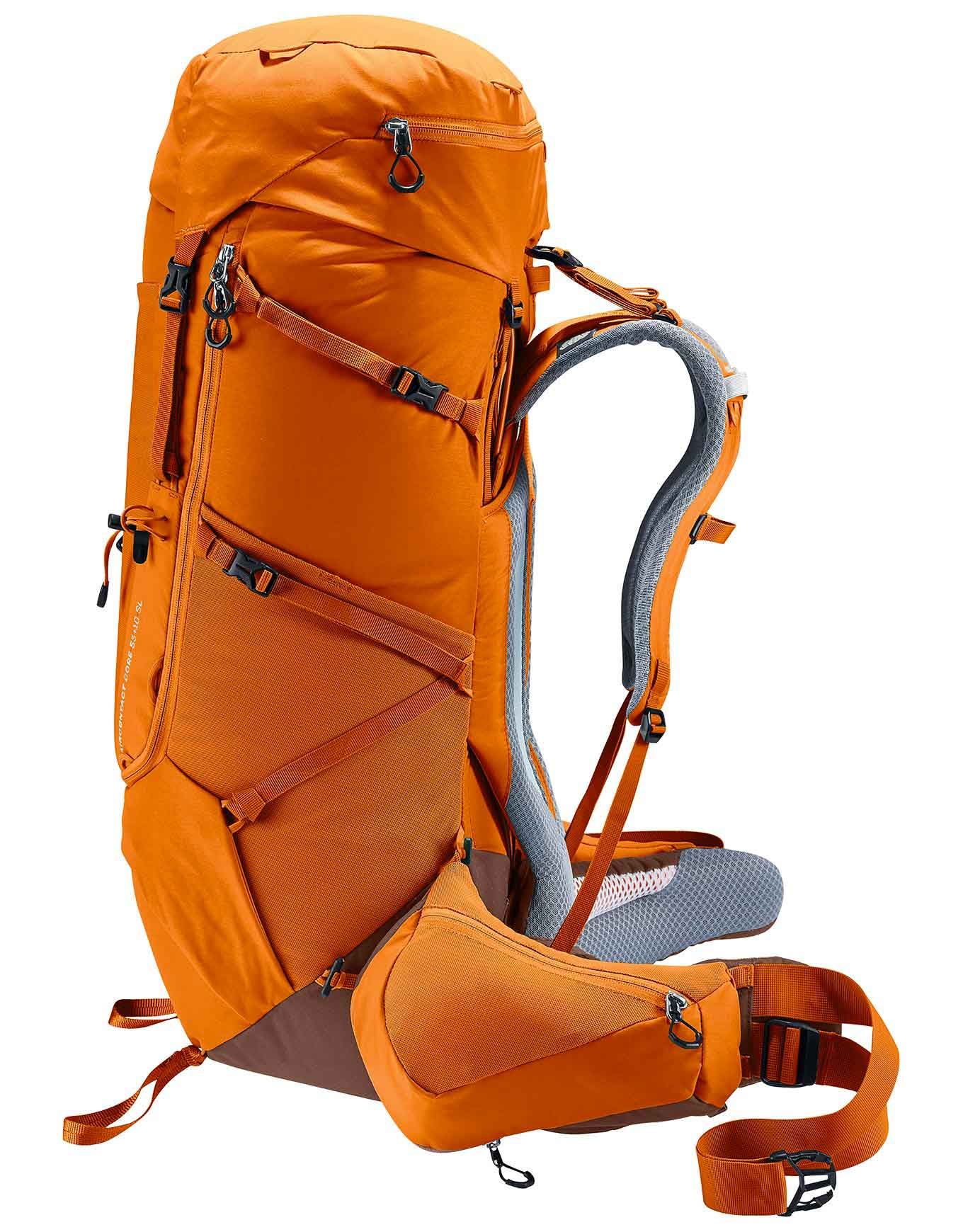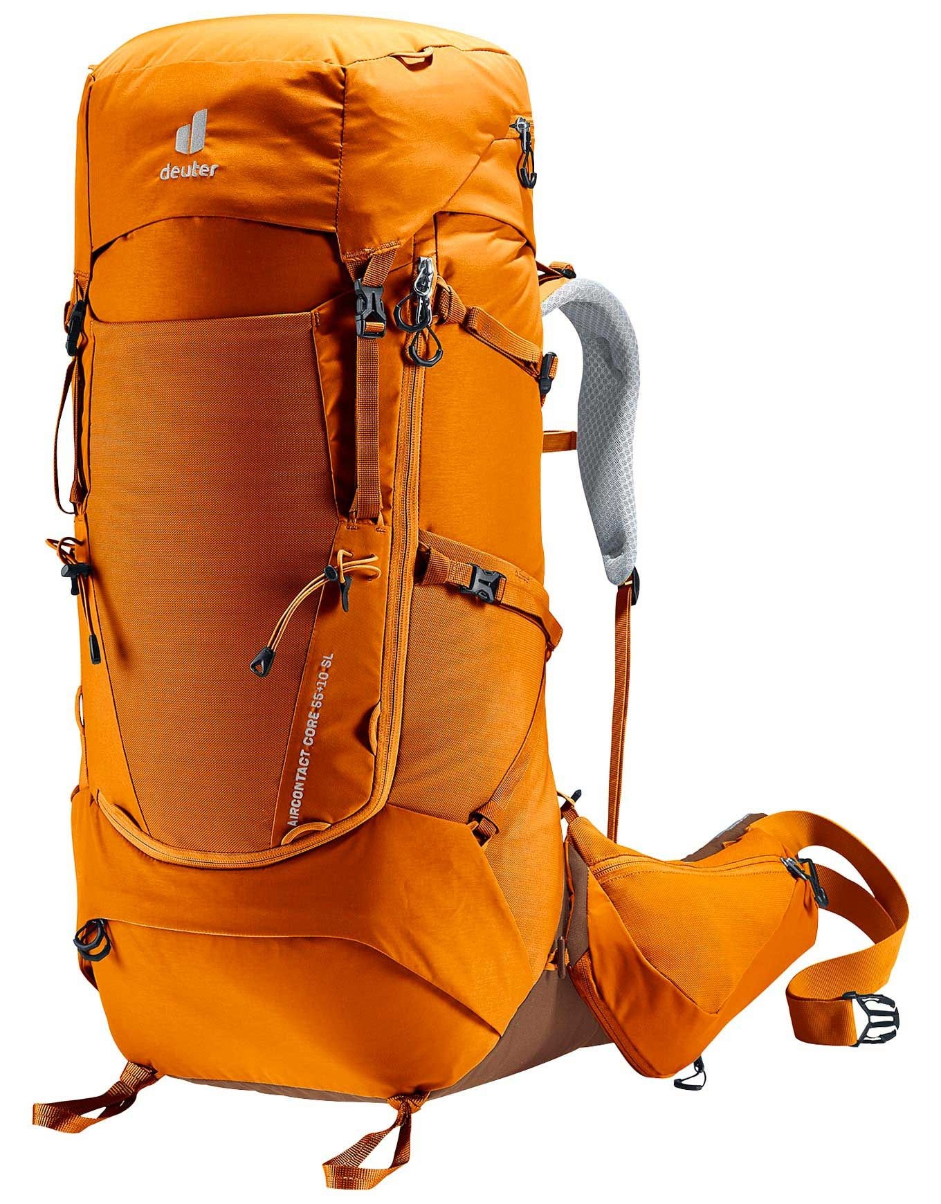 Sac à dos de trekking femme Deuter Aircontact Core 55+10 SL Chestnut Umbra, dos court et bretelles ajustées. Système Air Spacer Mesh pour ventilation maximale, VariQuick et Pull-Forward pour un portage personnalisé. Compartiment fond séparé, extensible pour affaires mouillées, compatibles poche à eau 3 L.