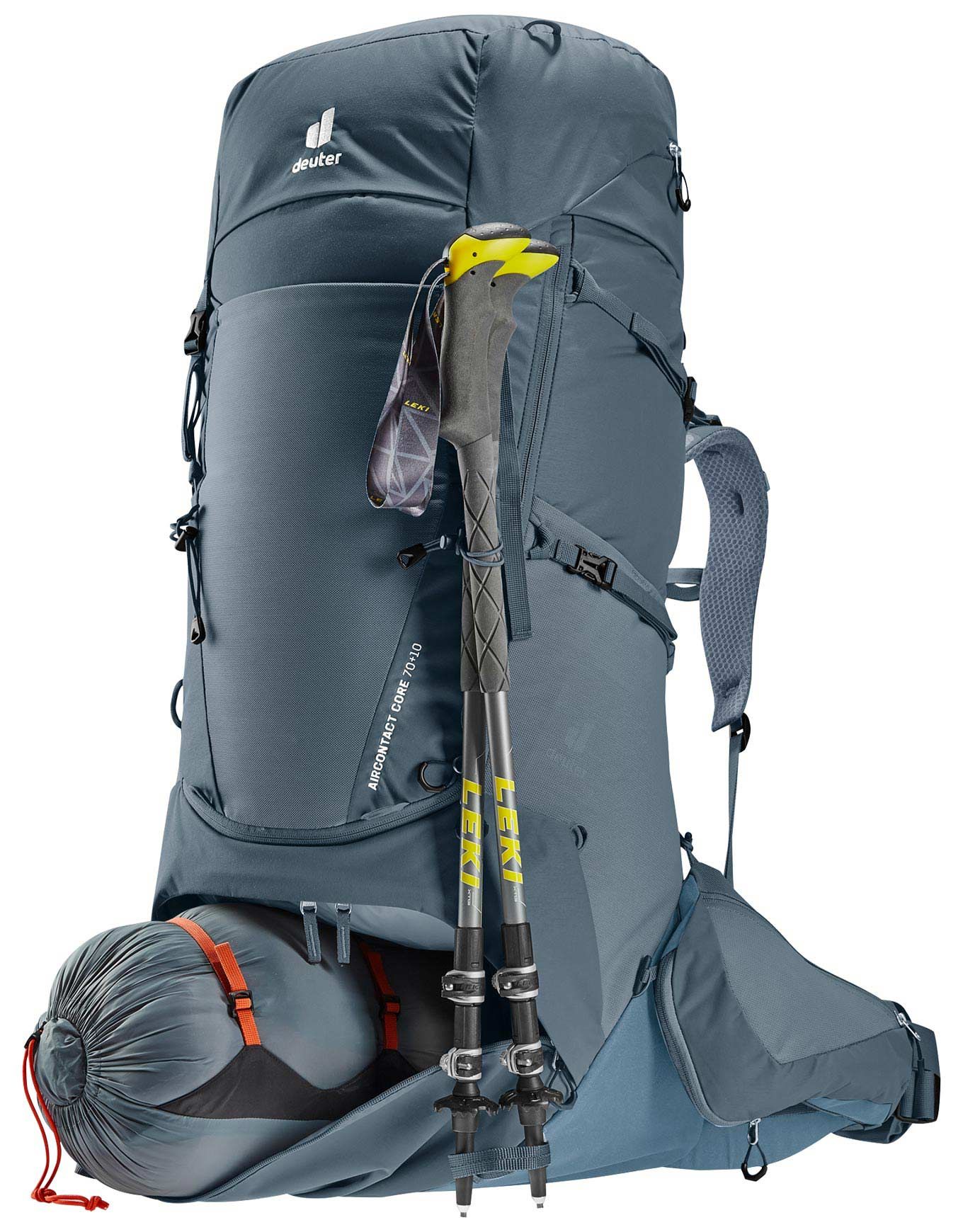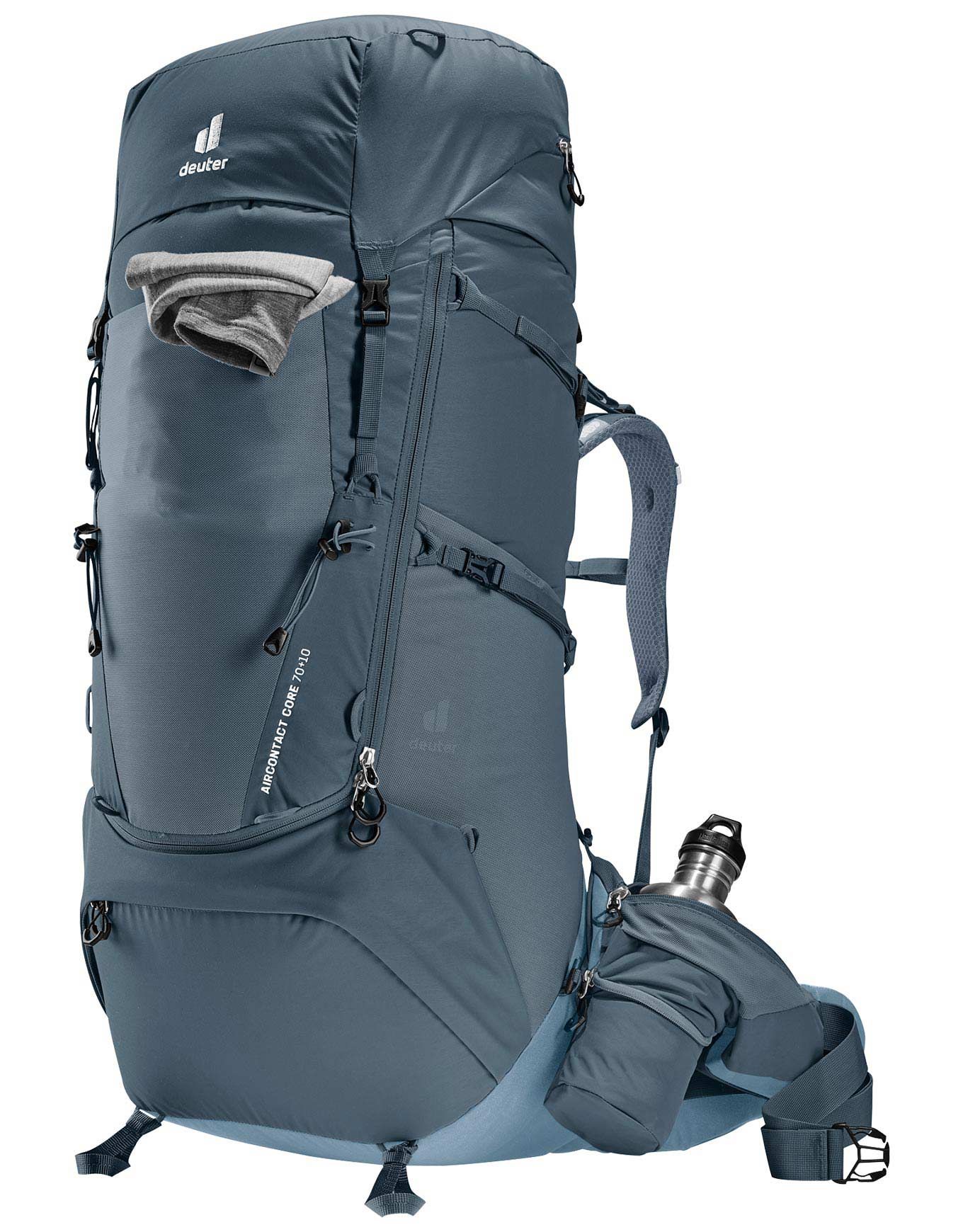Sac à dos de trekking Deuter Aircontact Core 70+10 Graphique Shale pour homme, volume 70+10 L. Système dorsal Air Spacer Mesh aéré, réglage VariQuick, compartiment fond séparé, extensible pour affaires humides, compatibles poche à eau 3 L.