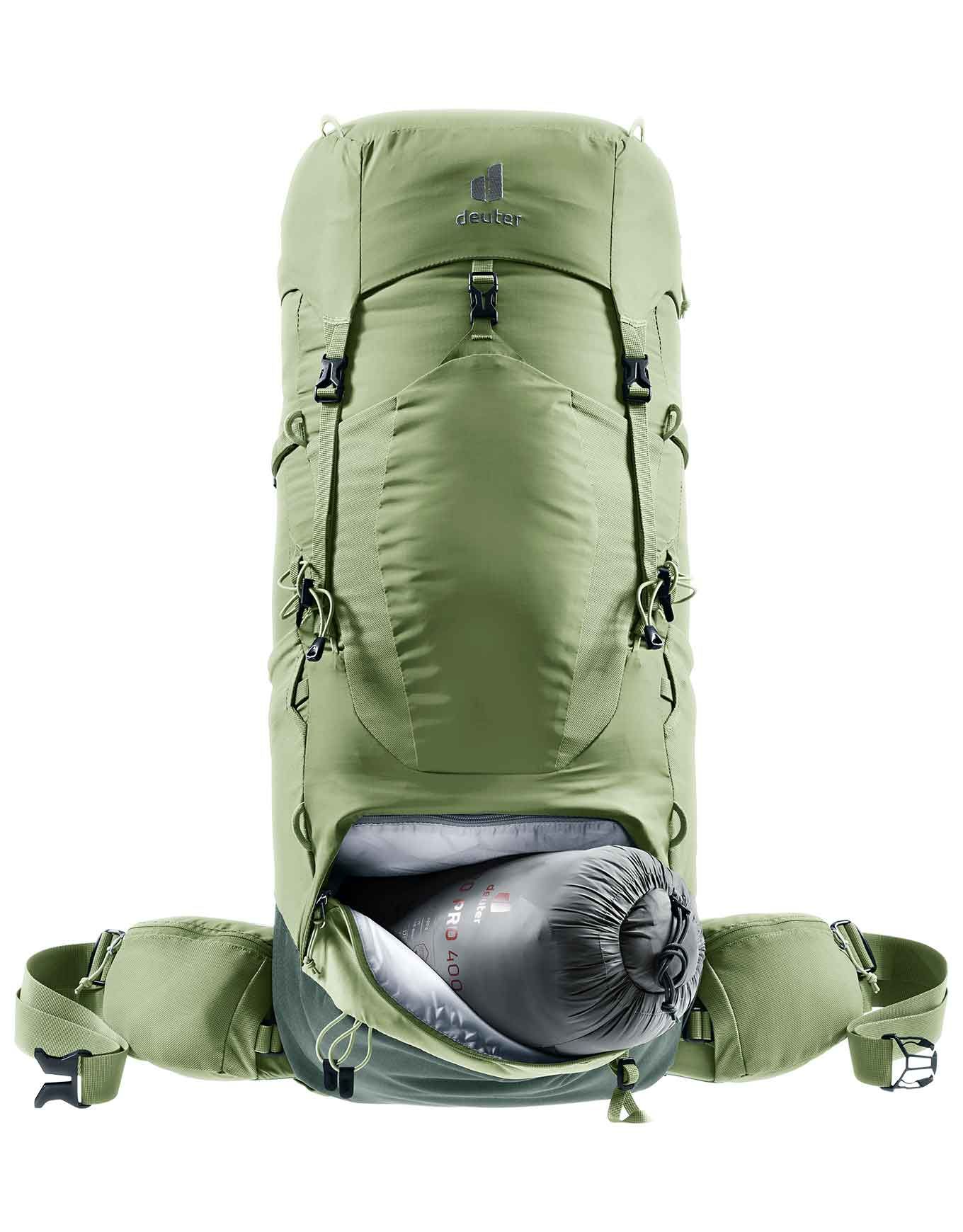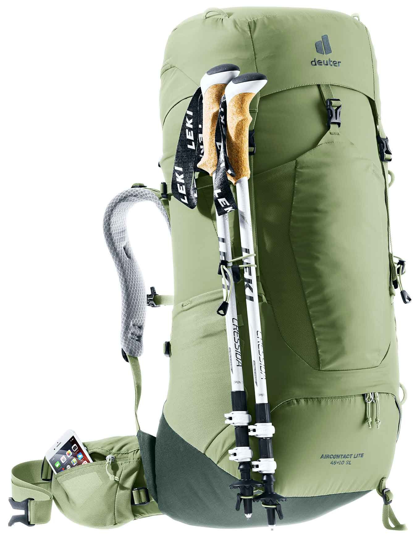 Sac à dos de trekking Deuter Aircontact Lite 45+10 SL Grove Ivy spécial femme, dos ergonomique réglable, portage proche et aéré, compartiment fond et poche extensible pour affaires mouillées,兼容3 L水袋.