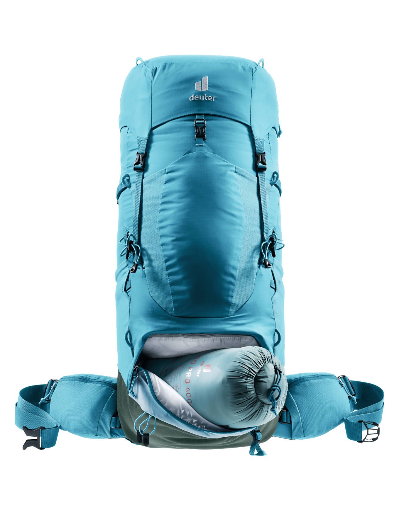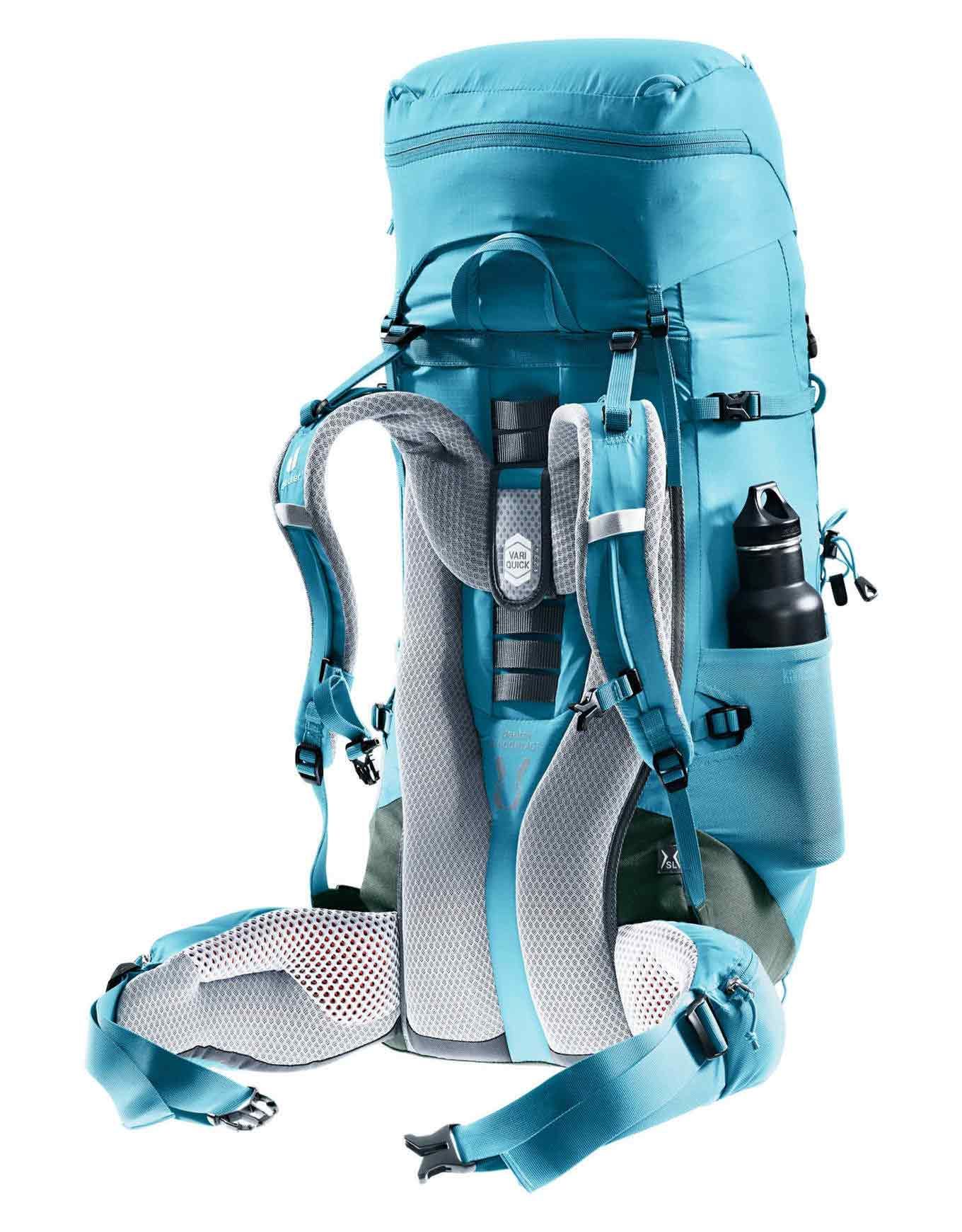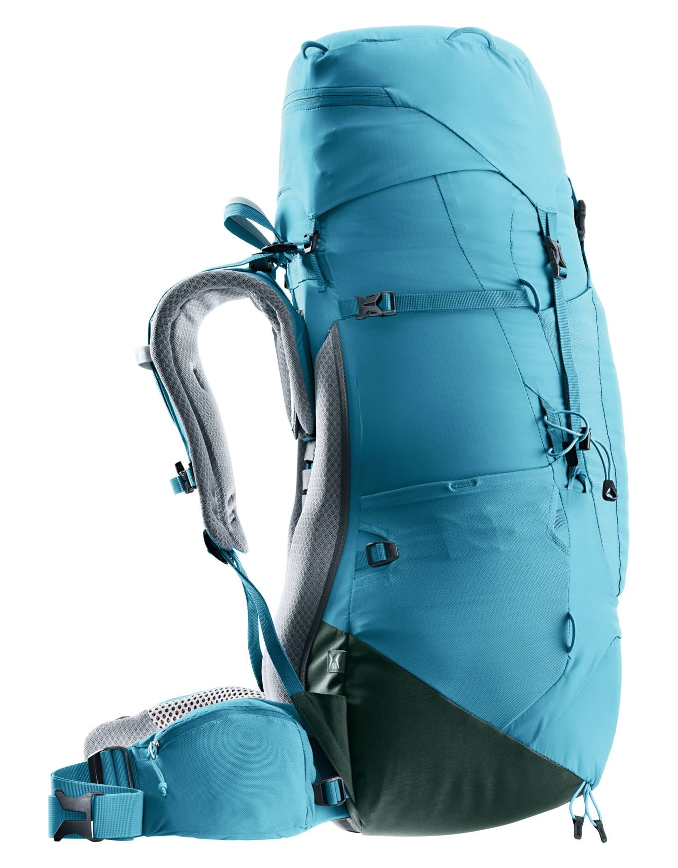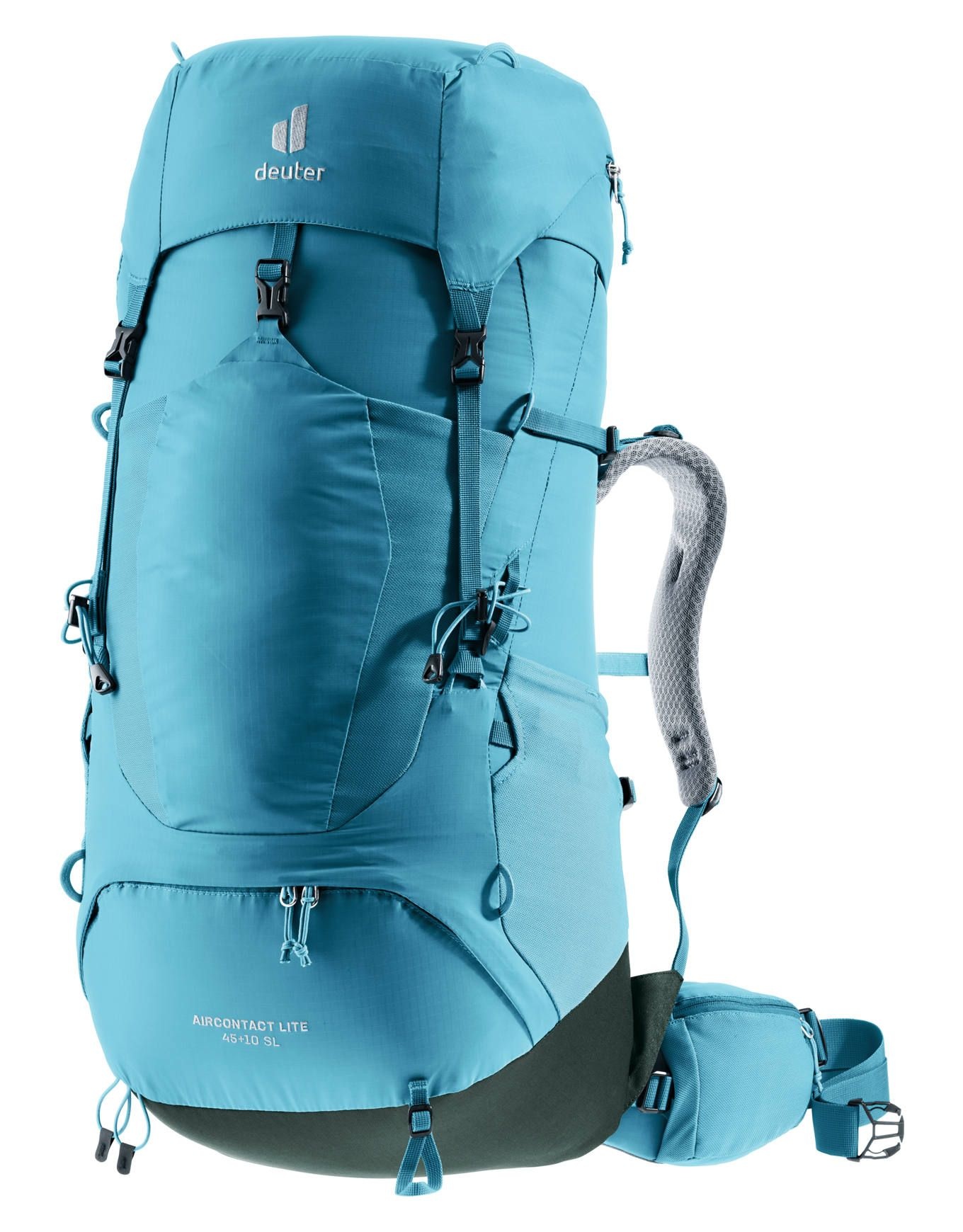 Deuter Aircontact Lite 45+10 SL Lagoon Ivy : sac à dos de trekking femme, 45 L extensible, dos court ergonomique, bretelles étroites, ceinture adaptée, compartiment humide, portage 15 % plus aéré.
