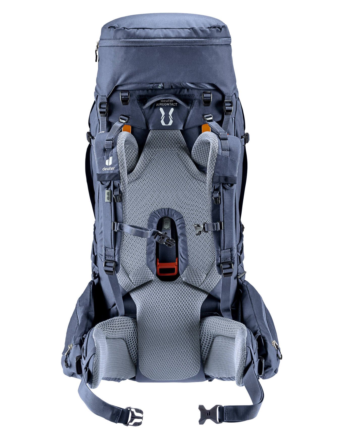 Sac à dos de trekking Deuter Aircontact X 60+15 Ink conçu pour les longues randonnées : cadre V-Frame, dos Aircontact ventilé, réglages VariSlide et VariFlex pour un portage stable et personnalisé.