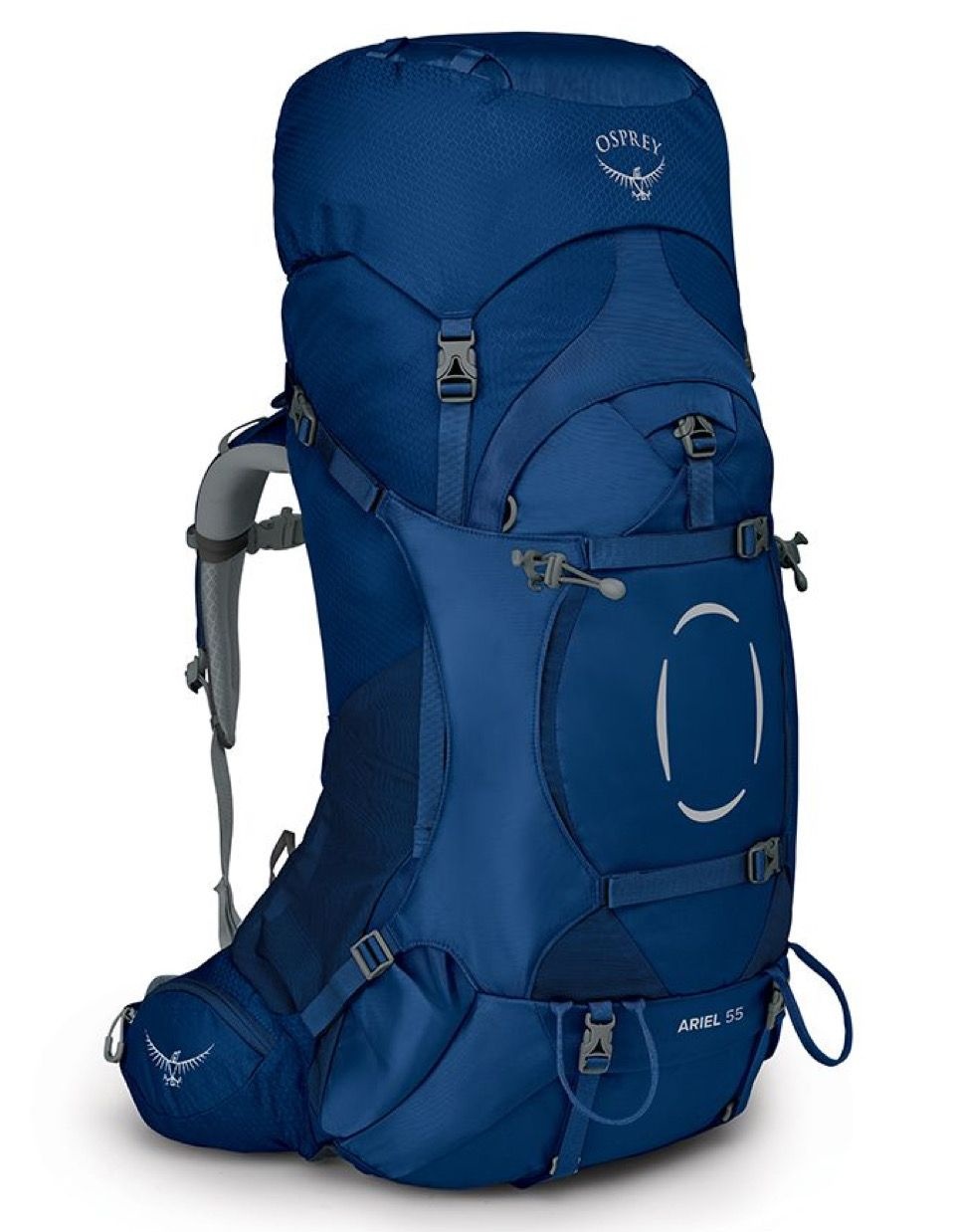 Sac à dos de trekking femme Osprey Ariel 55 Ceramic Blue, 55 L, réglage dorsal et bretelles Fit-on-the-Fly, suspension AirScape respirante, pochettes ceinture, ouverture U, compatible Daylite.