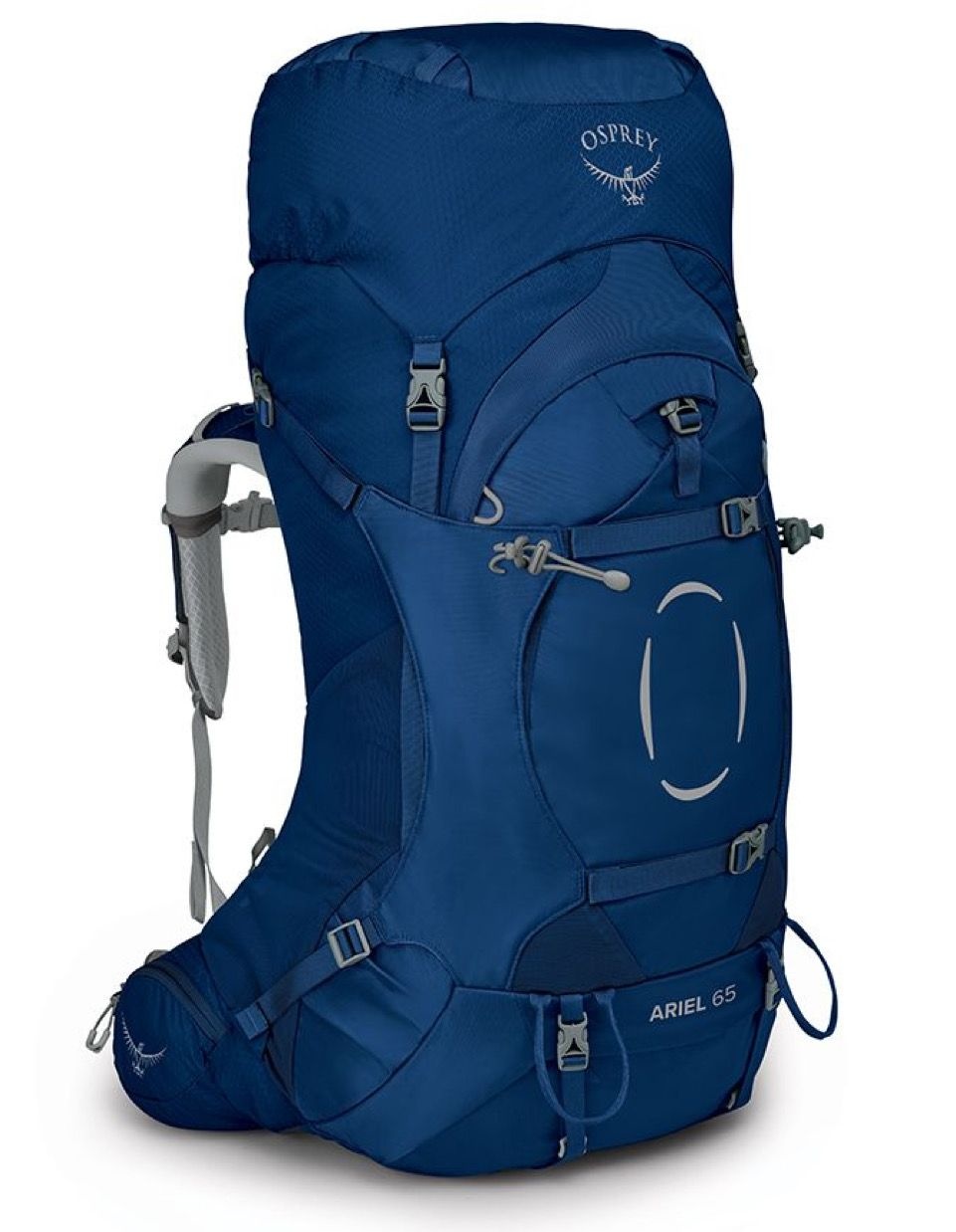 Sac à dos de trekking femme Osprey Ariel 65 Ceramic Blue, 65 L, réglage dorsal et bretelles Fit-on-the-Fly, suspension AirScape respirante, poche ceinture, ouverture U,兼容 Daylite, résistant.