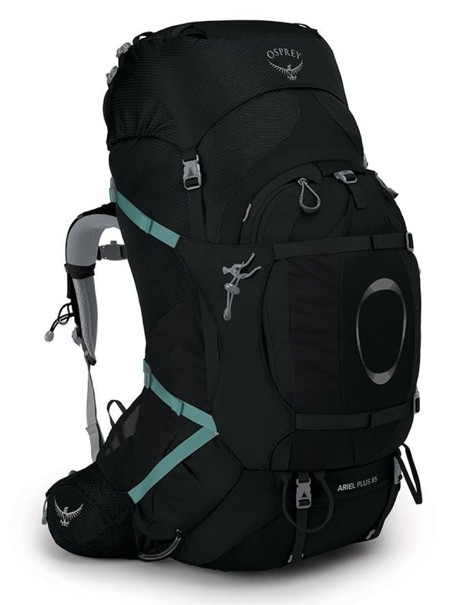 Sac à dos de trekking femme Osprey Ariel Plus 85, volume 85 L pour grandes expéditions, stabilité renforcée par cadre LightWire, ajustement personnalisé Fit-on-the-Fly, panneau arrière AirScape respirant, compartiment amovible transformable en daypack.