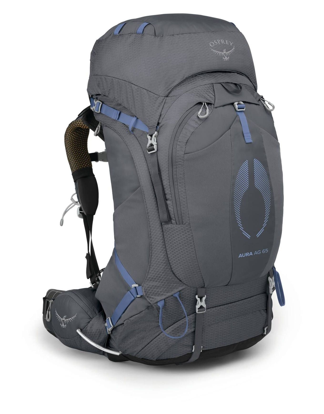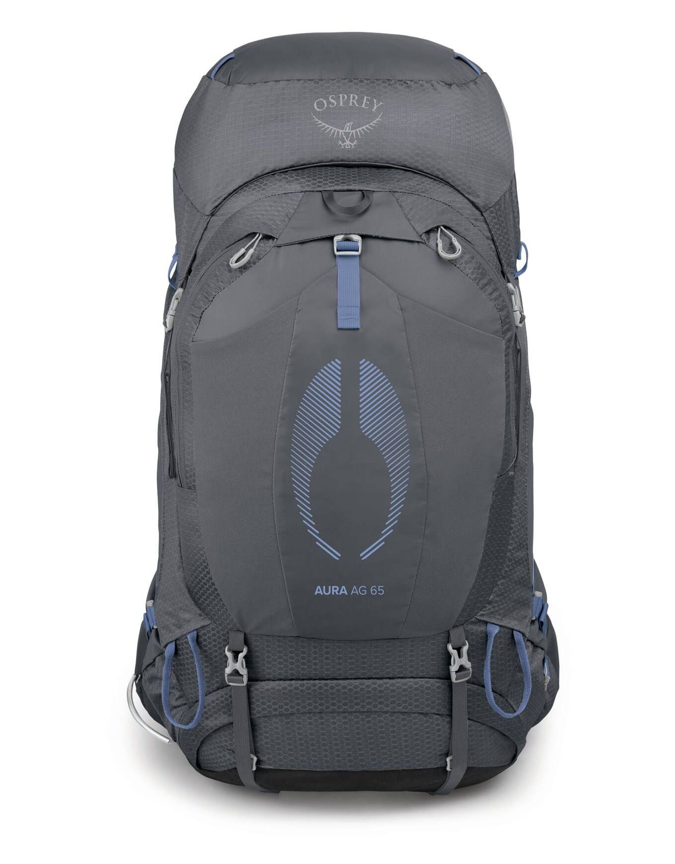 Sac à dos de trekking femme Osprey Aura AG 65 Tungsten Grey avec système AG AntiGravity™ ventilé, ajustement anatomique, accès multiples, housse pluie intégrée.