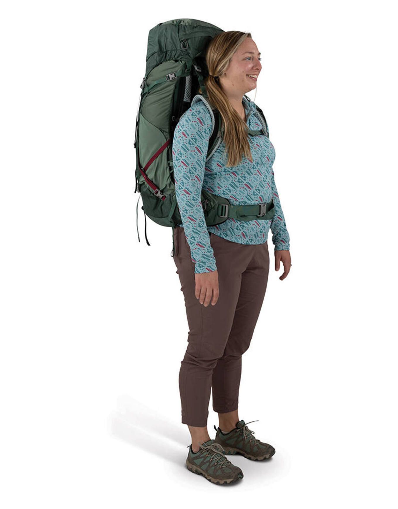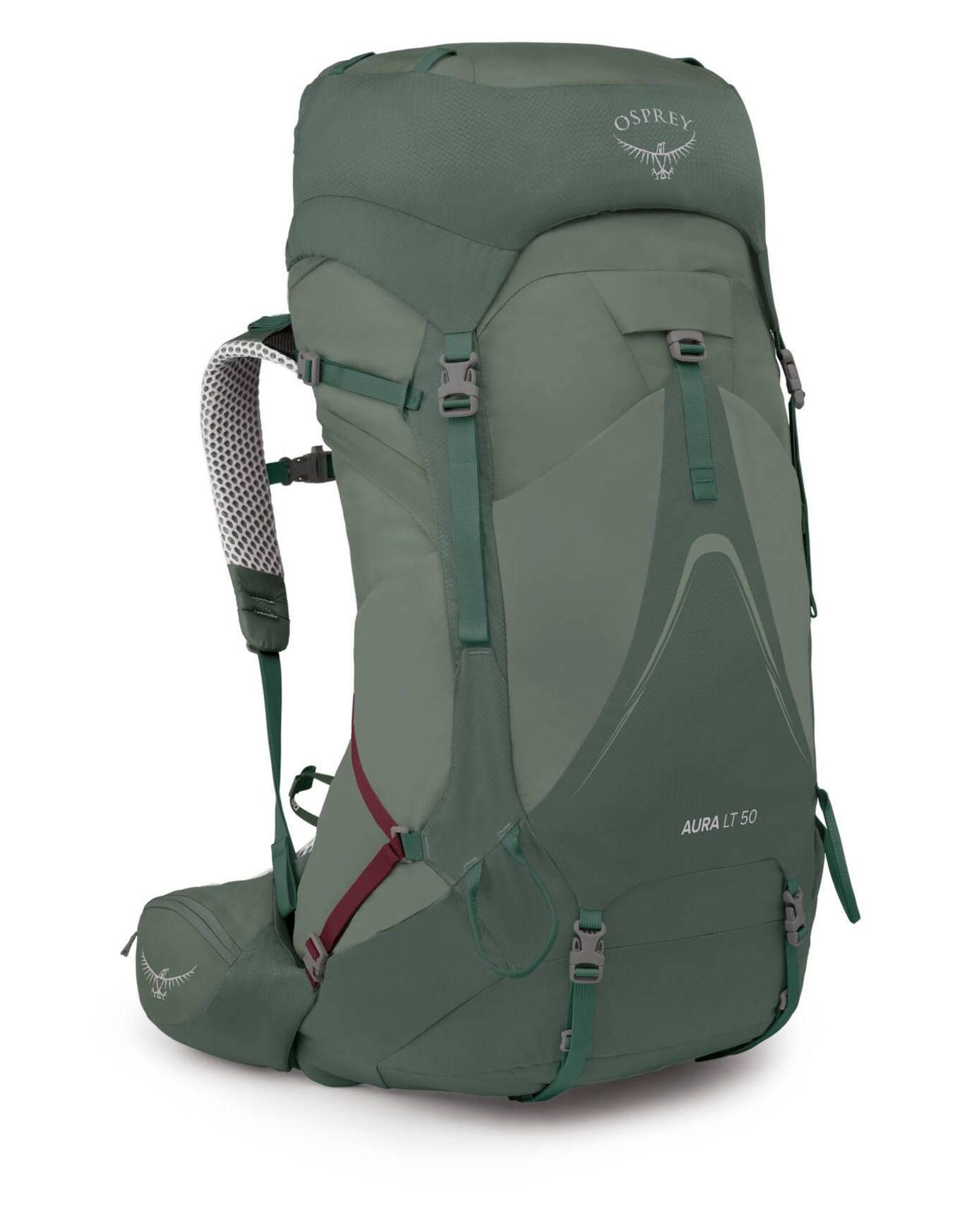 Sac à dos de trekking femme Osprey Aura AG LT 50, 50 L en tissu 100 % recyclé, 10 % plus léger, système AntiGravity ventilé et ceinture Fit-on-the-Fly ajustée à la morphologie féminine, accès fond de sac, houde pluie intégrée, porte-bâtons et poche hydration.