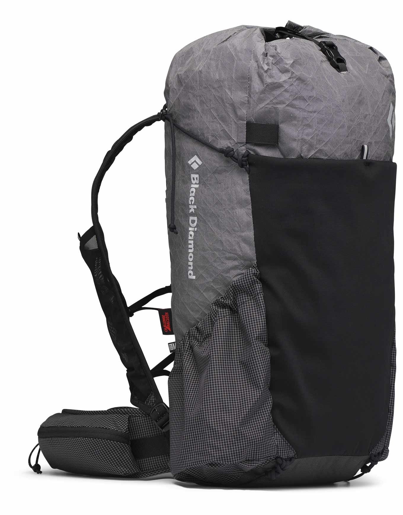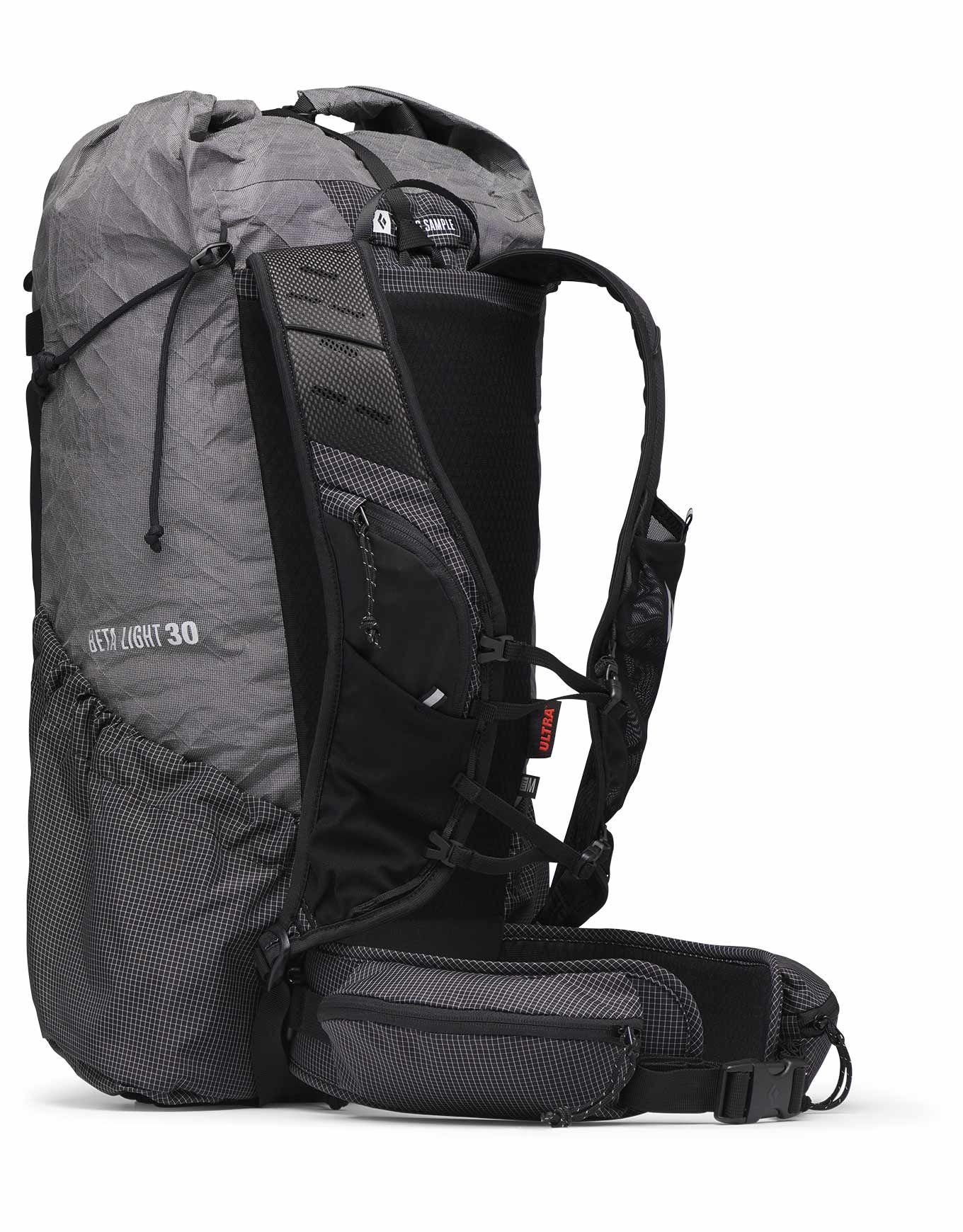Sac de trekking Black Diamond Beta Light 30 Storm Gray en tissu Ultra 200 ultra-léger et résistant, étanche, avec ceinture ventrale et armature amovibles, poche Power Mesh extensible et bretelles confortables.