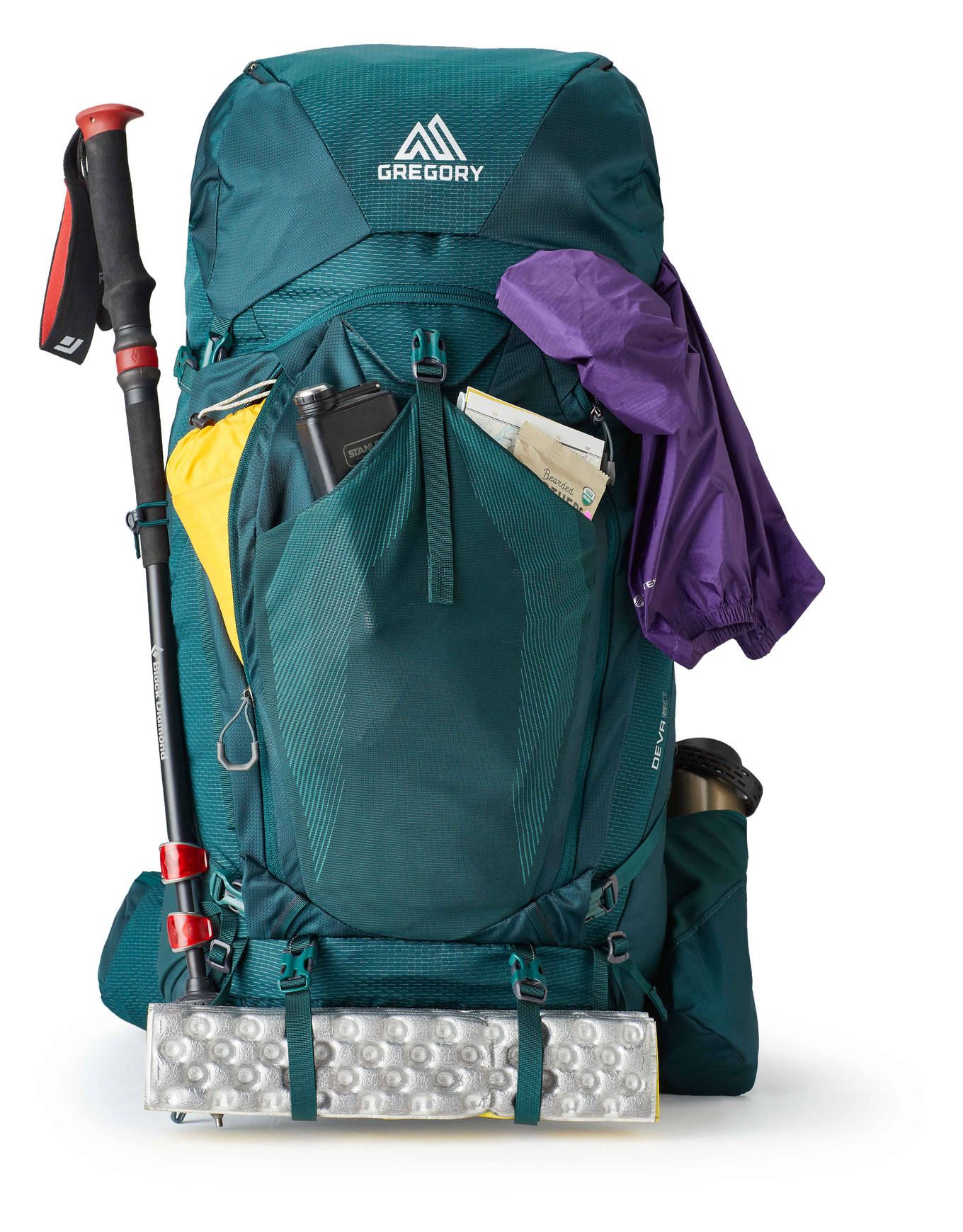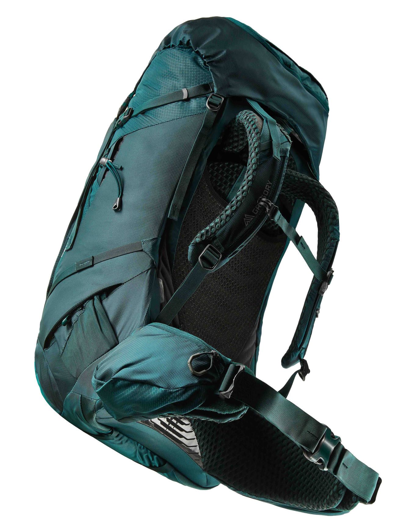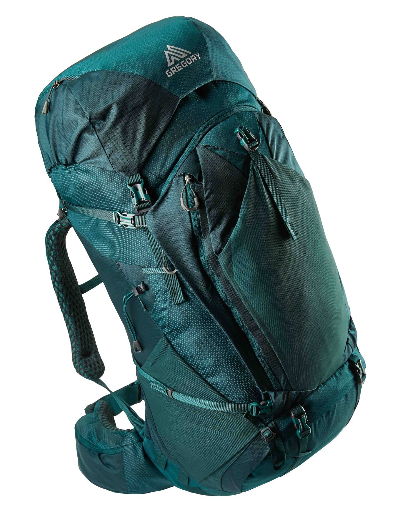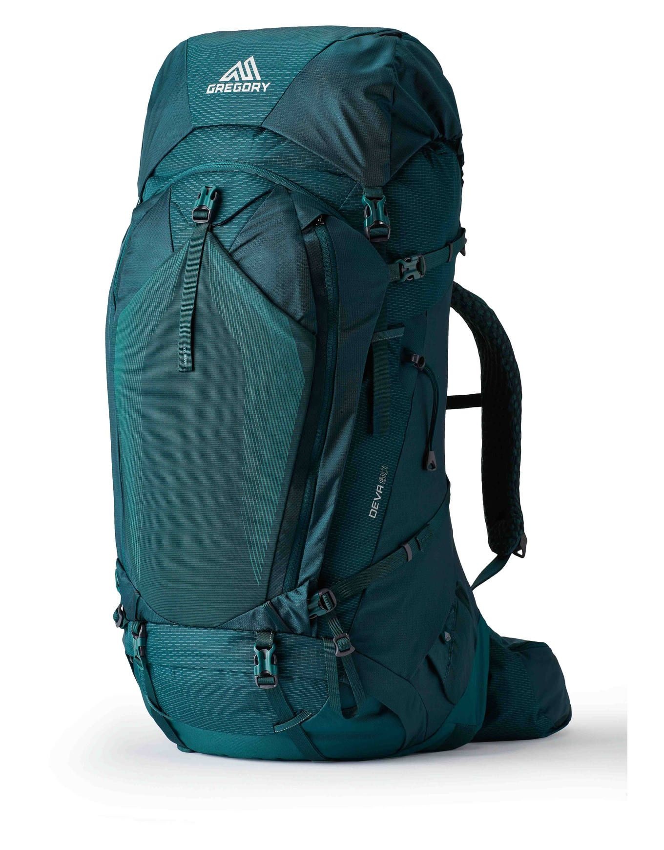 Sac à dos Gregory Deva 60 Rc Emerald Green spécialement conçu pour femme, offrant 60 litres de volume et la technologie FreeFloat A3 pour un ajustement précis à la morphologie féminine lors des randonnées de plusieurs jours.