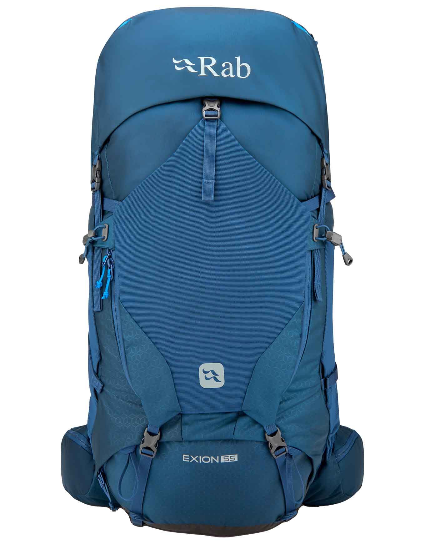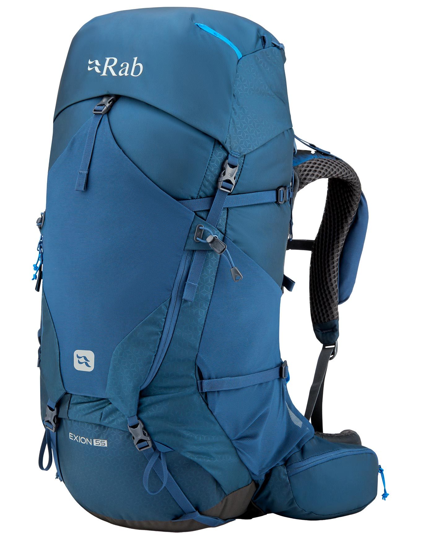 Sac à dos de randonnée Rab Exion 55 Tempest Blue, 55 L, avec système de portage V-TRAX™ réglable, cadre aluminium et revêtement étanche nylon 330D/polyester 600D. Accès latéral en U, ceinture rembourrée, houss