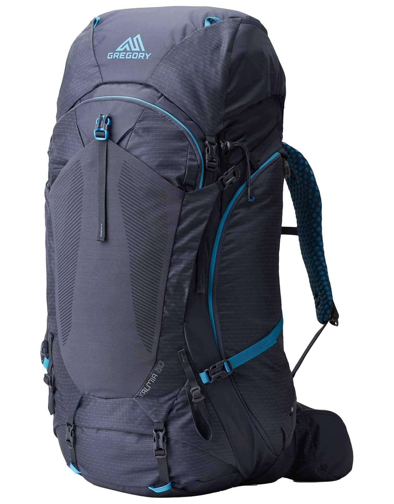 Sac à dos de trekking Gregory Kalmia 60 Rc Solstice Blue, 60 L, cadre fibre de verre, suspension Freefloat 360, bretelles autopivotantes, dos aéré Polygiene, accès latéral, compatible poche hydratation.