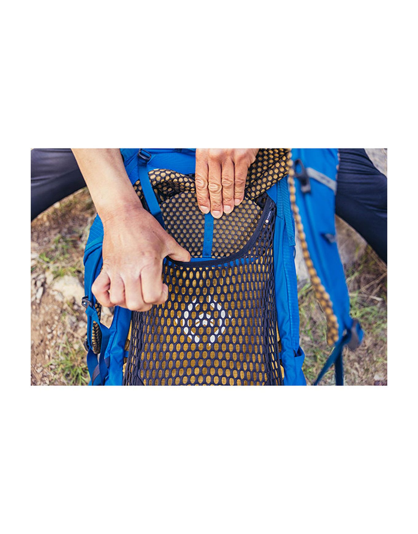 - Poche latérale extensible en mesh avec sangles de compression supérieure/inférieure.