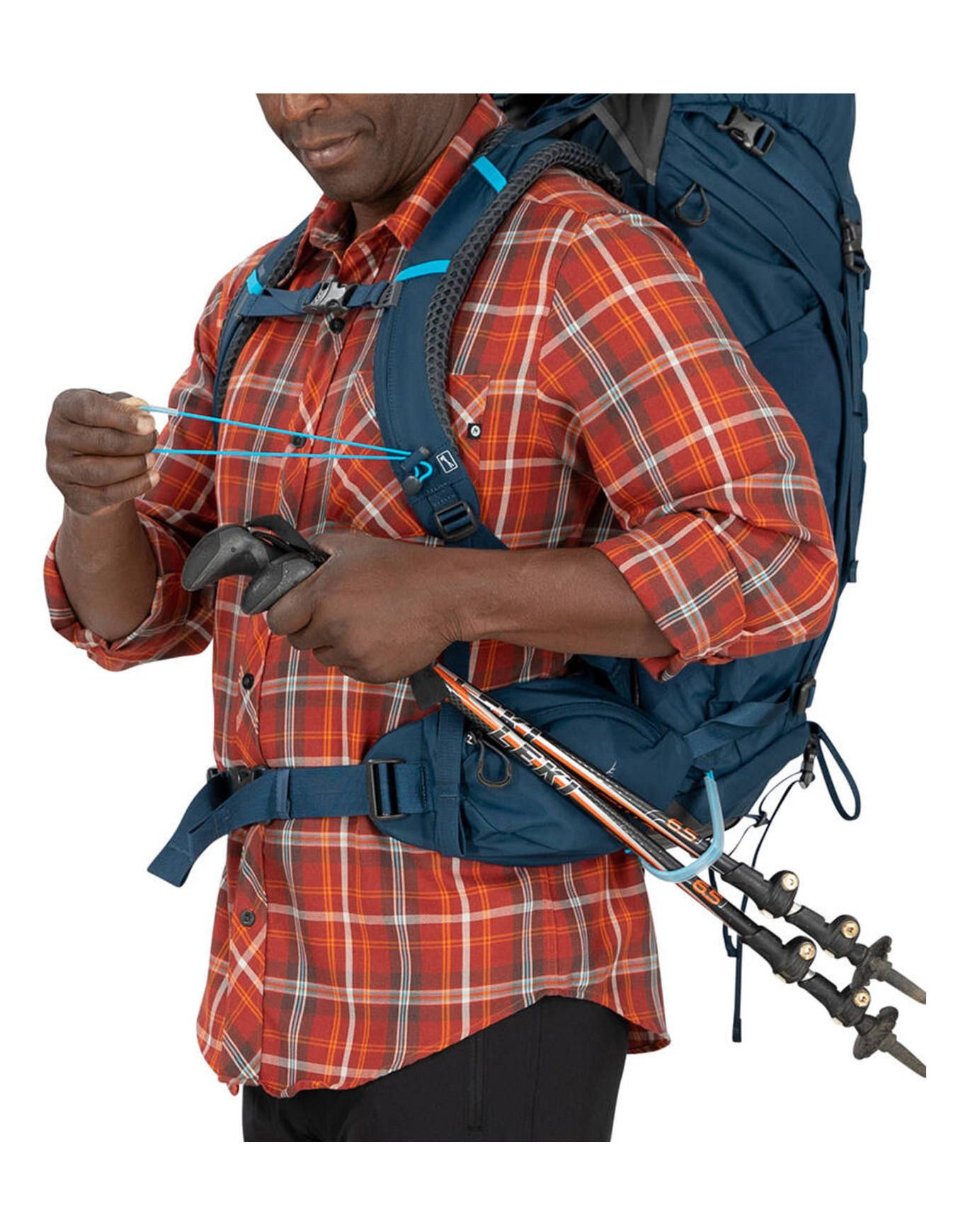 On retrouve l’ensemble des fonctionnalités signatures Osprey : le système Stow-On-The-Go™ pour le port des bâtons, les sangles de compression, les attaches pour tapis de sol, les porte-piolets et les multiples boucles. La protection contre les intempéries est assurée par une housse imperméable intégrée au sac.