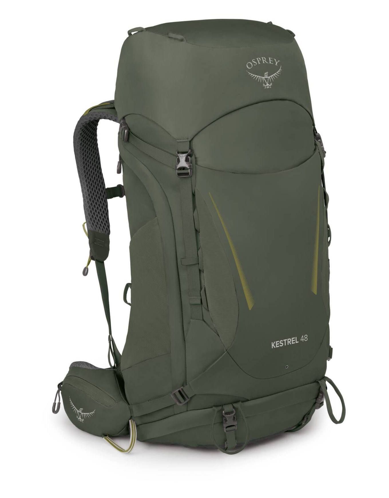 Sac à dos de randonnée Osprey Kestrel 48 litres Bonsai Green pour homme, réglable et ventilé. Accès latéral, compartiment couchage, housse pluie intégrée, porte-bâtons Stow-On-The-Go.