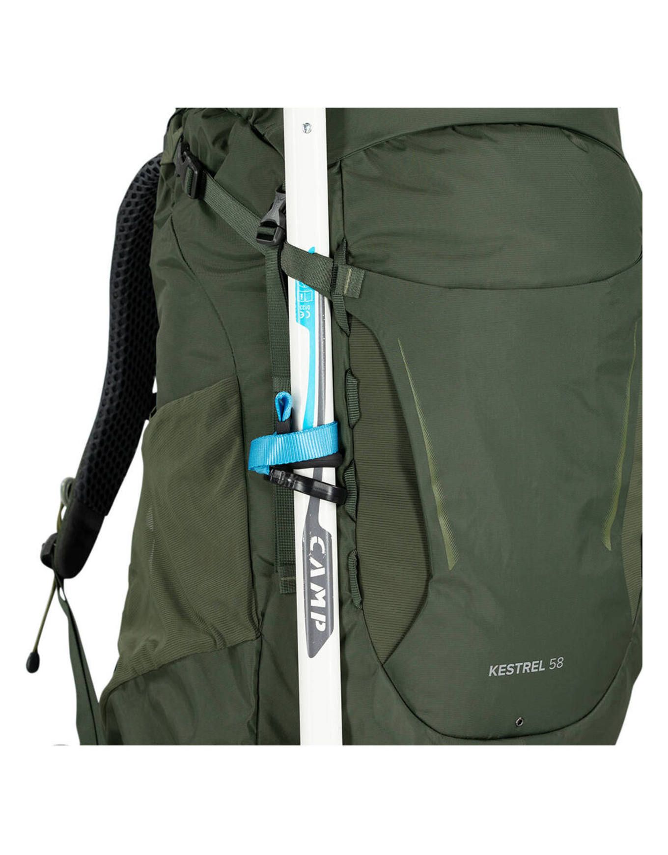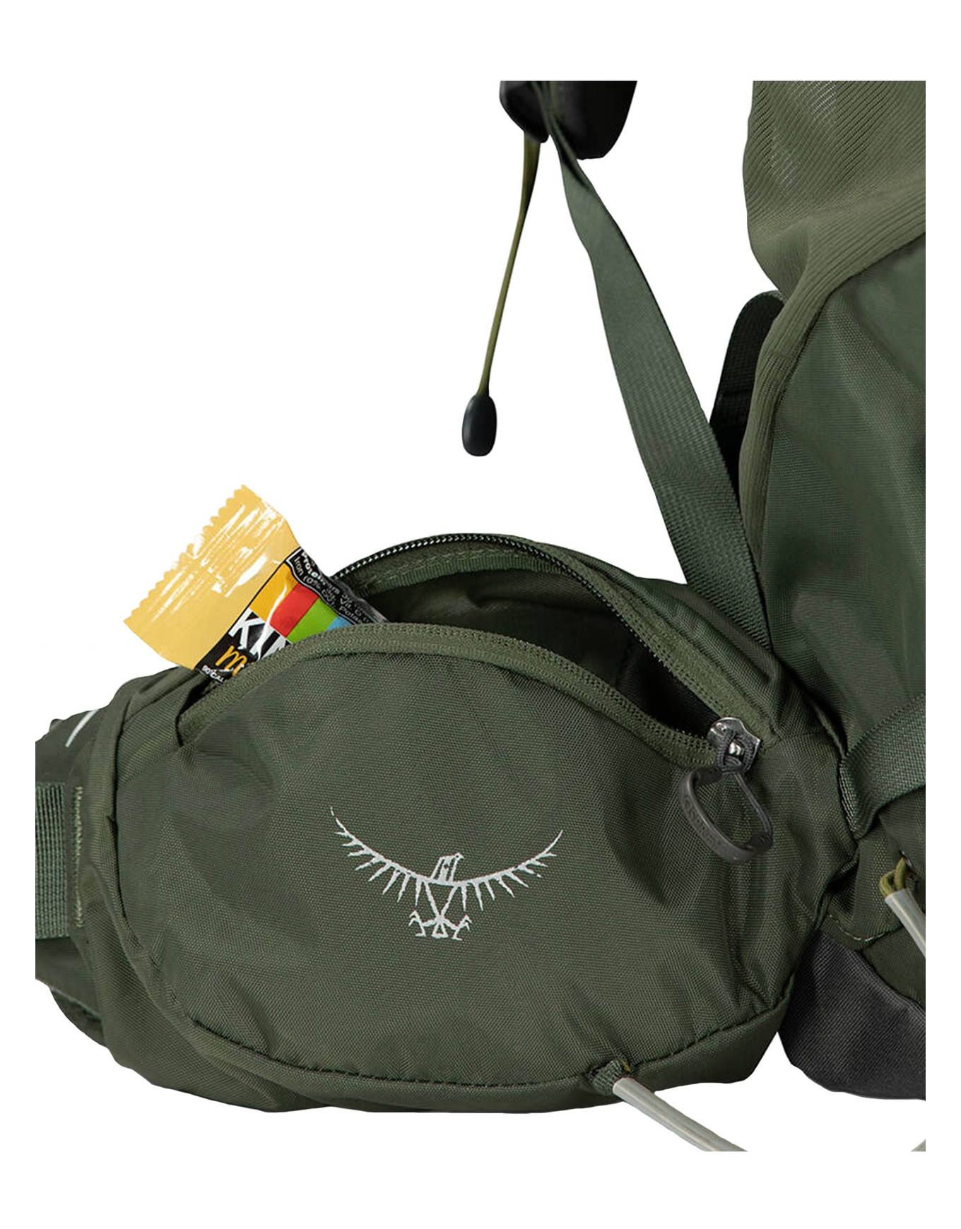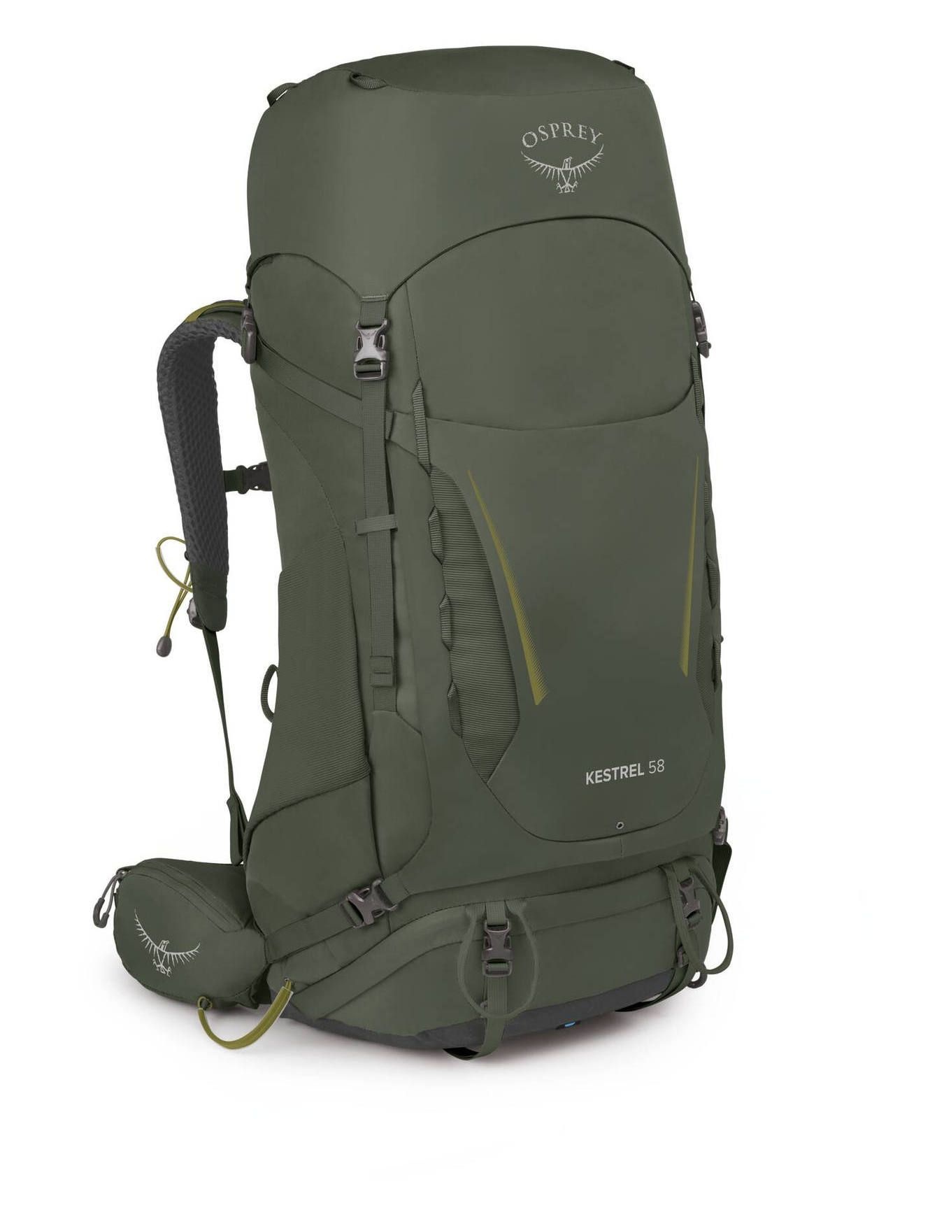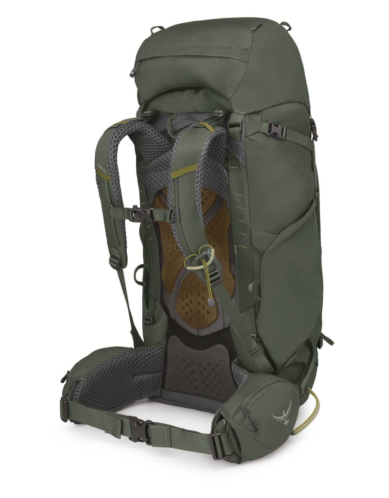 Sac à dos de trekking Osprey Kestrel 58 Bonsai Green, 58 L, ajustable complètement : dos AirScape réglable, bretelles Airmesh ventilées, ceinture amovible, zip latéral, compartiment sac de couchage amovible, housse pluie intégrée, porte-bâtons Stow-on-the-Go.