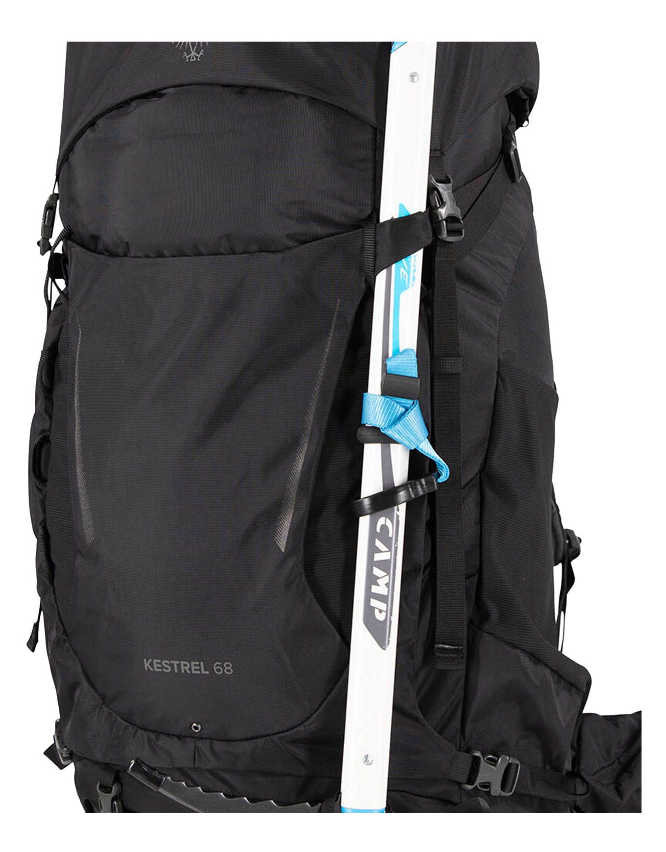 Sac à dos de trekking Osprey Kestrel 68 litres, ajustable, dorsal AirScape, housse pluie intégrée, accès latéral, compartiment couchage, porte-bâtons Stow-On-The-Go.