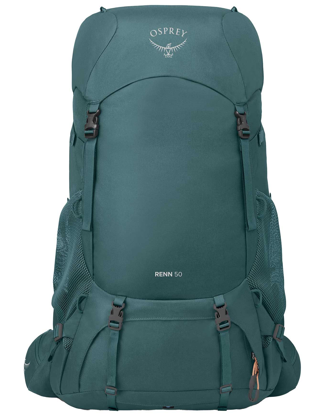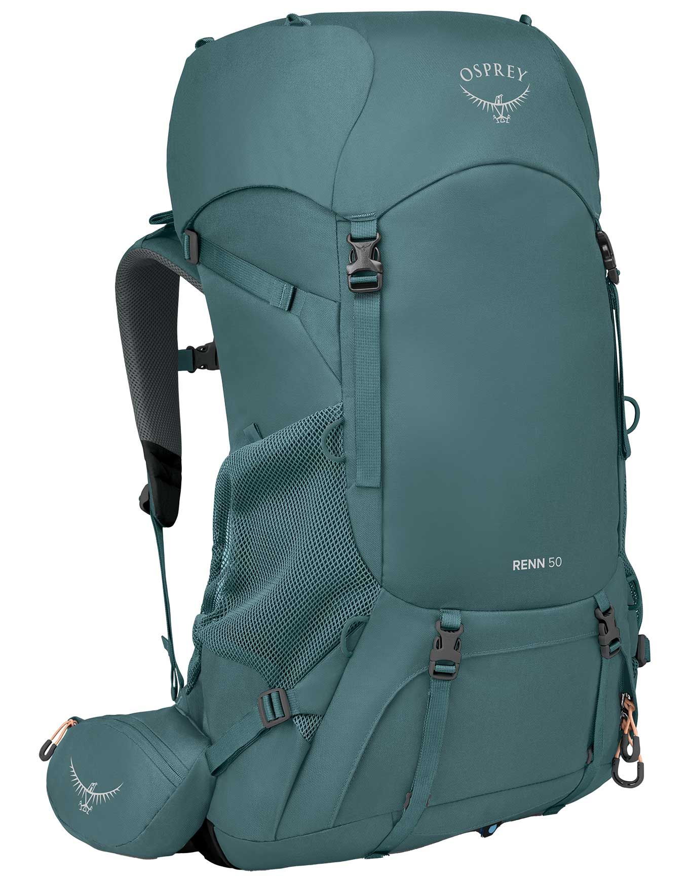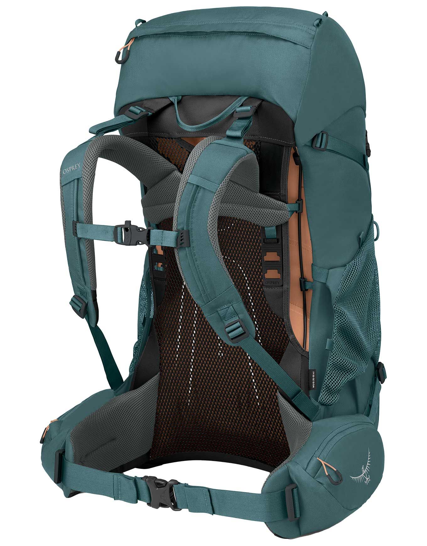 Sac à dos de trekking Osprey Renn 50 Cascade Blue/Melon, 50 L spécialement adapté aux morphologies féminines, avec dos AirSpeed ventilé réglable, ceinture ultra-rembourrée, compartiment sac de couchage et compatibilité Daylite pour randonnées autonomes.