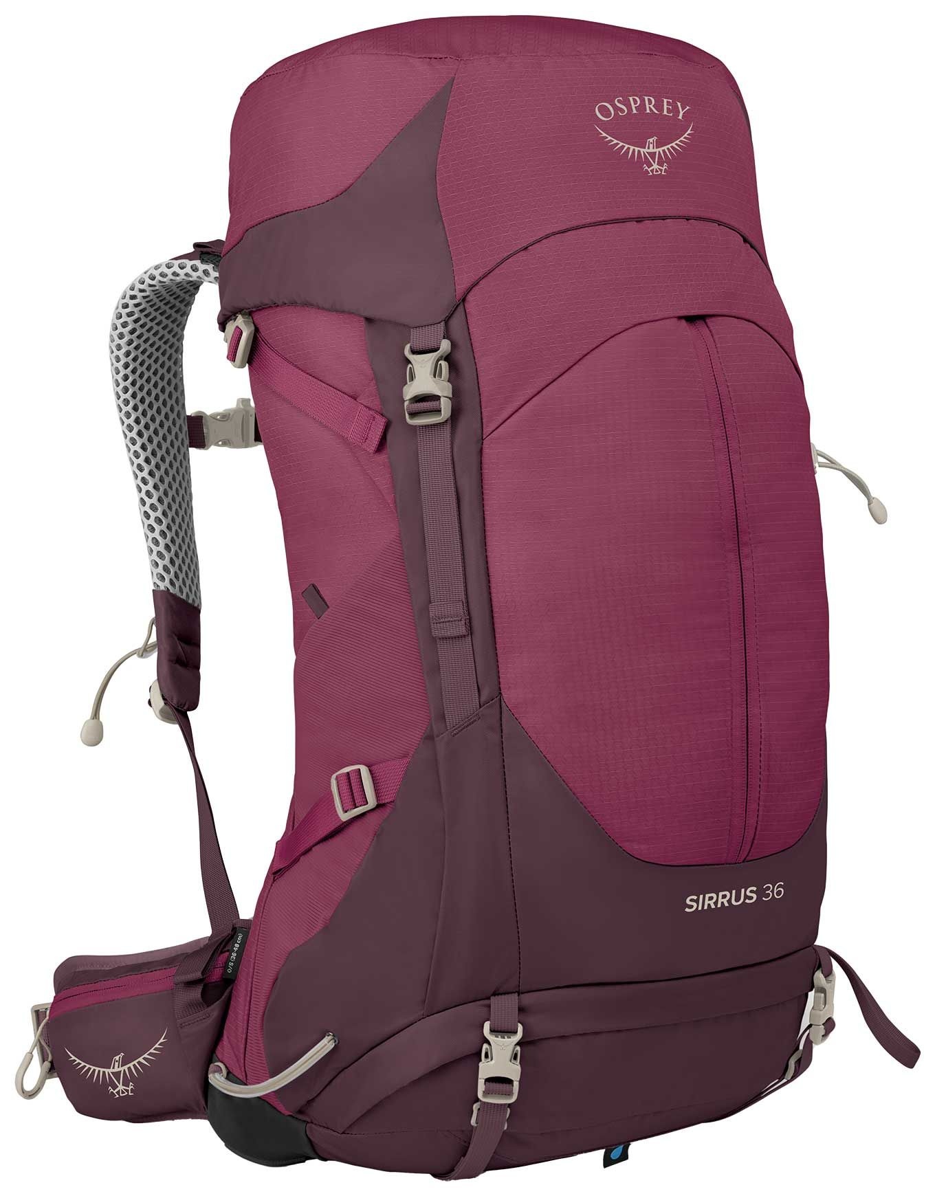 Sac à dos de trekking femme Osprey Sirrus 36 : dorsal AirSpeed ajustable, 36 L, accès latéral, housse pluie, fixation bâtons Stow-on-the-Go, compatibles poche à eau 3 L.
