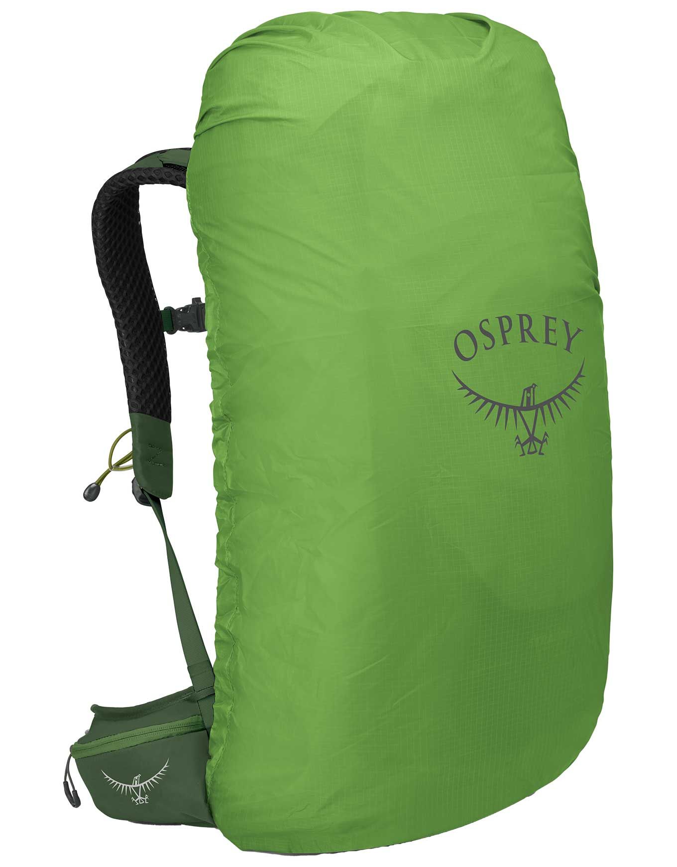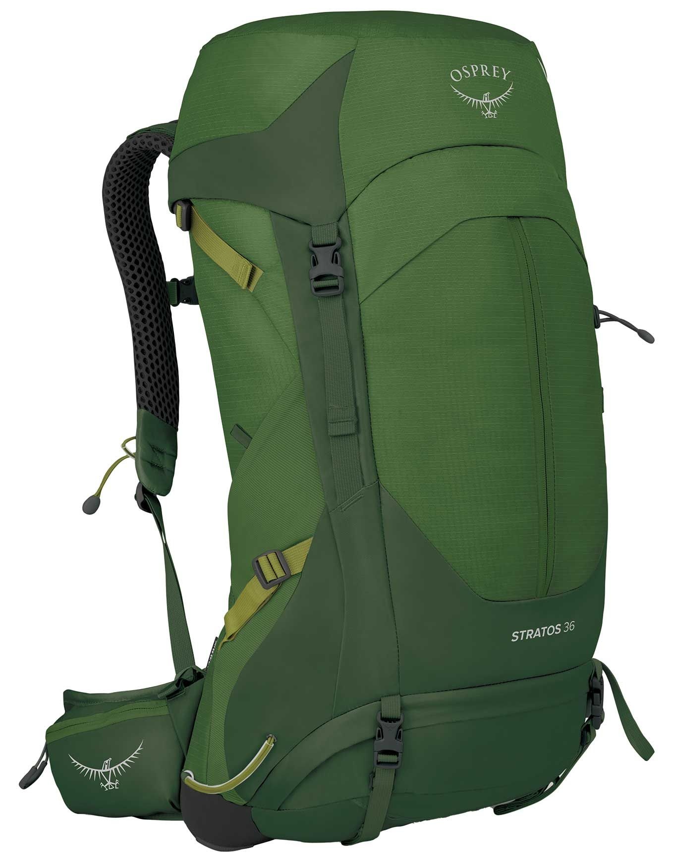 Sac à dos de trekking Osprey Stratos 36 Seaweed/Matcha Green 36 L pour homme, dorsal AirSpeed ajustable, accès latéral, housse pluie, fixation bâtons Stow-on-the-Go,兼容 poches à eau Hydraulics™, poches ceinture et sangles compression.