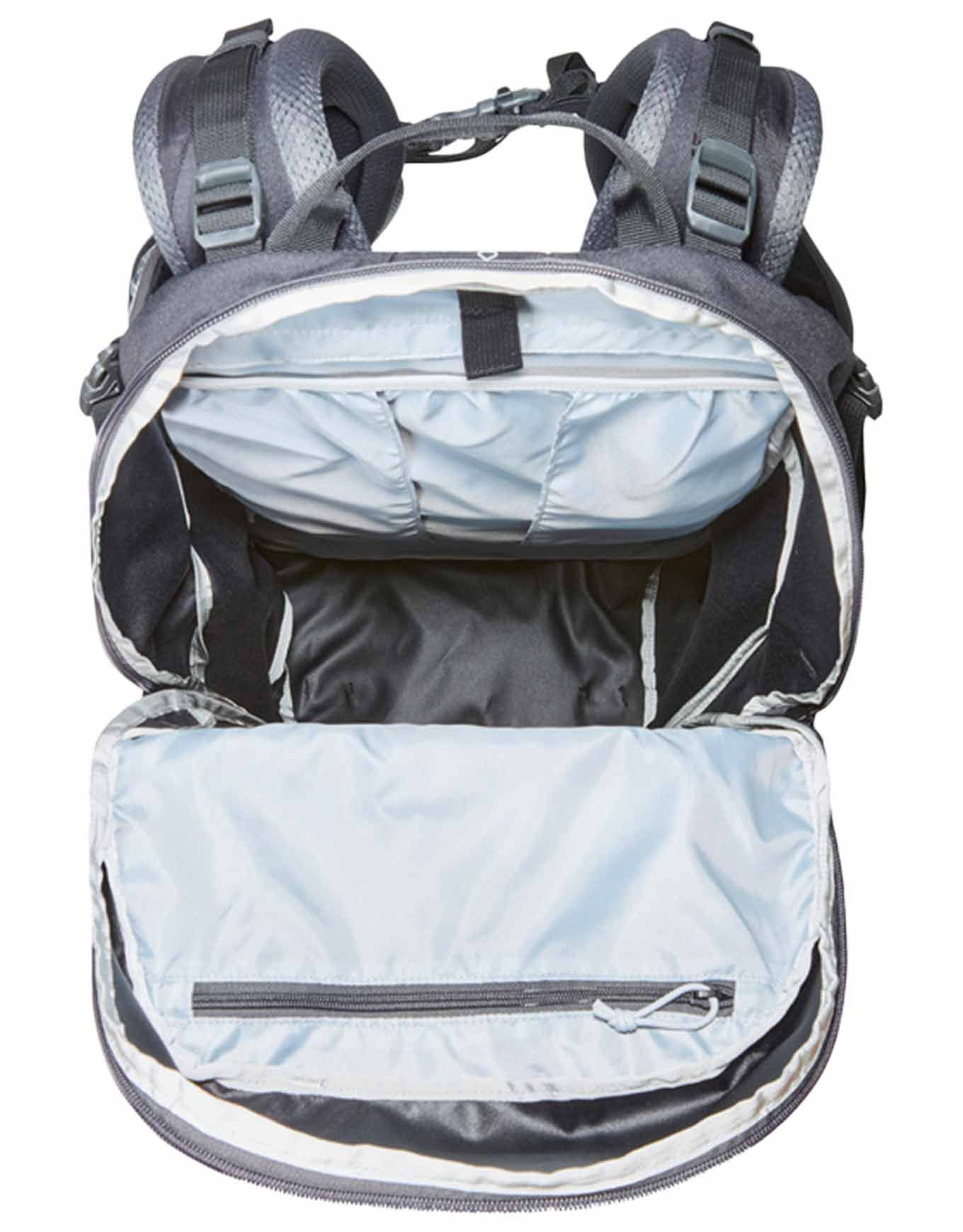 Une protection fiable contre l’humidité est offerte par la finition déperlante DWR du tissu. L’équipement complet trouve sa place dans le volume généreux de 40 litres, accessible aisément grâce à la large ouverture. Des attaches pour bâtons et de multiples poches viennent compléter ce modèle particulièrement pratique en sortie.