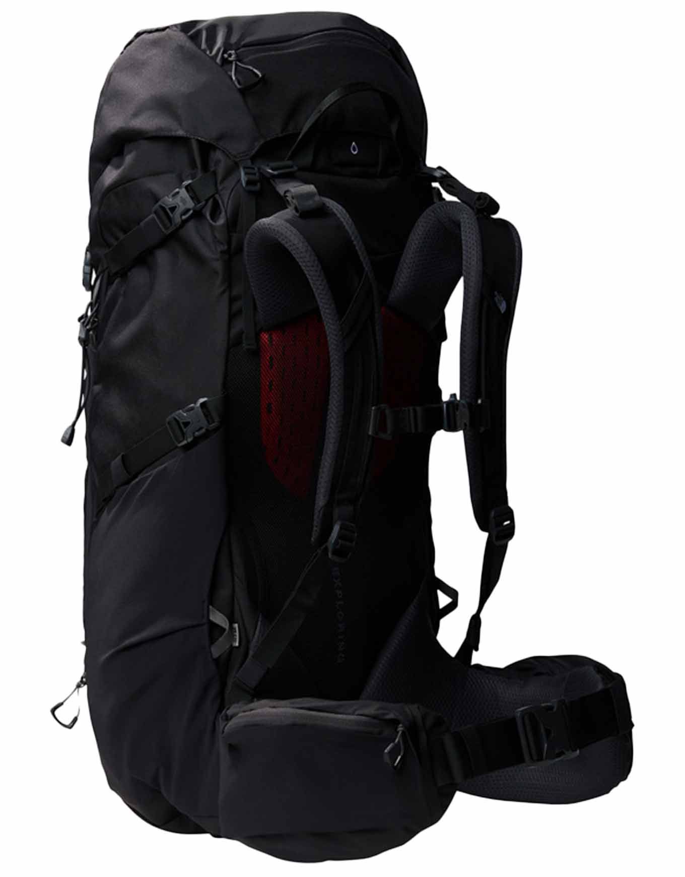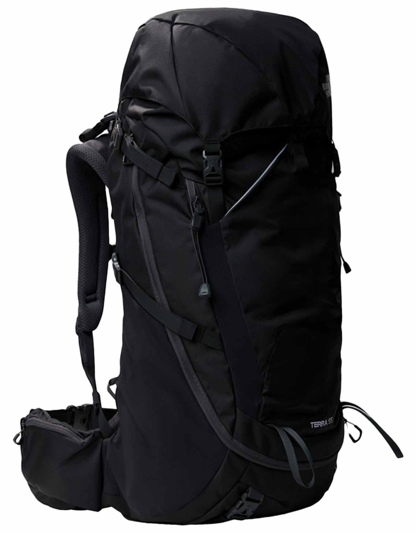 Sac à dos de trekking The North Face Terra 55 Black/Asphalt Grey, 55 L, avec suspension Optifit™, Dyno Lift System™ et ceinture ventrale moulée pour un confort stable sur plusieurs jours. Tissu DWR déperlant, accès double sens, poches et attaches bâtons.