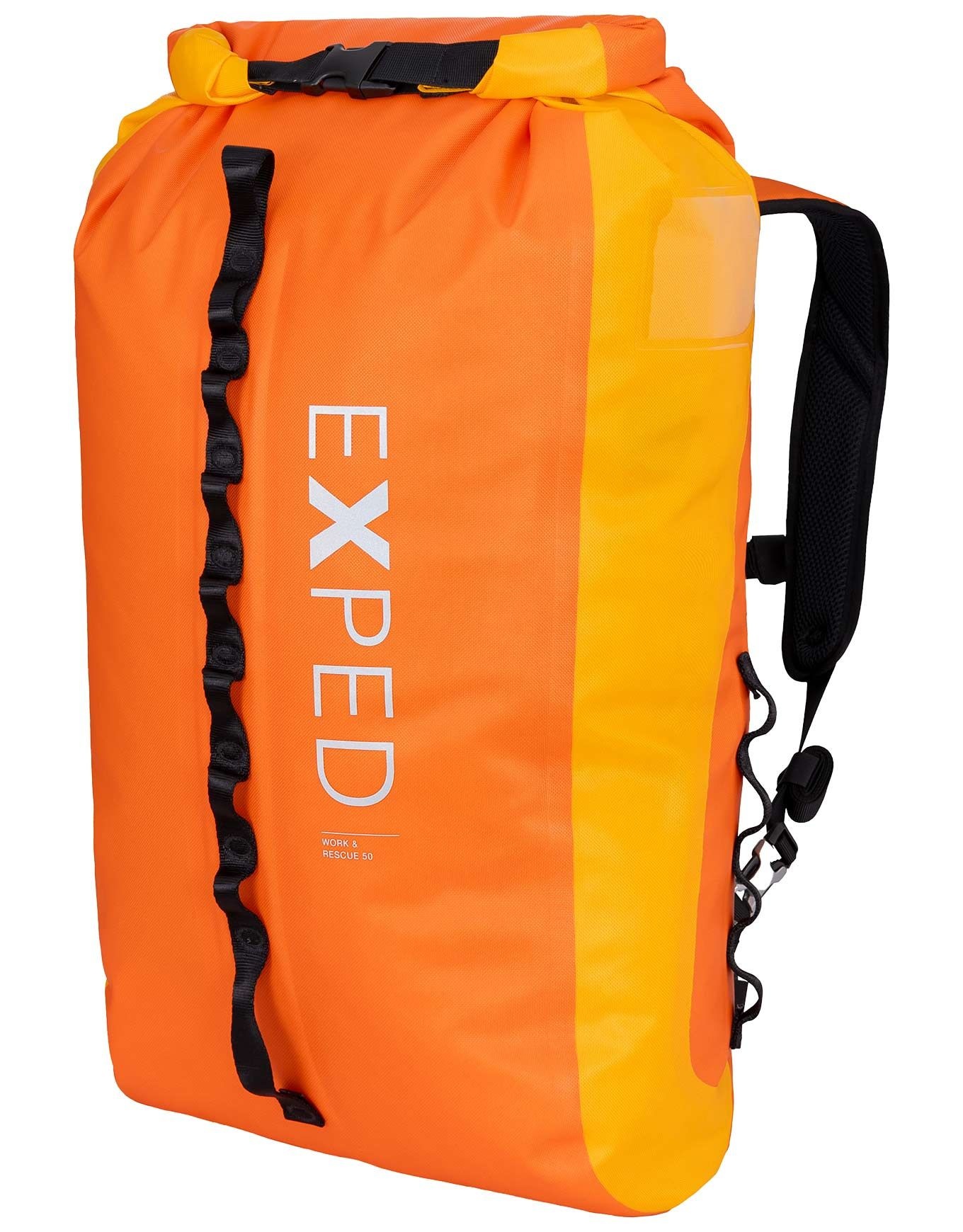 Sac à dos étanche Exped Torrent 50 Work and Rescue Dark Lava/Sunshine, imperméable 10 000 mm, compact et robuste pour professionnels outdoor. Compartiment ordinateur, bretelles et ceinture rembourrées amovibles, Daisy Chains et éléments réfléchissants intégrés.