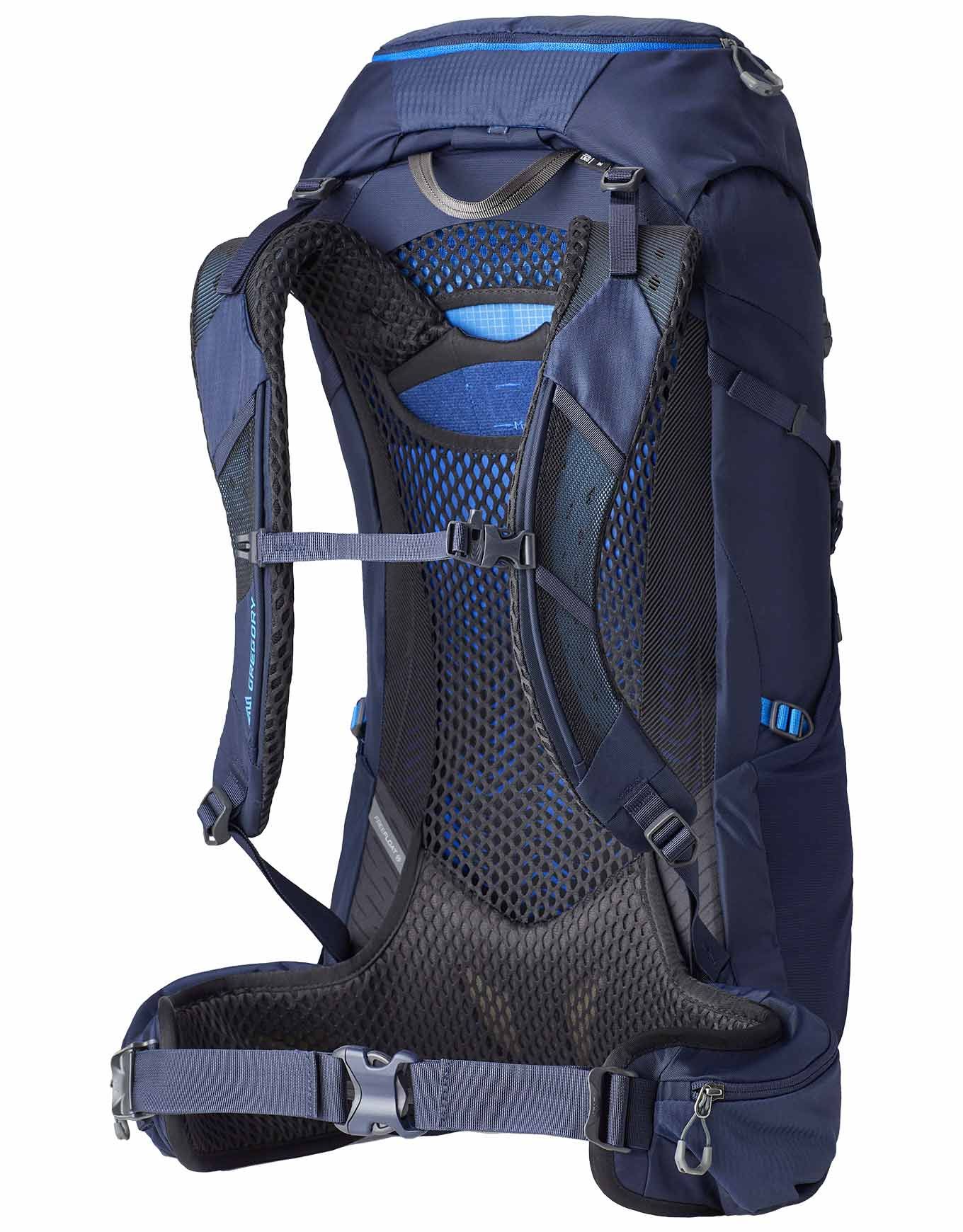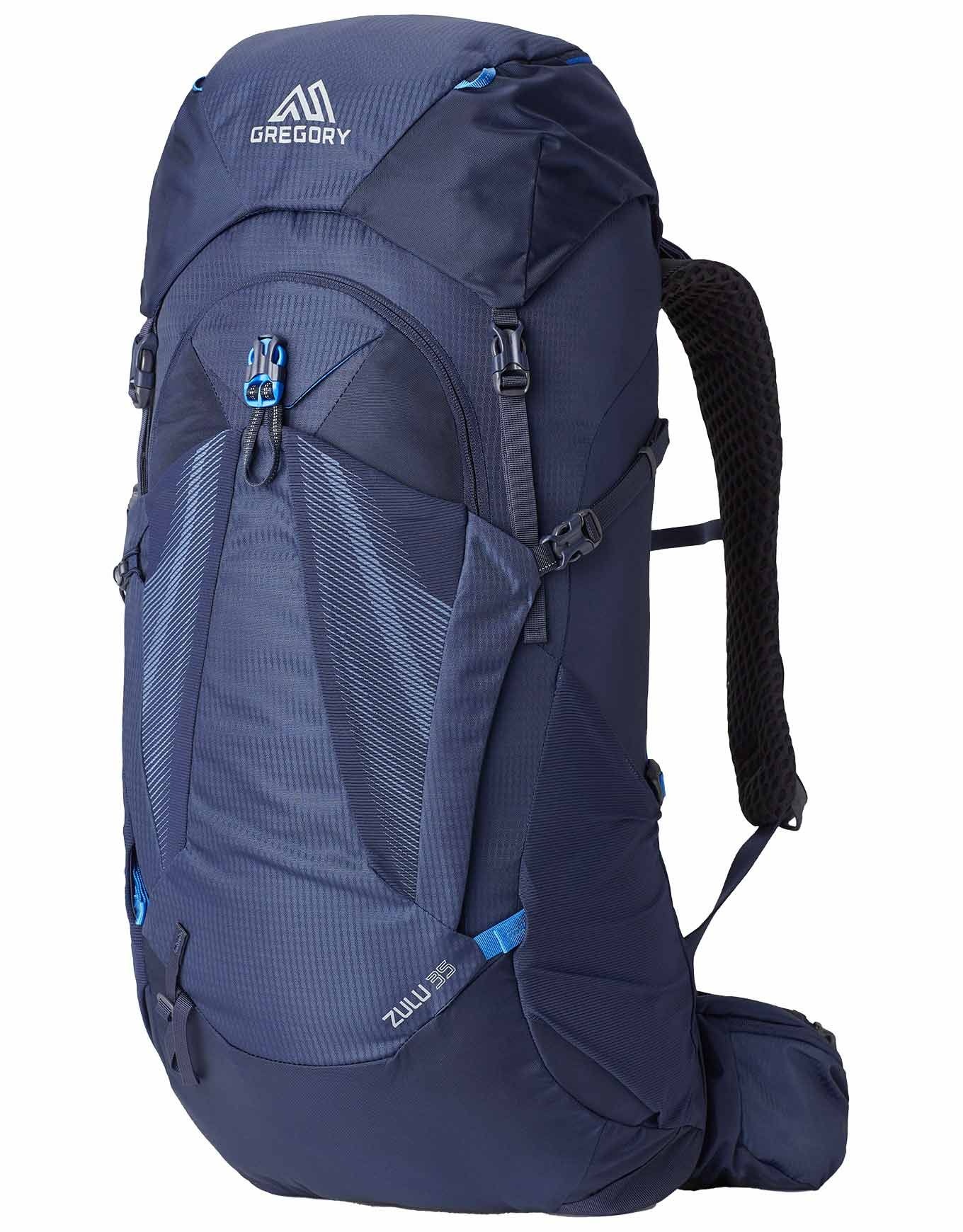 Sac à dos de randonnée Gregory Zulu 35 Rc Halo Blue, 35 L, panneau dorsal ventilé FreeFloat, bretelles matelassées respirantes, poches ceinture, fixation bâtons, housse pluie incluses, matériaux recyclés.