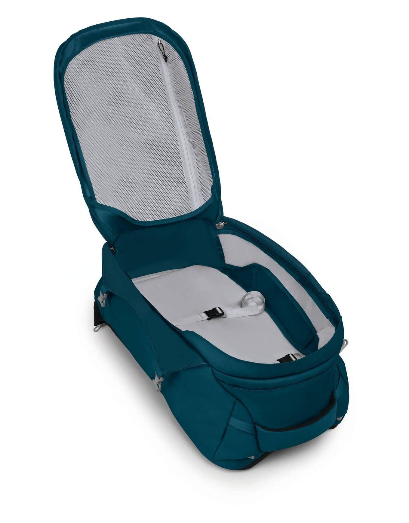 Sac à dos Osprey Fairview 40 Night Jungle Blue conçu pour femme, se porte en dos ou se remplit à plat comme une valise. Le panneau dorsal AirScape évacue la transpiration, la ceinture et bretelles ergonomiques assurent le confort en déplacement, tandis que ses nombreuses poches et fourreau ordinateur organisent efficacement les affaires pour le voyage ou le week-end.