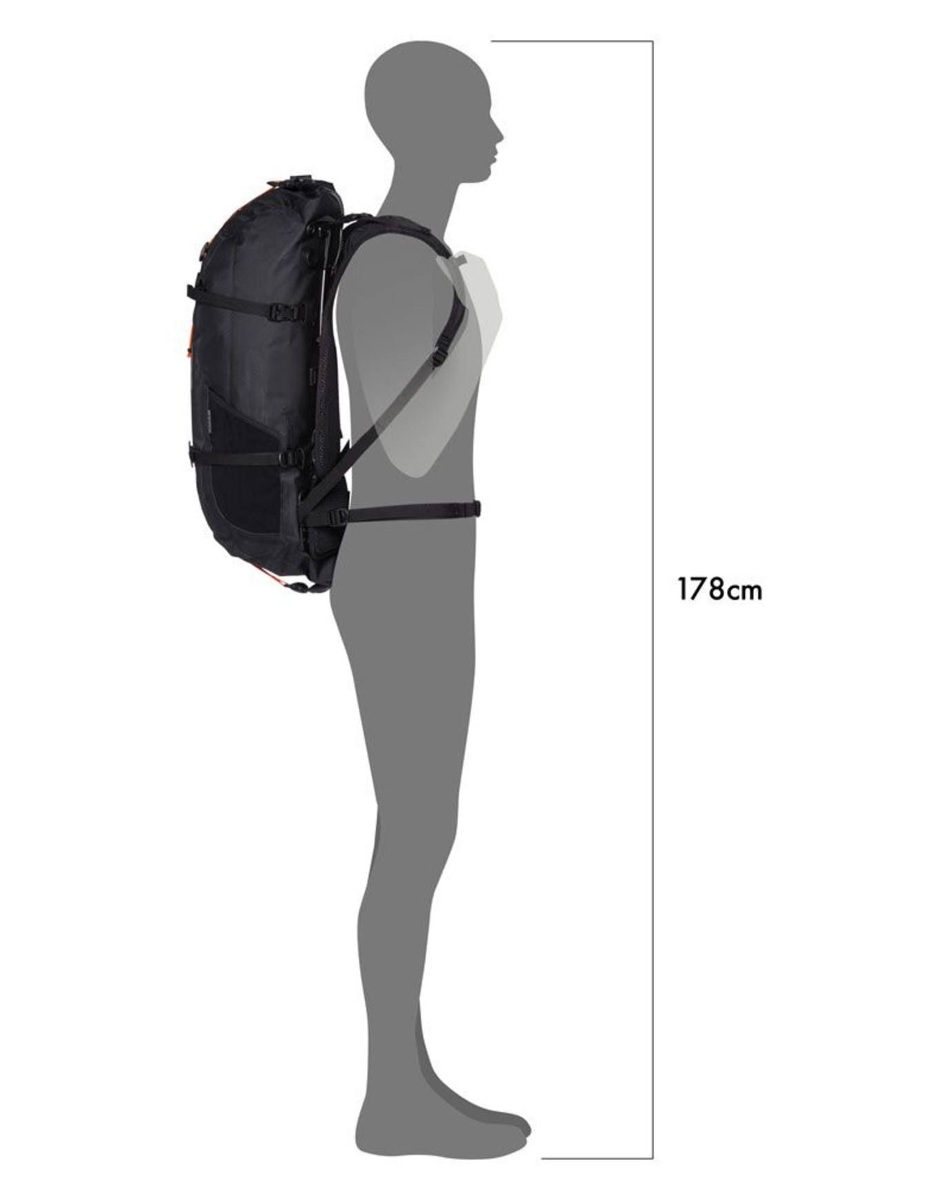L’intérieur accueille 4 compartiments de rangement. À l’extérieur, des Daisy Chains sont positionnées à l’avant, complétées par des sangles de compression amovibles et des poches en filet. La compatibilité avec divers accessoires vendus à part, tels que le système d’hydratation Atrack ou le kit de fixation pour casque, caractérise également ce modèle.