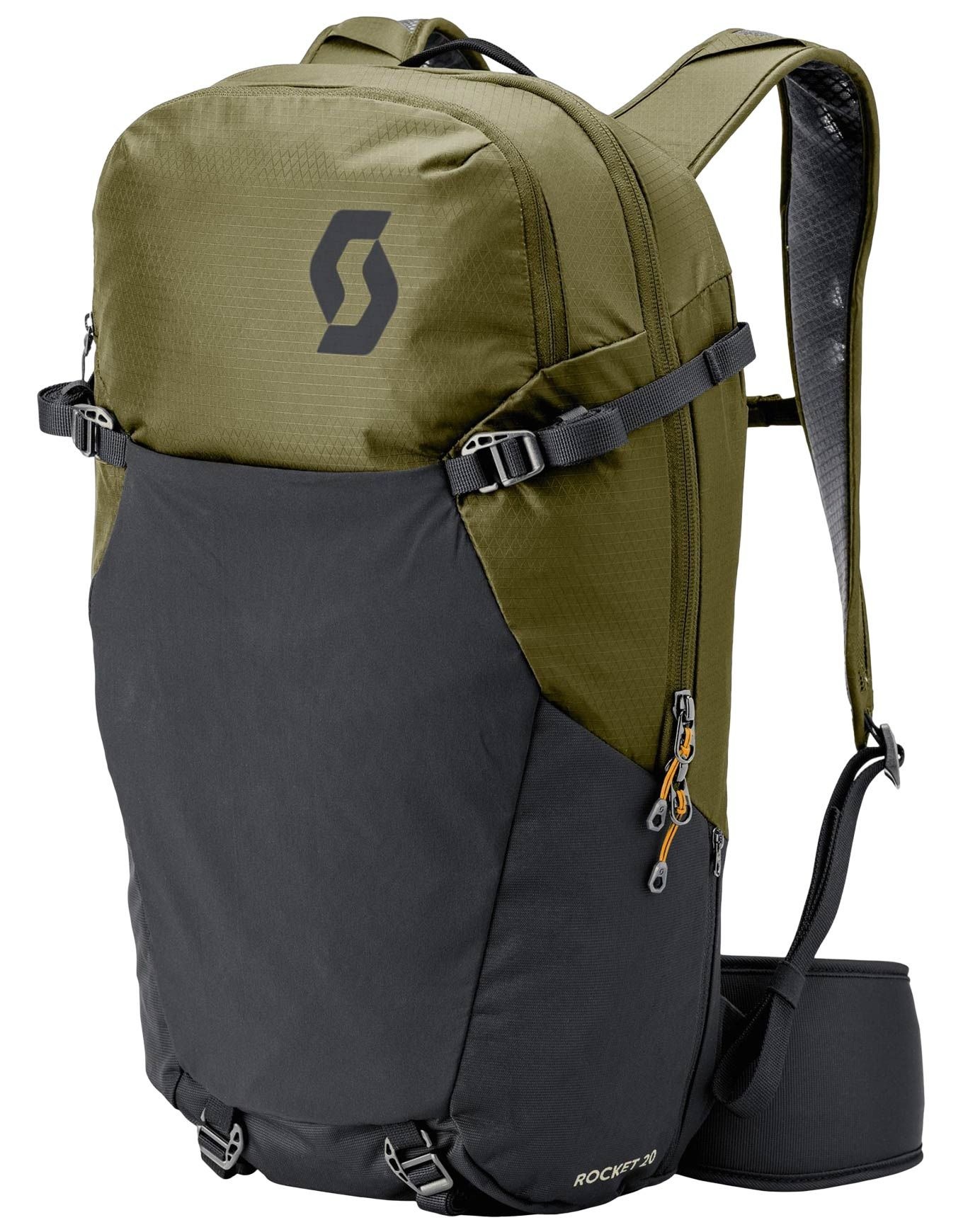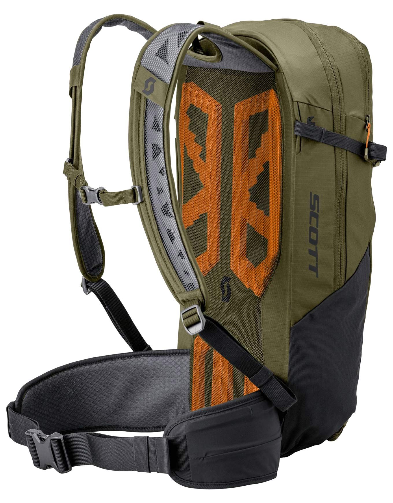 Sac à dos VTT Scott Trail Rocket 20 Fir Green/Black, 20 L avec poche d’hydratation, fixation protections, porte-casque XC et emplacement batterie VAE pour sorties longue distance.