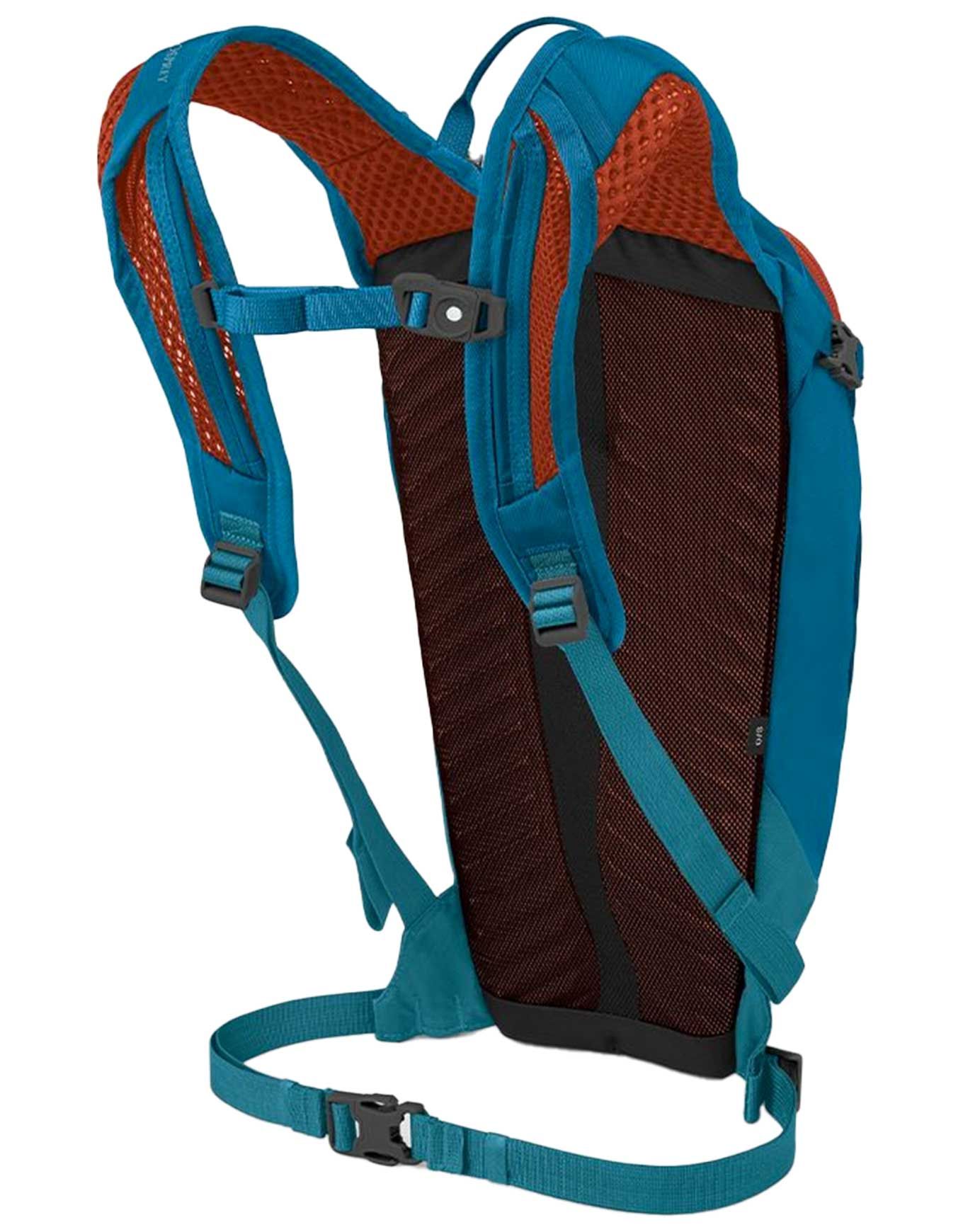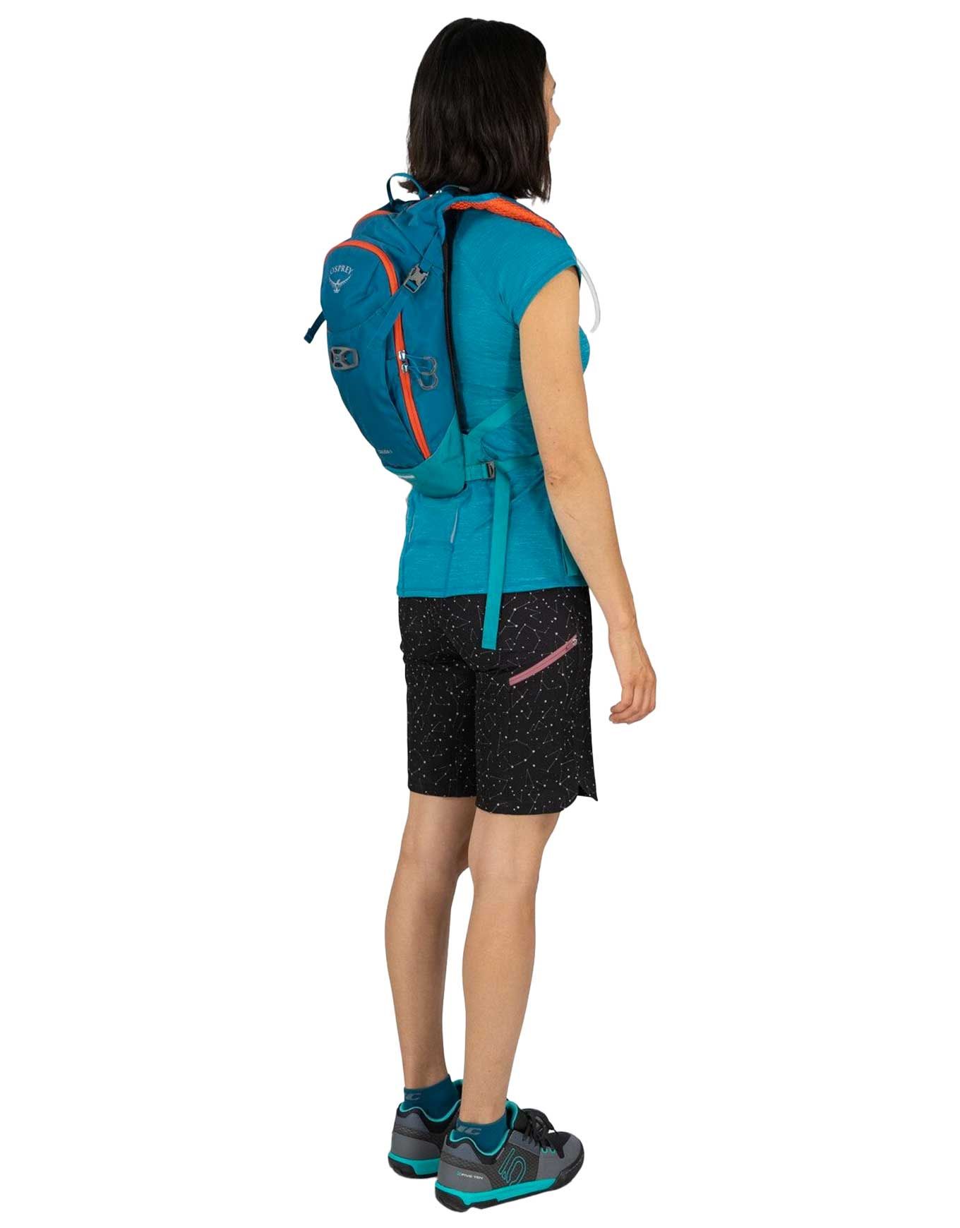 Sac à dos VTT femme Osprey Salida 8 Waterfront Blue, 8 L, bretelles et ceinture ergonomiques, réservoir Hydraulics™ LT 2,5 L inclus, porte-casque LidLock, poches outils et lunettes.