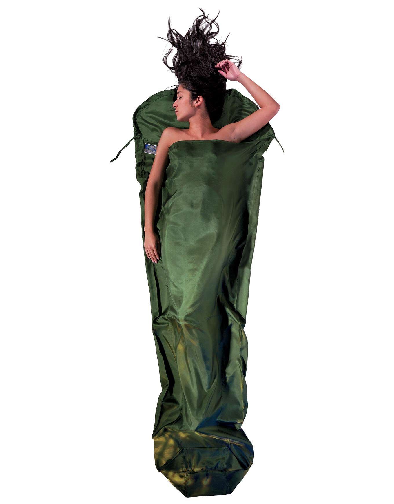 Le drap de sac Soie Sarcophage Dark Olive Green de Cocoon, en soie thermorégulatrice, protège votre sac de couchage toute l’année avec légèreté et compacité.