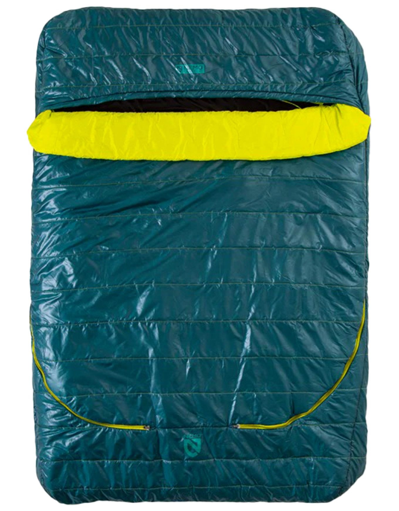 Sac de couchage double Nemo Jazz Duo, conçu pour le camping, accueille deux matelas de 64 cm ou un grand de 127 cm. Température limite de confort -7 °C, rabat antifroid, drap amovible ultra-doux et fermetures bilatérales pour combiner plusieurs sacs.