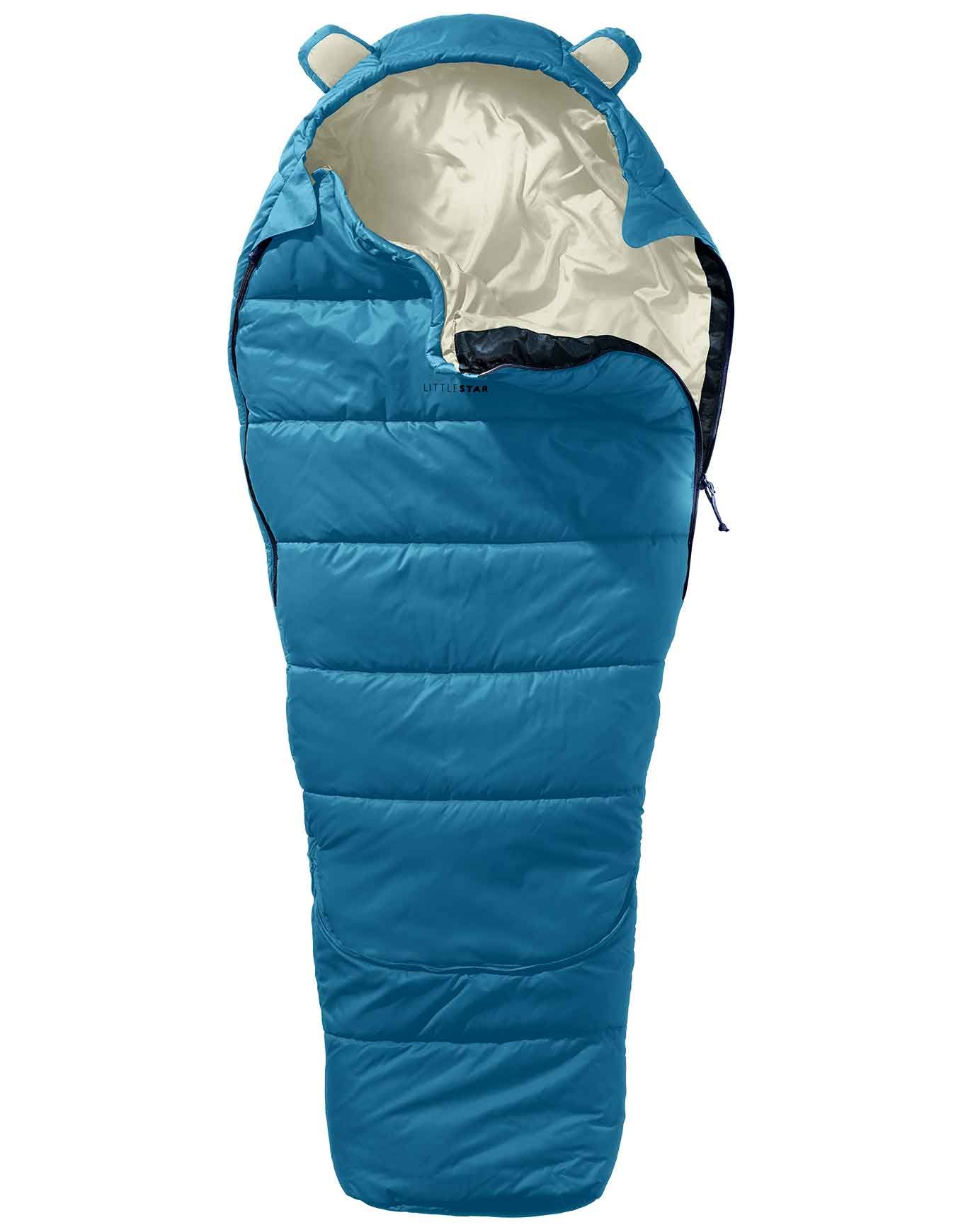 Sac de couchage enfant Deuter Little Star Wave Bone extensible, doublure ultra-douce, ouvertures latérales et patte anti-pincement pour un couchage sûr au camping ou sous la tente.