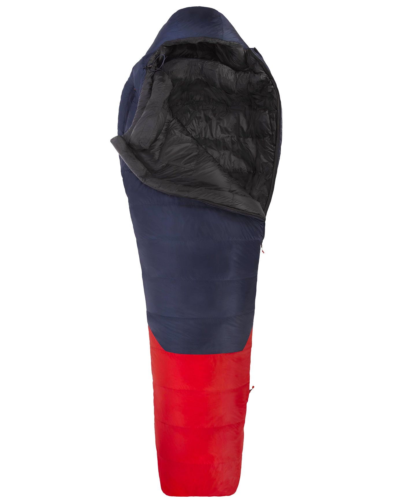 La coupe sarcophage offre un confort optimisé par un espace accru au niveau des épaules et du buste. Grâce au Bivy Warm System, la sortie du bras droit est possible sans perte de chaleur. Une collerette isolante, réglable par cordon, est intégrée, de même qu’un zip bidirectionnel permettant d’ajuster la ventilation selon les conditions rencontrées.
