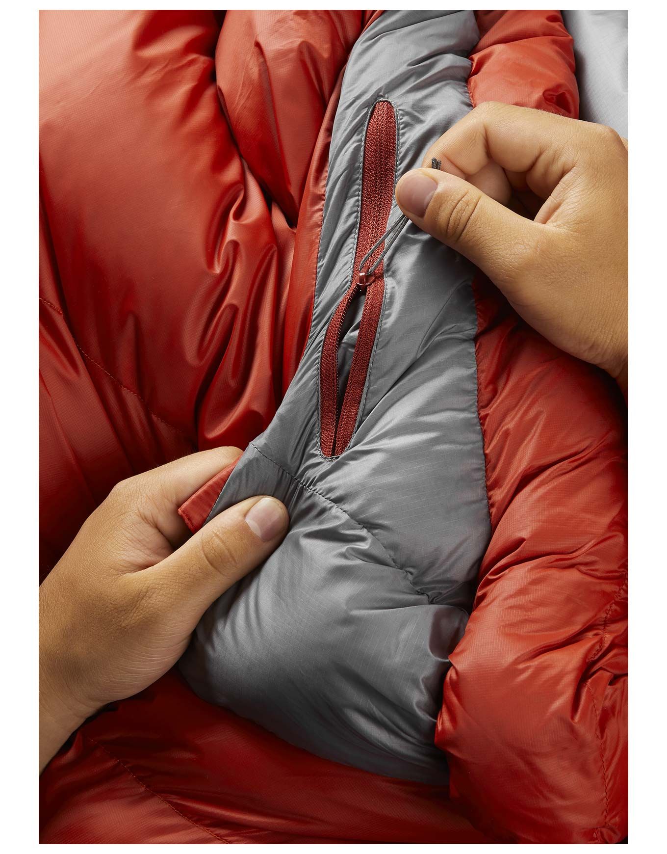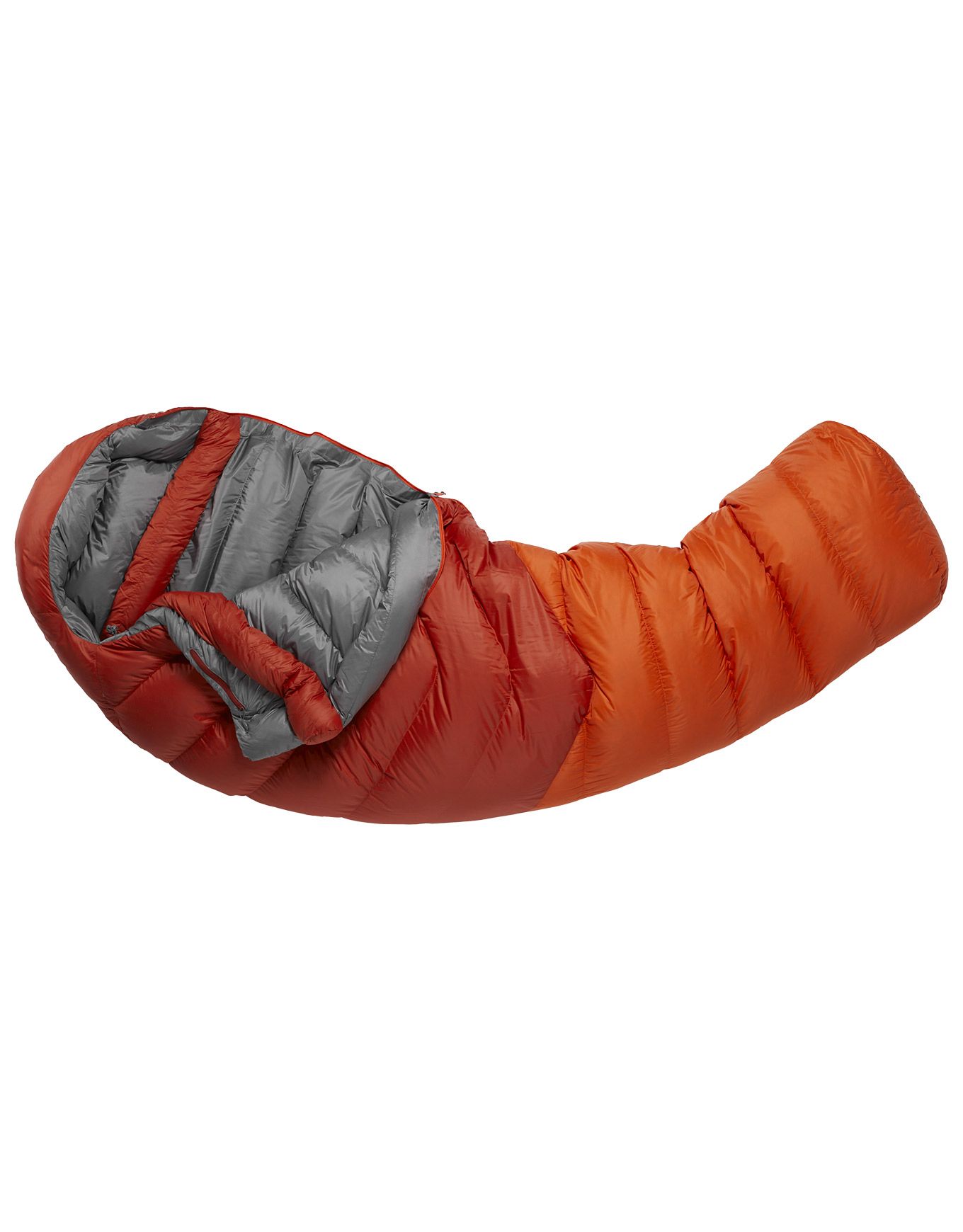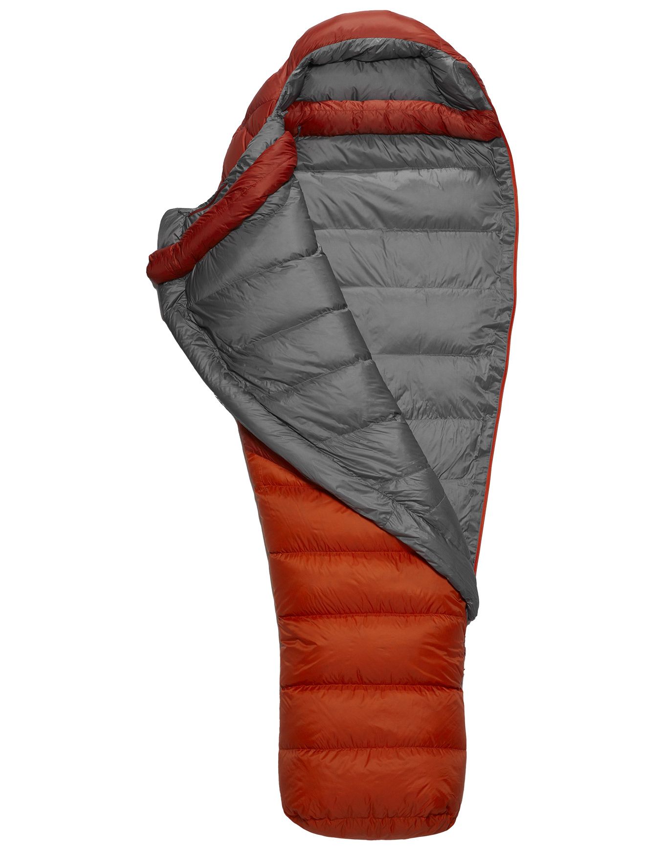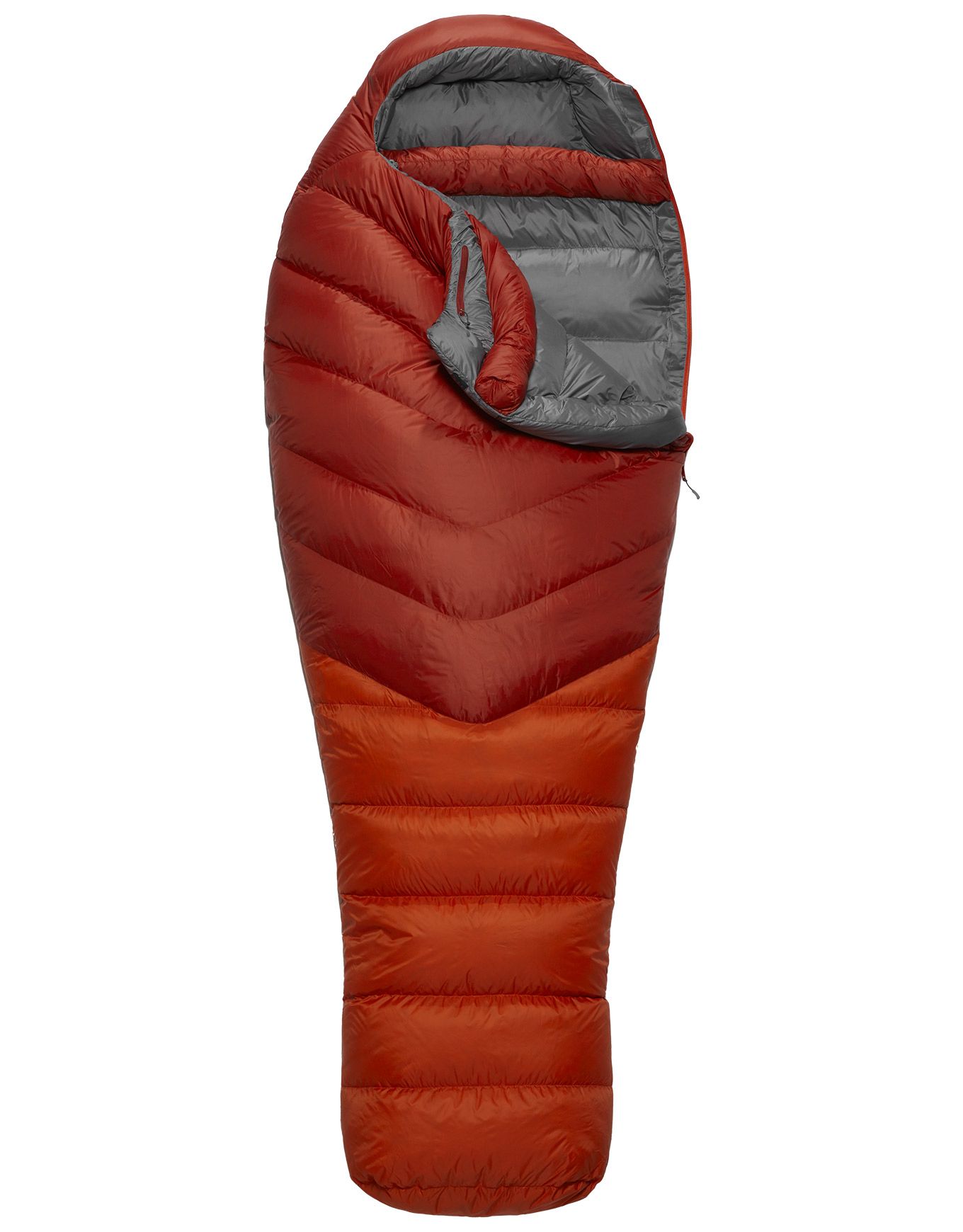 Rab Alpine 600 Red Clay, sac de couchage 3 saisons en duvet 650 CUIN DWR, tient jusqu’à -9°C. Tissu Pertex® Quantum 20D coupe-vent, doublure nylon recyclé, col 3D et footbox inclinée pour isolation optimale.