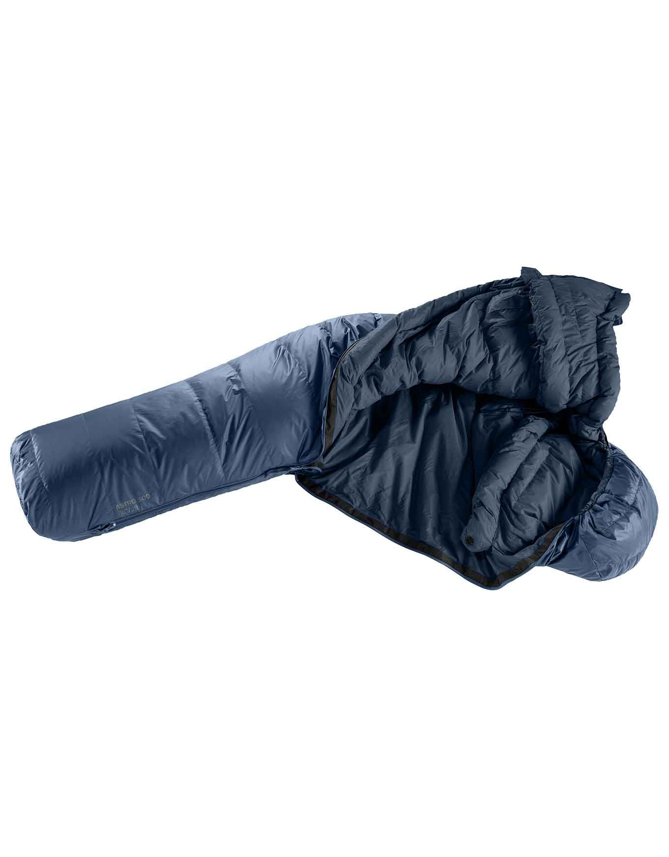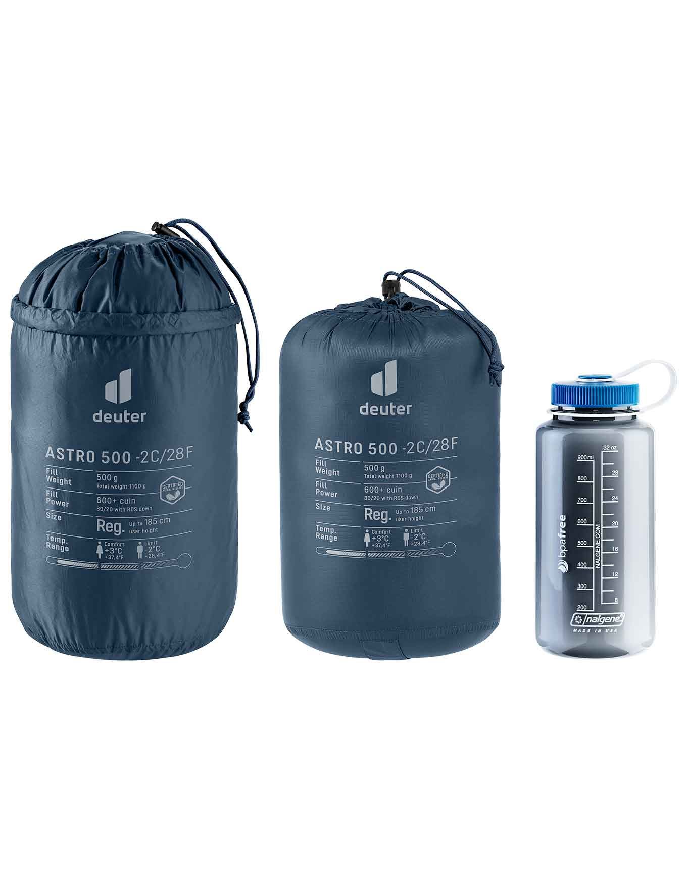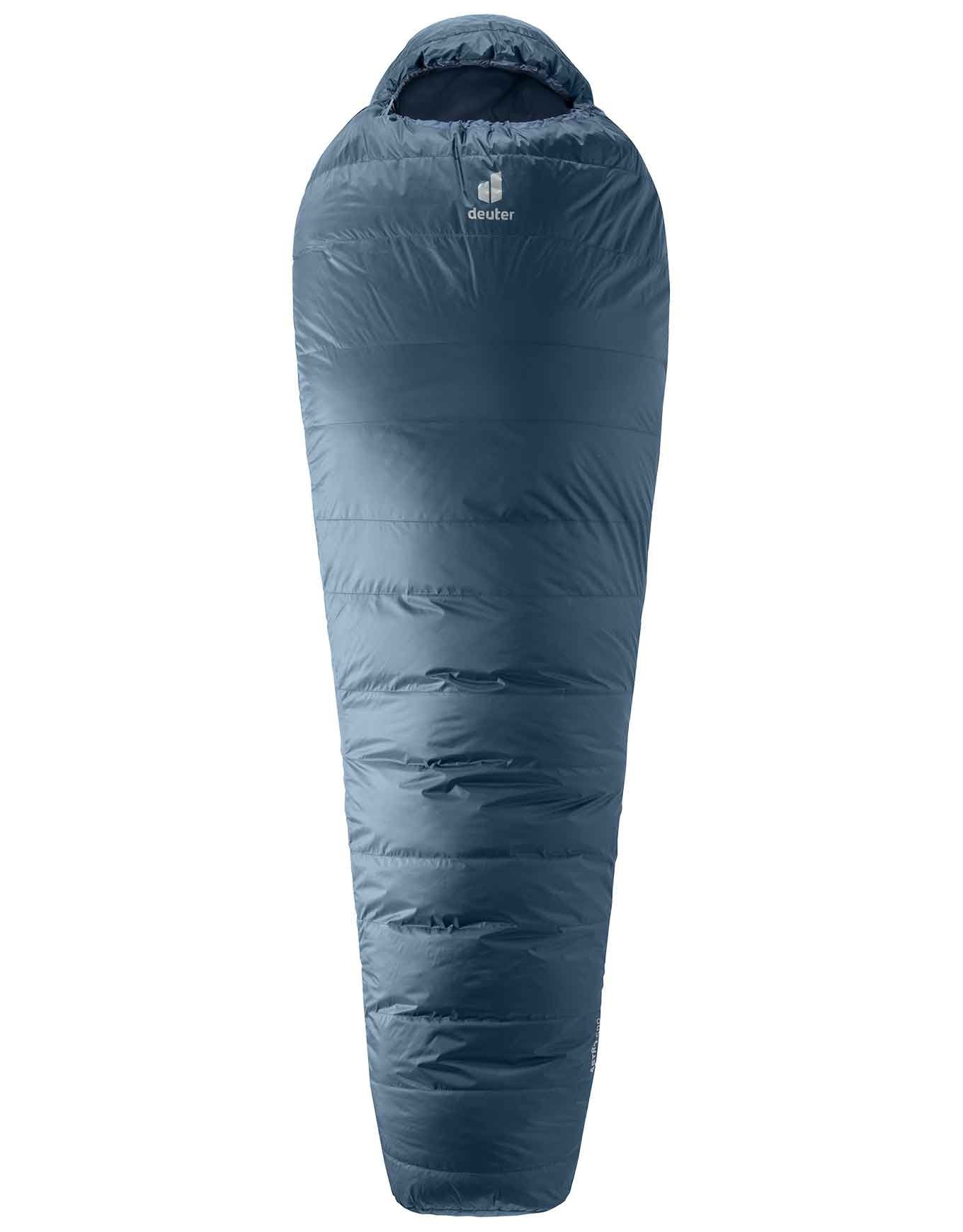 Le sac de couchage Deuter Astro 500 Marine Ink offre un duvet synthétique hydrofuge et coupe-vent en nylon ripstop, compressible et certifié Bluesign, avec chambres trapézoïdales, capuche ergonomique et poche interne pour trekker léger par temps froid.