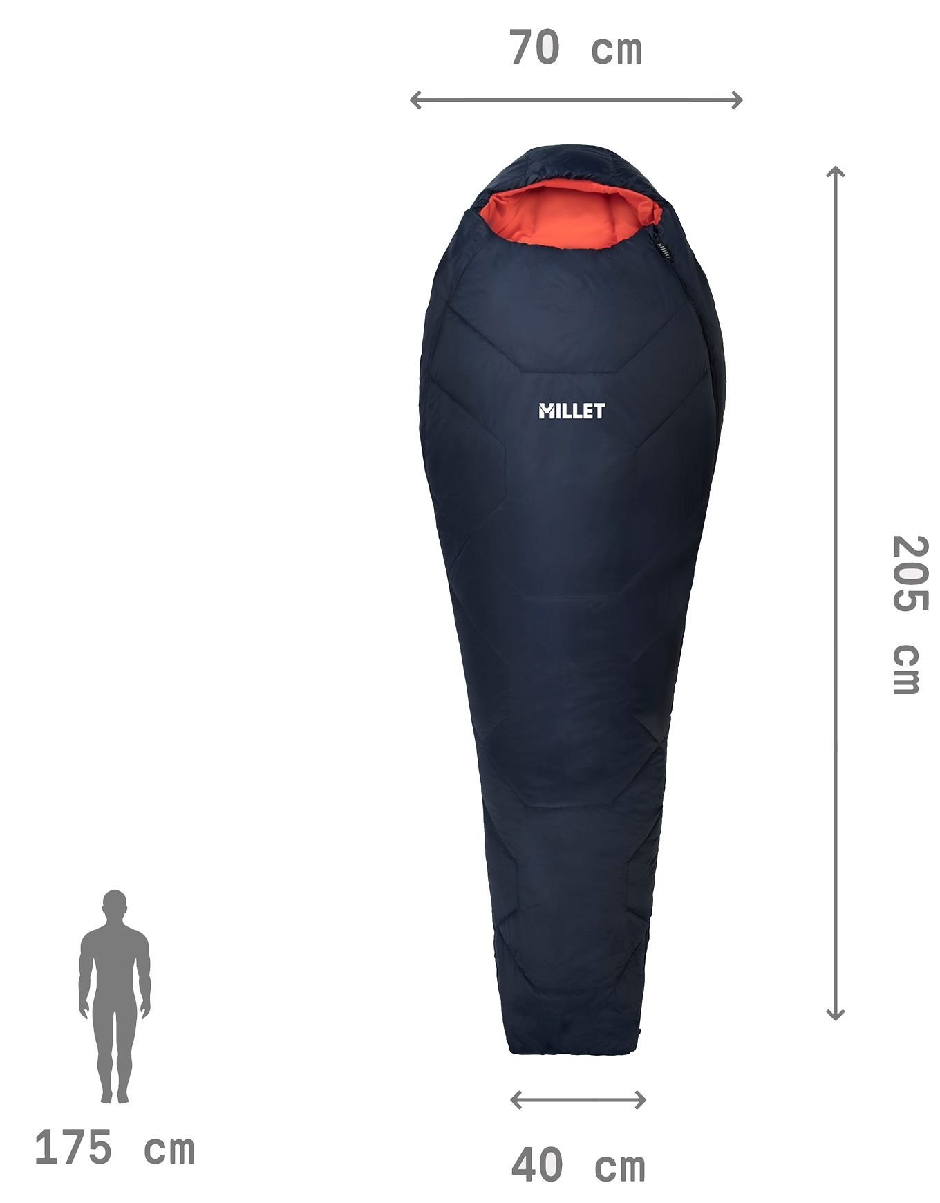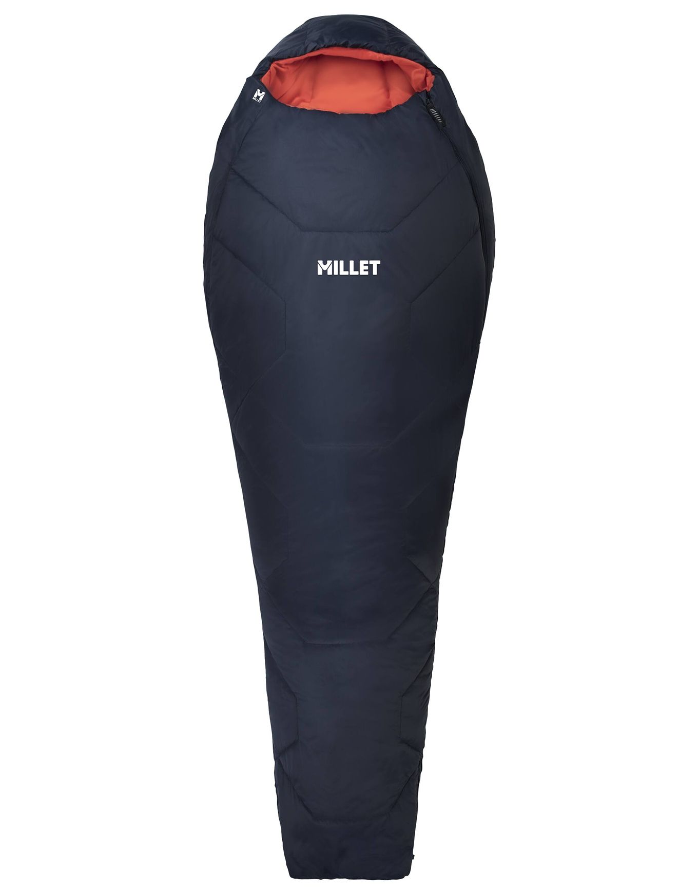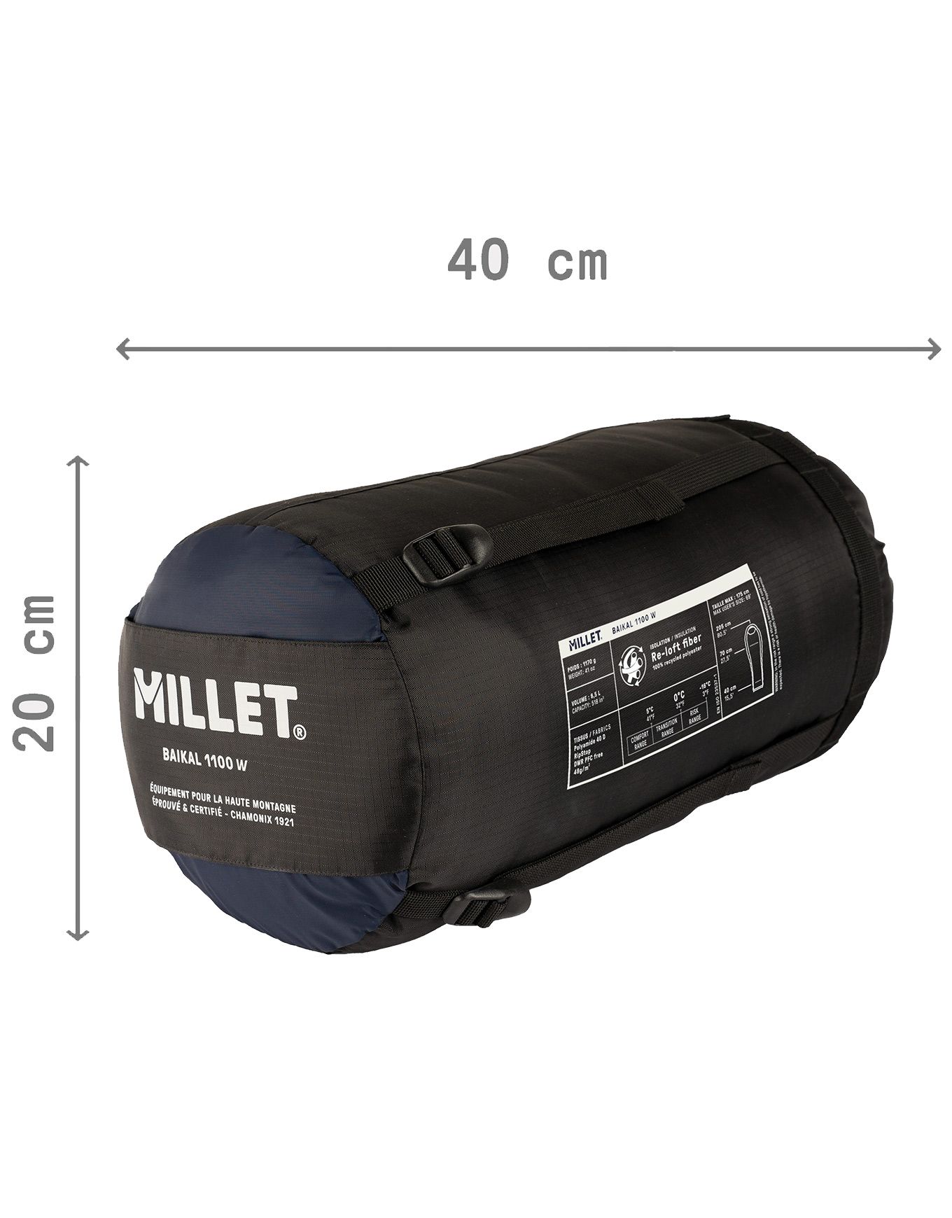 Sac de couchage Millet Baikal 1100 W Saphir pour femme, confort 5 °C, isolation synthétique hydrophobe en ouate recyclée, ergonomie adaptée, doublure micropolaire tête et pieds, zip 3/4, compressible.