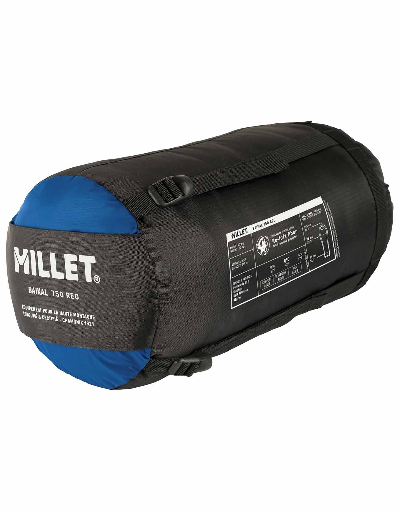 Millet Baikal 750 Sky Diver, sac de couchage 2 saisons léger pour homme, confort 10-6°C, isolation synthétique hydrophobe recyclée, capuche ajustable, jumelable, sac de compression inclus.