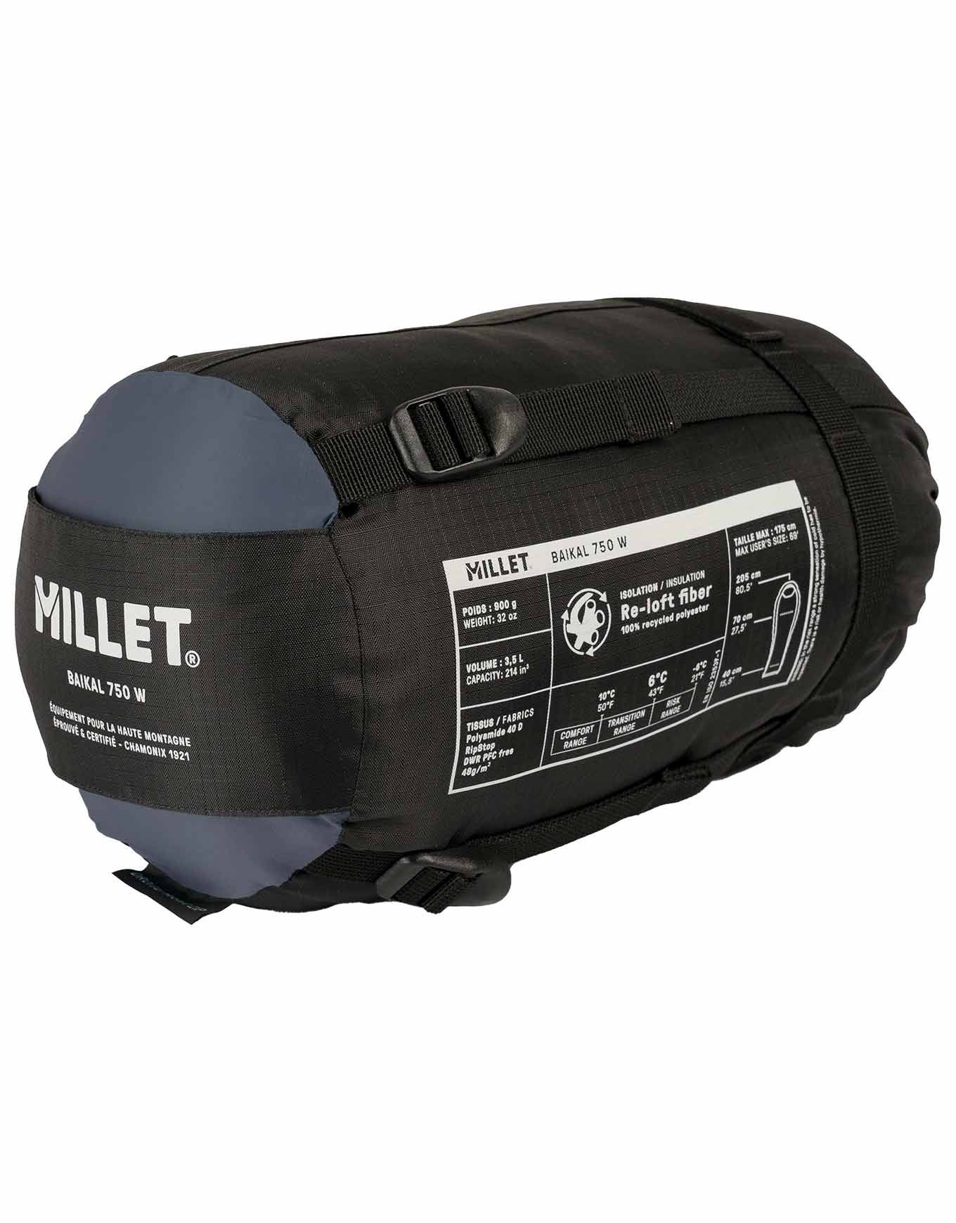Sac de couchage Millet Baikal 750 W Saphir, 2 saisons, 750 g, confort 10 °C/6 °C, isolation synthétique recyclée hydrophobe, coupe femme, jumelable, compression et capuche ajustée inclus.