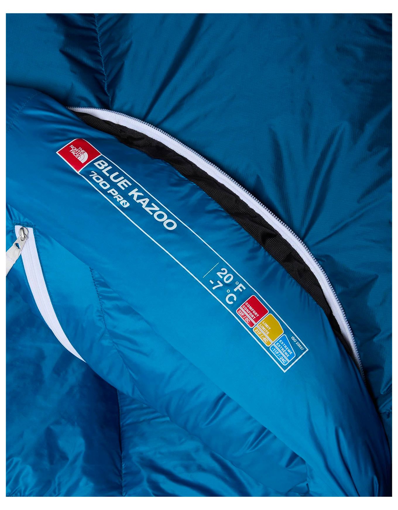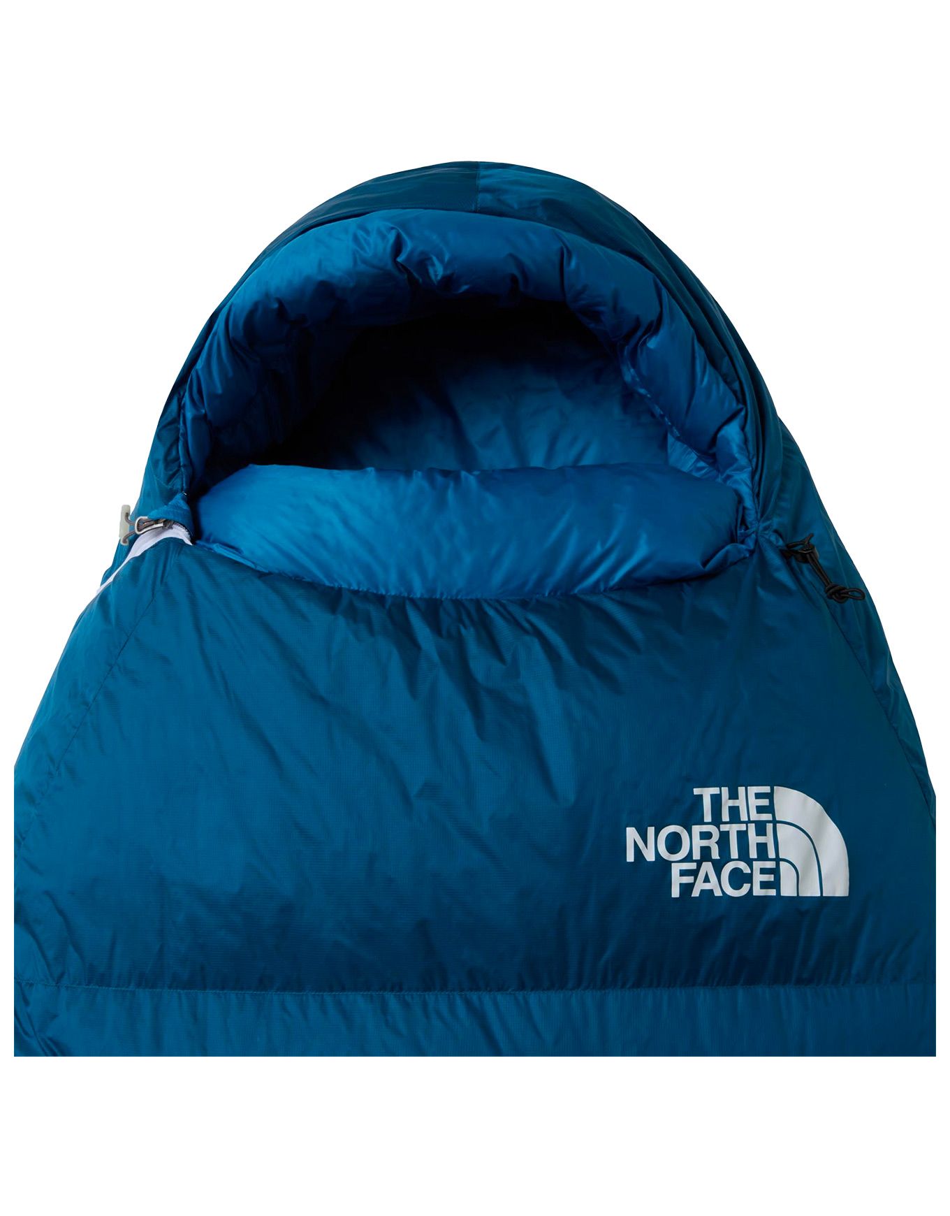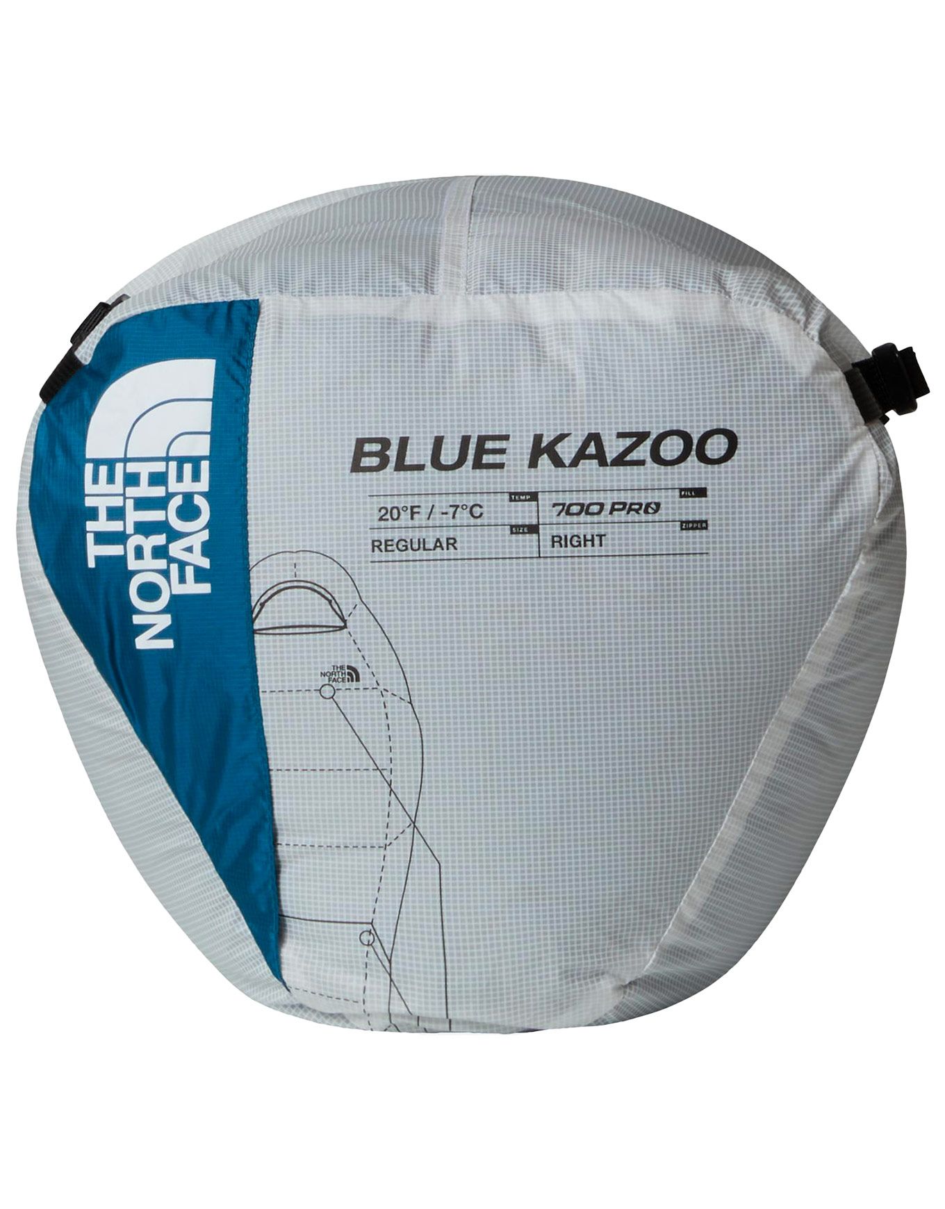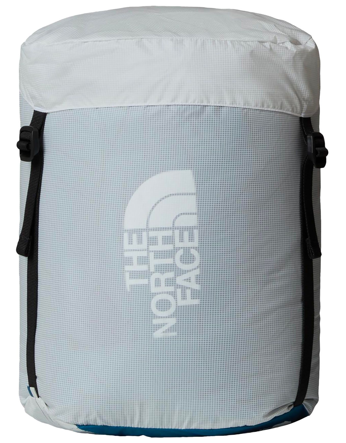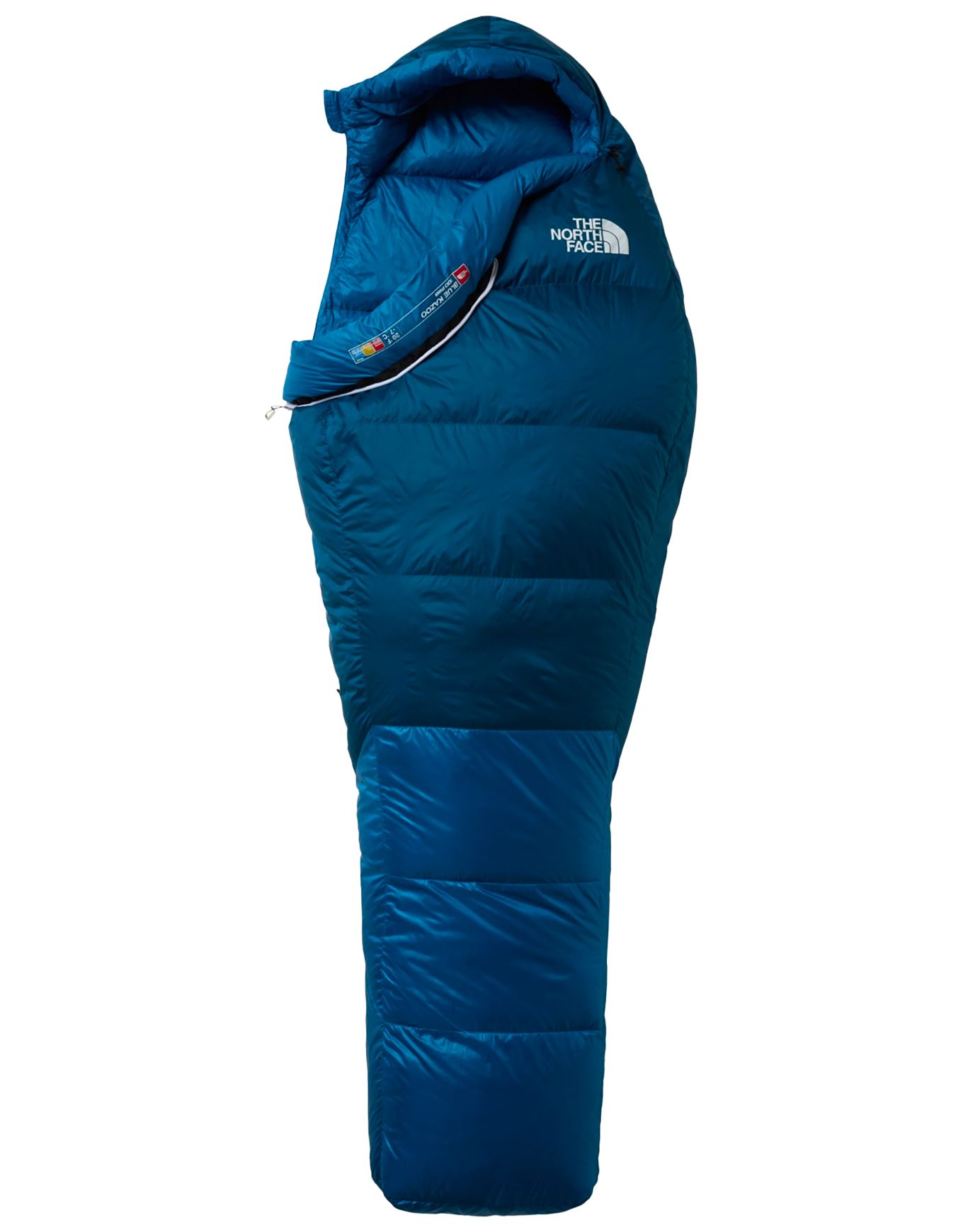 The North Face Blue Kazoo Banff Blue est un sac de couchage ultra-léger en duvet recyclé haut gonflant, déperlant et compressible, avec capuche isolée et fermeture zippée pour trekking par temps froid.