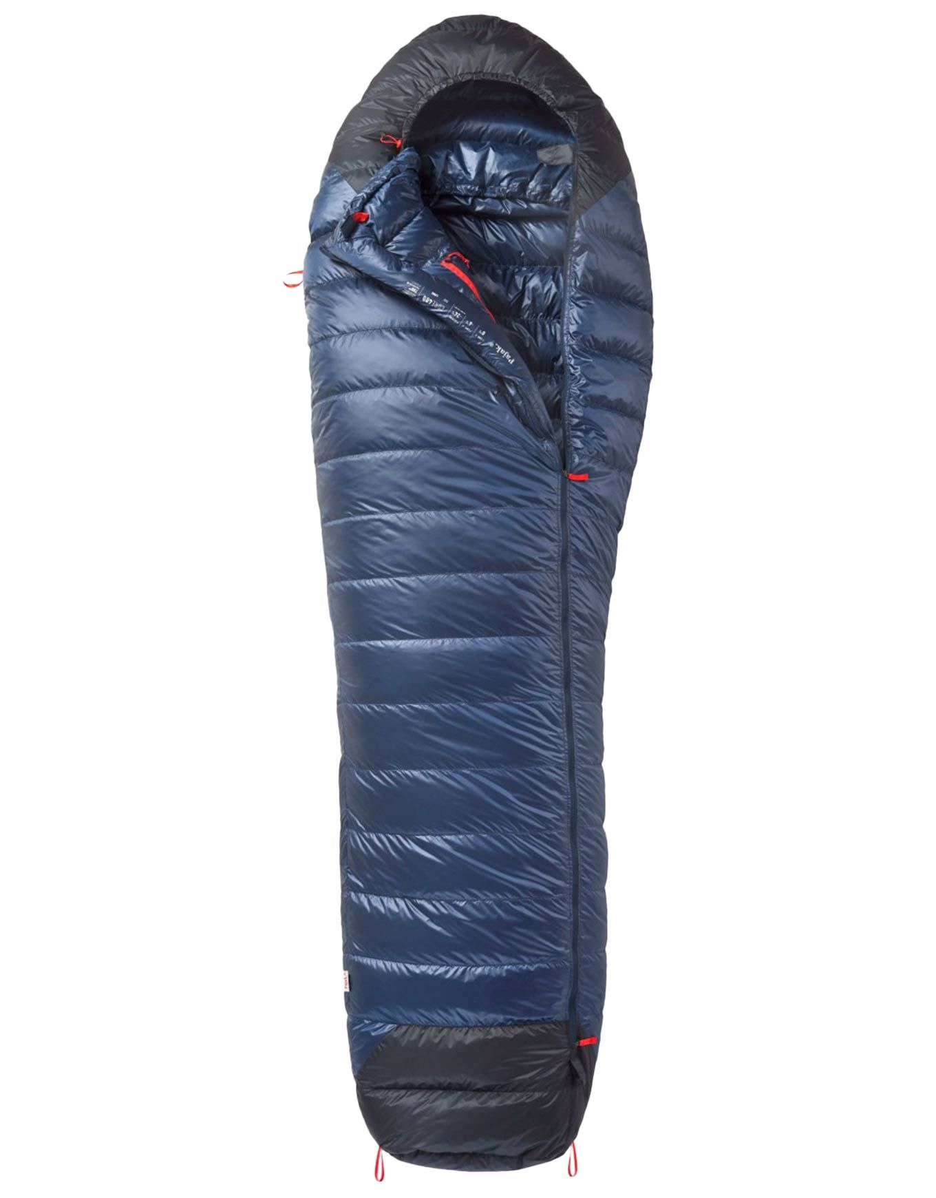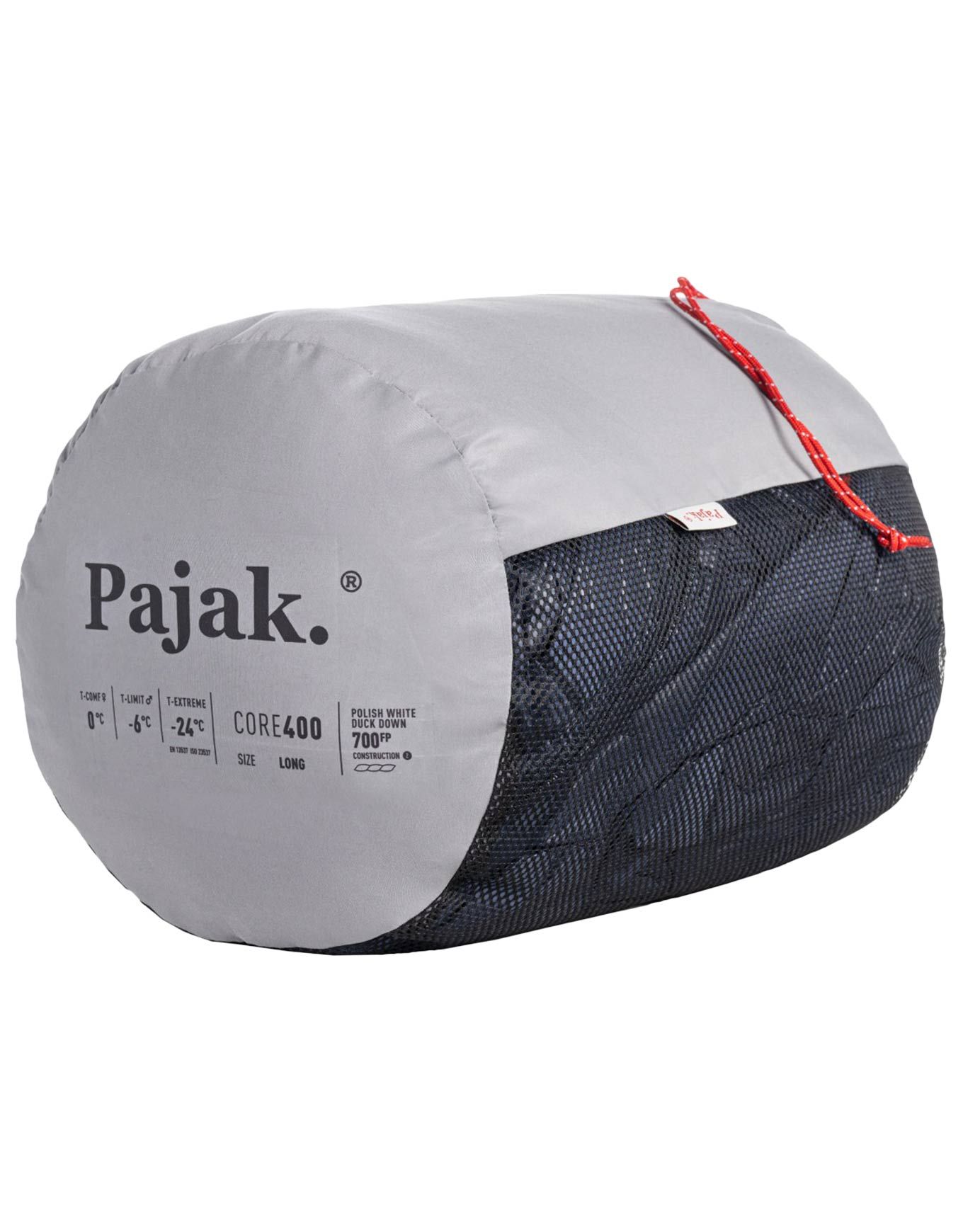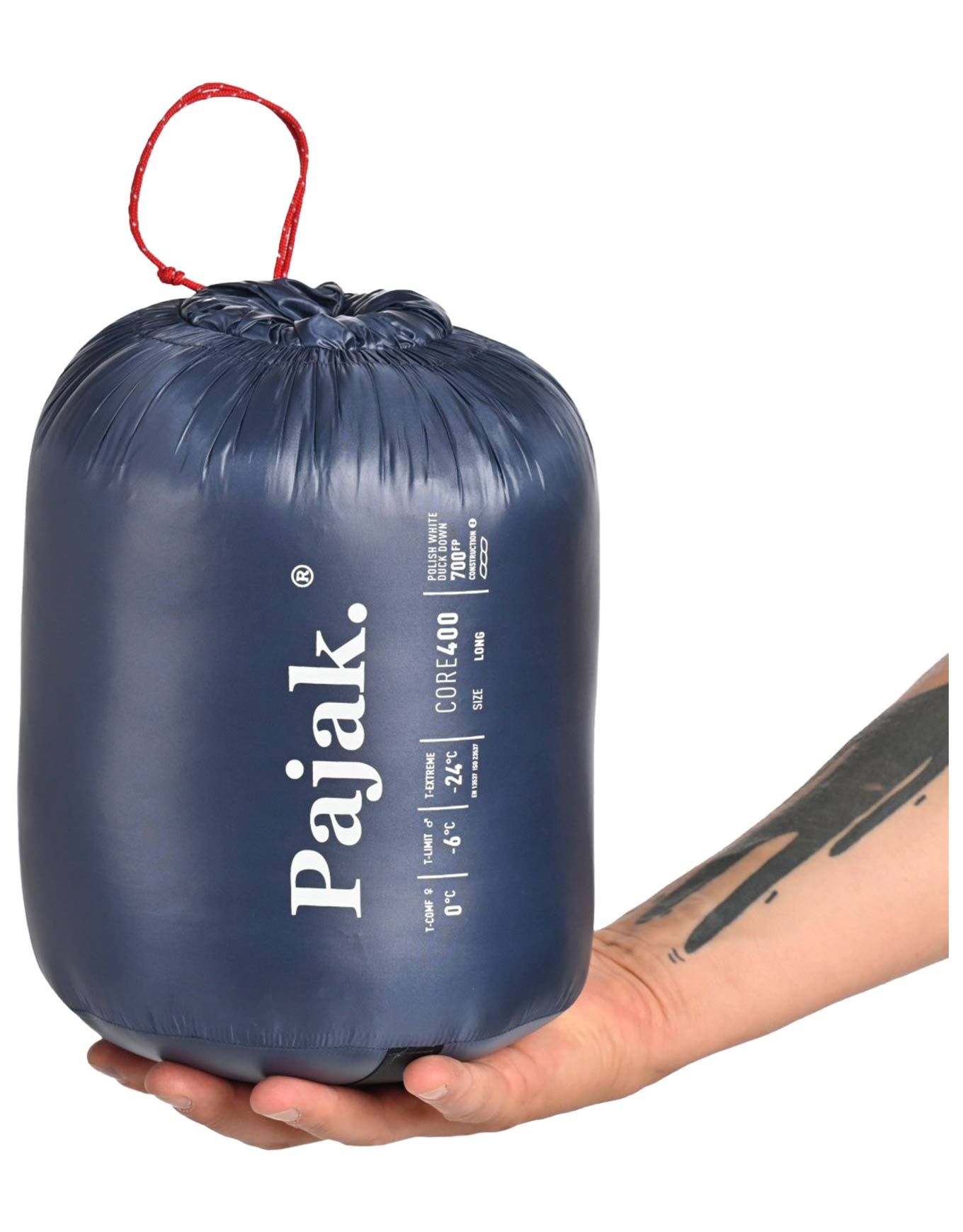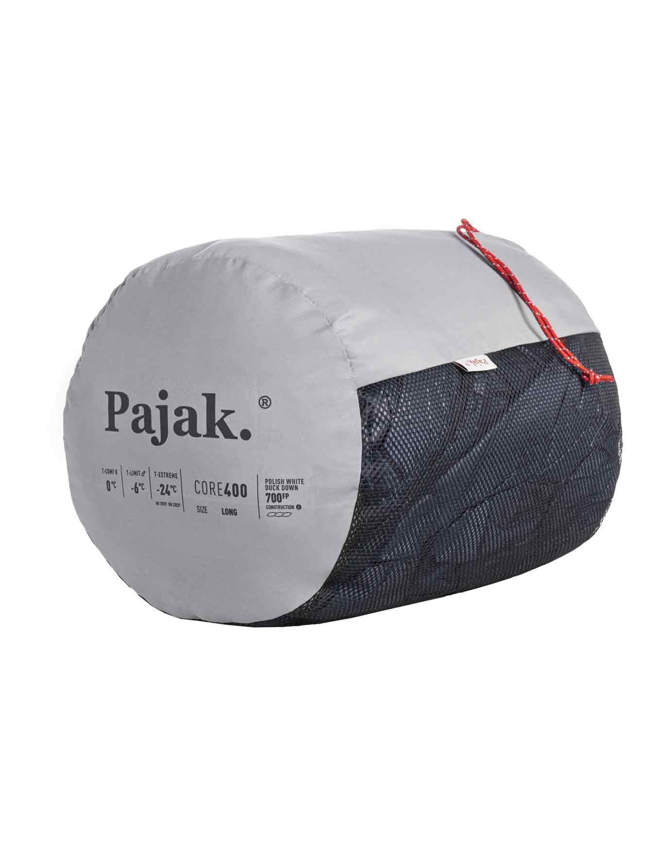 Sac de couchage Pajak Core 400 Navy, garni de 700 cuin de duvet de canard, pour trek printemps-automne. Toray Airstatic contrôle l’air, traitement DWR repousse l’humidité, compacité et renforts tête-pieds inclus.
