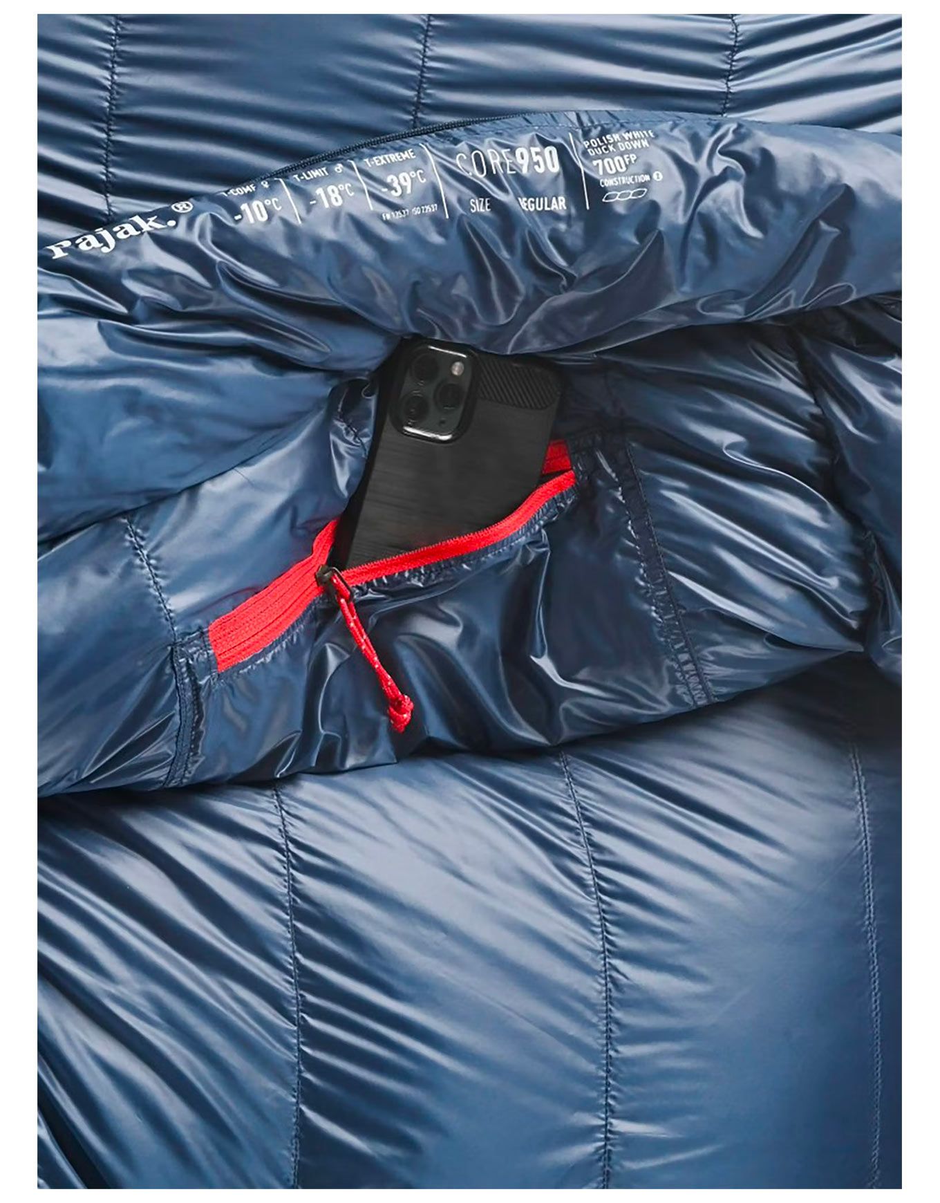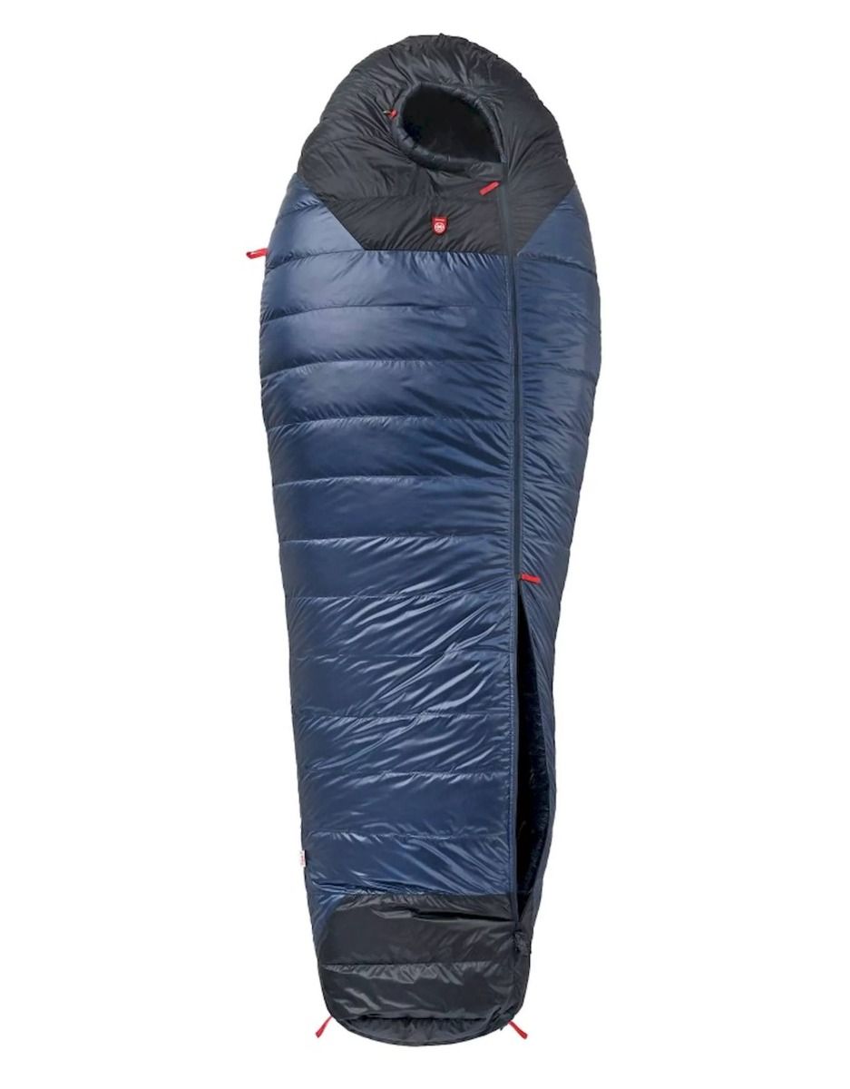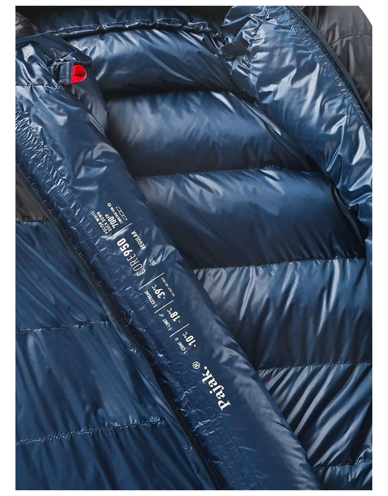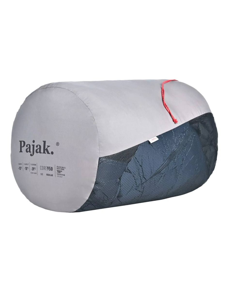 Sac de couchage Pajak Core 950 Navy, garni de duvet 700 cuin, tissu Toray Airstatic et DWR pour isolation, légèreté et compressibilité extrêmes en bivouac hivernal.