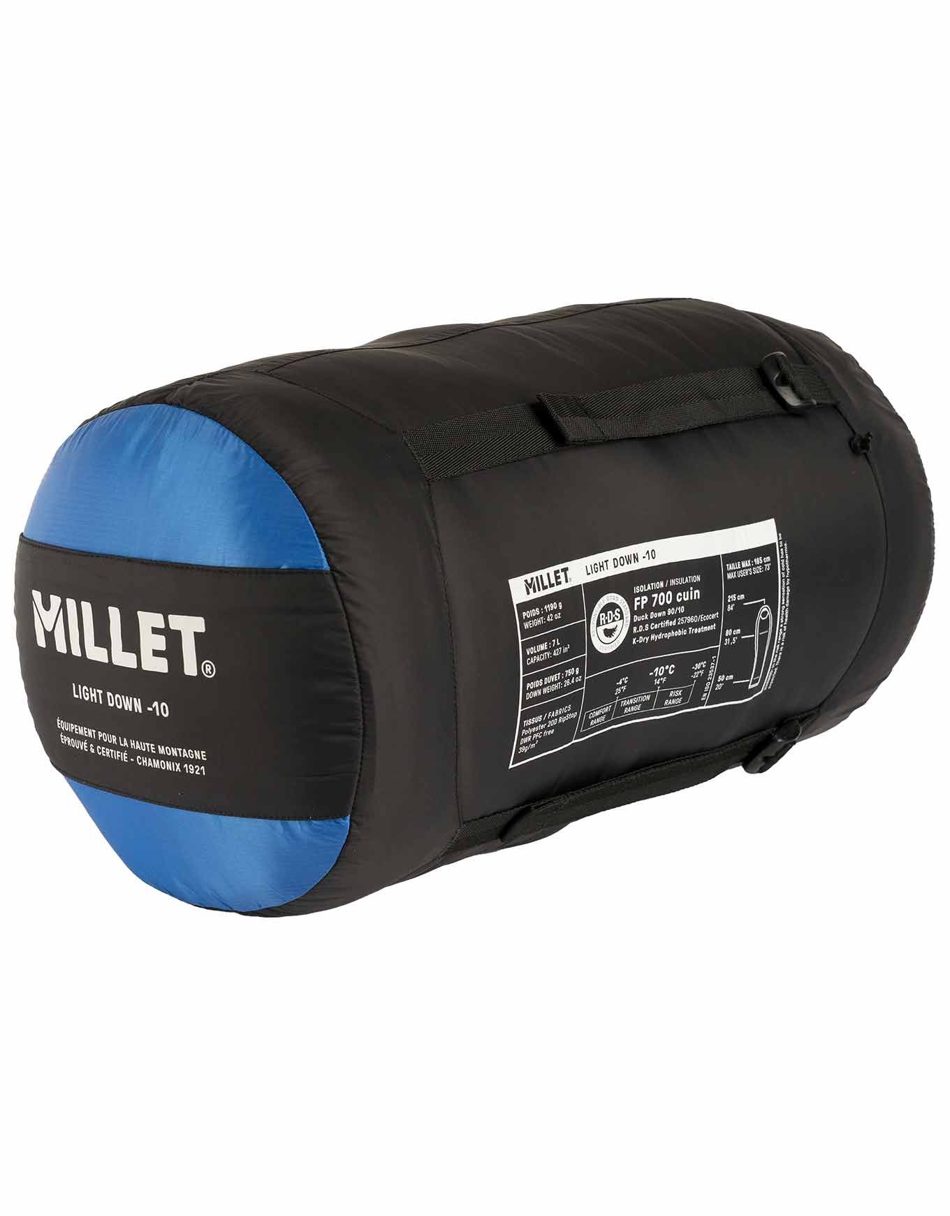 Sac de couchage Millet Light Down -10 Abyss en plume de canard K Dry Down, confort -4°C, compression optimale pour trekking.