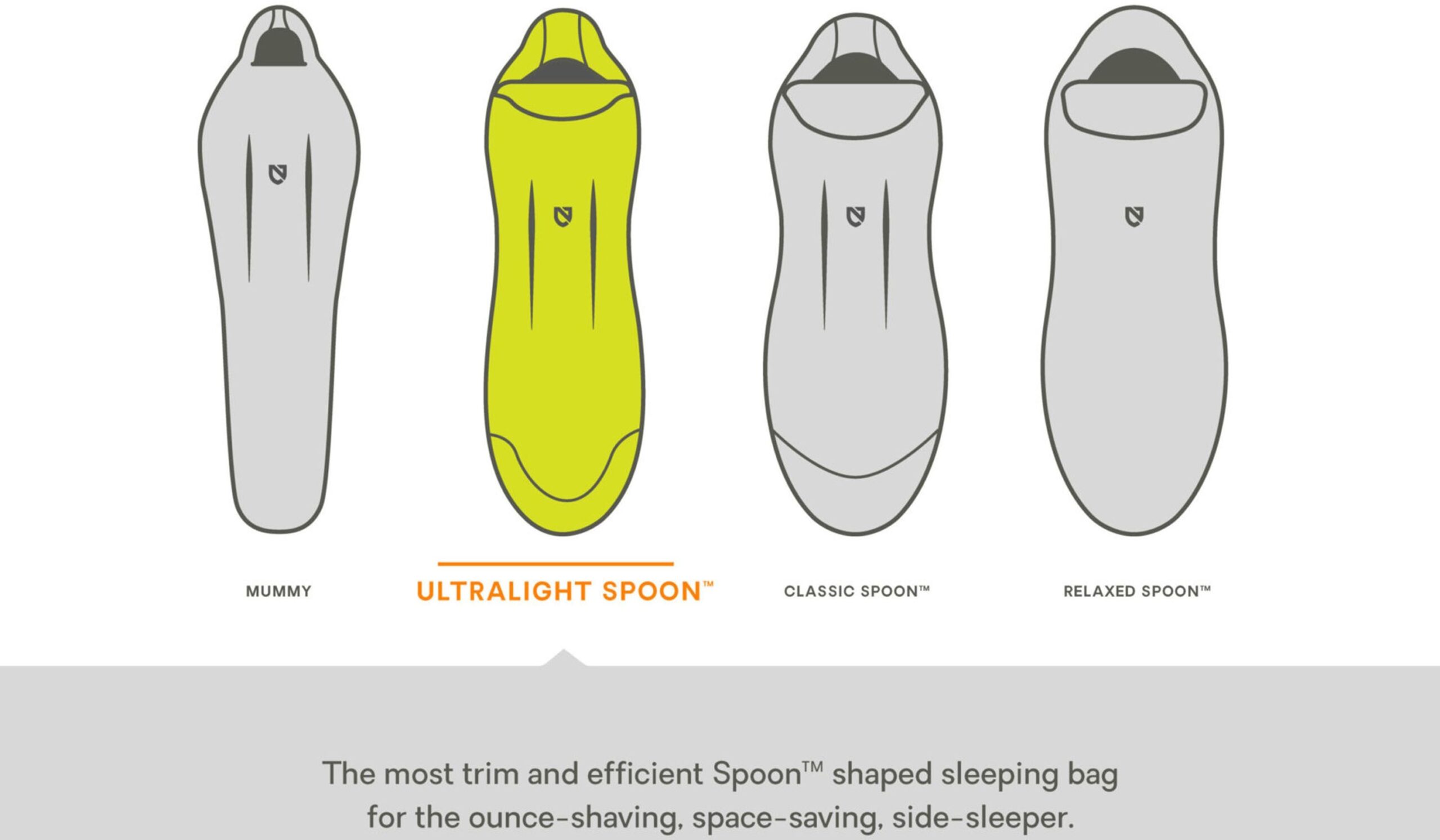 - La silhouette Athletic Spoon présente une forme cuillère avec des épaules et des genoux plus larges, permettant aux dormeurs de côté de bouger librement tout en offrant un encombrement et un poids inférieurs à ceux de la Classic Spoon