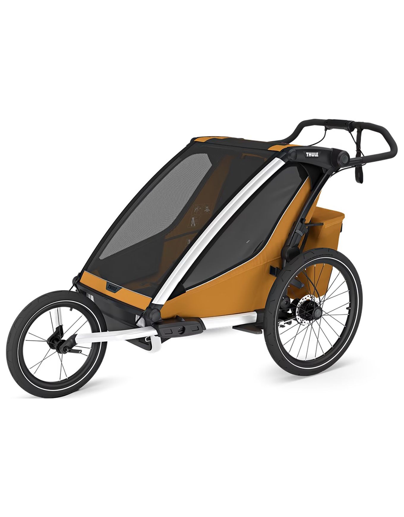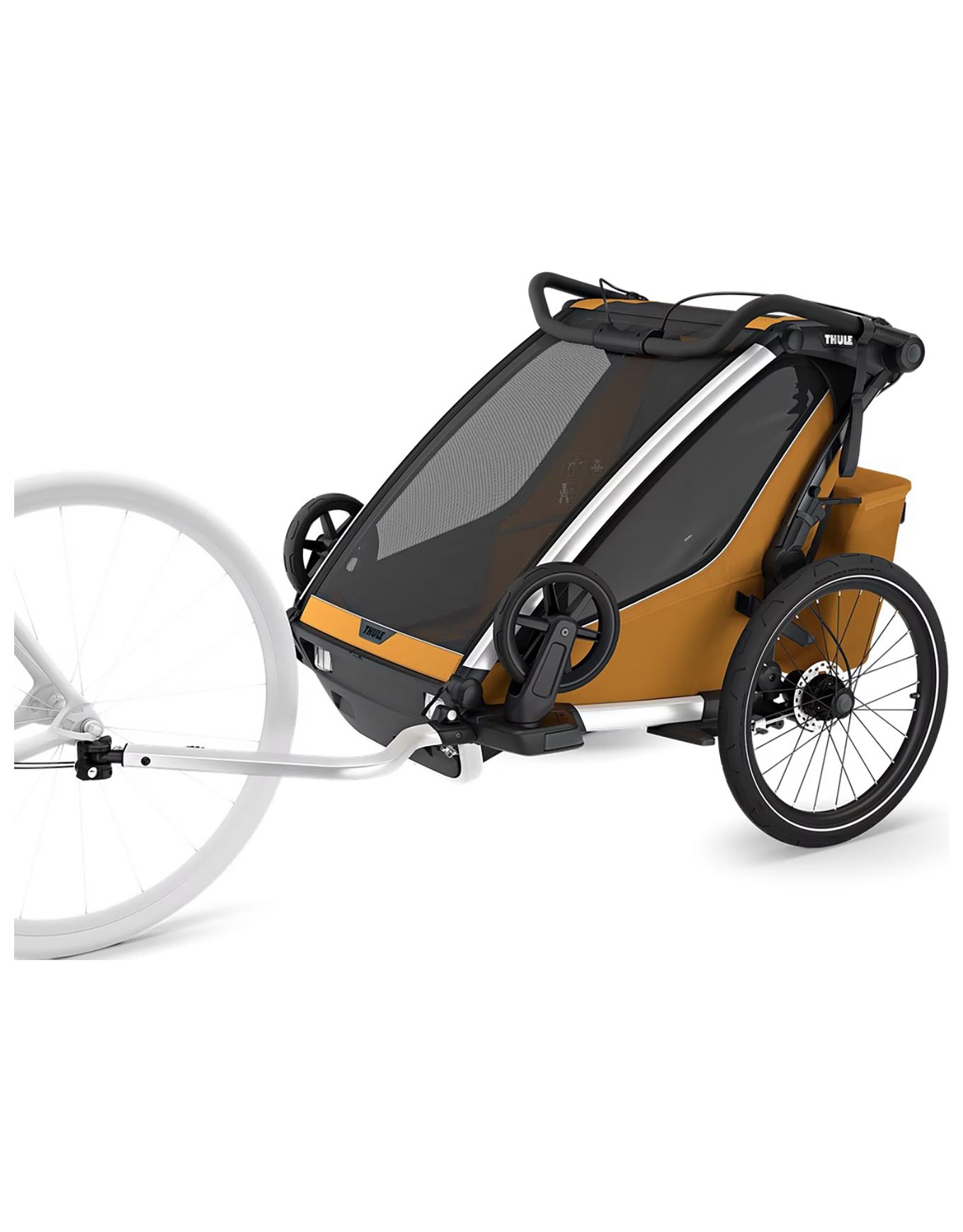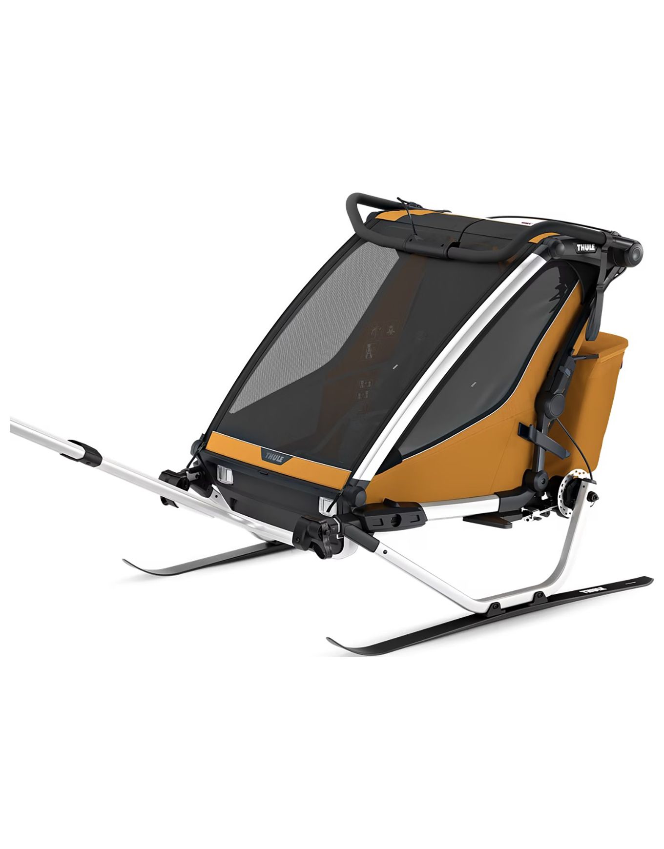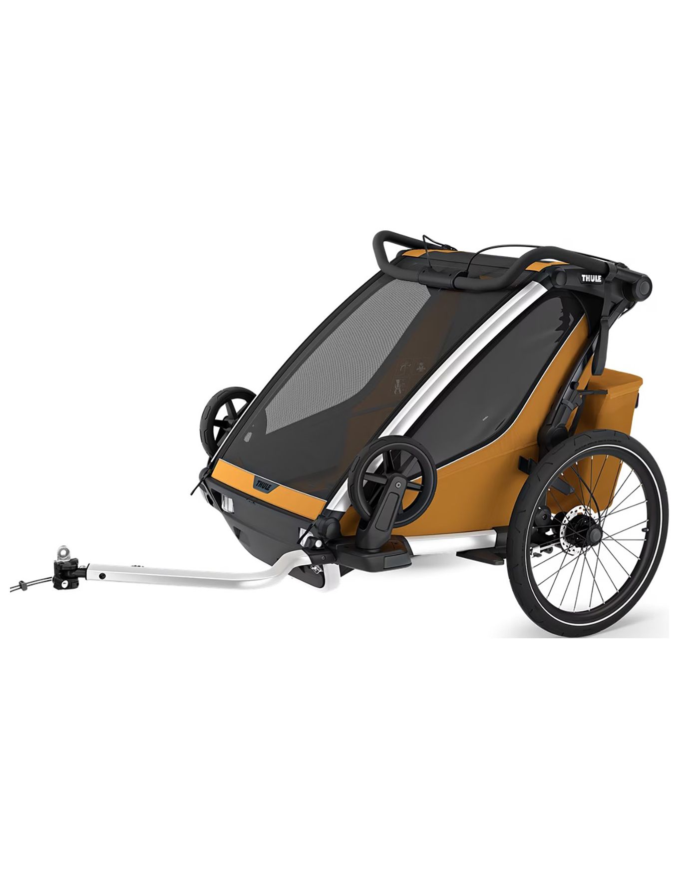 Thule Chariot Sport 2 Double Natural Gold, remorque multisports 2 places, permet de courir, pédaler, marcher et skier en transférant rapidement les kits via VersaWing. Sièges rembourrés, pare-soleil multiposition, rabat transparent, guidon ajustable et frein à disque assurent confort et conduite précise sur tout terrain.