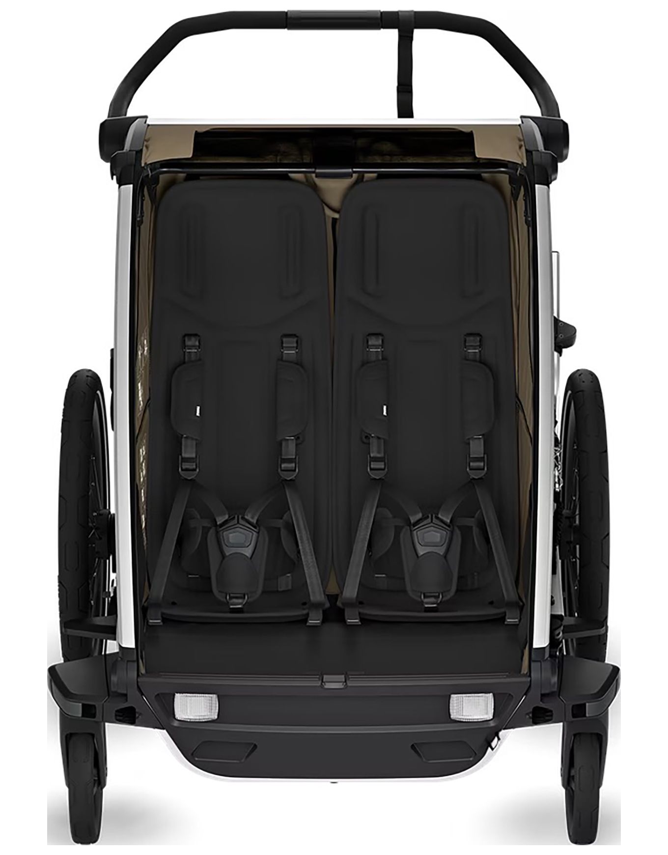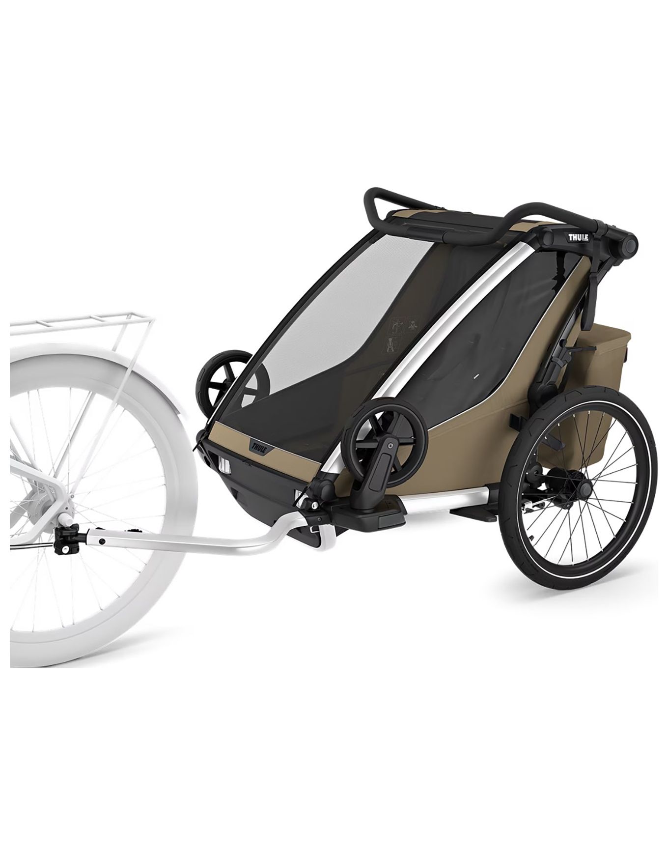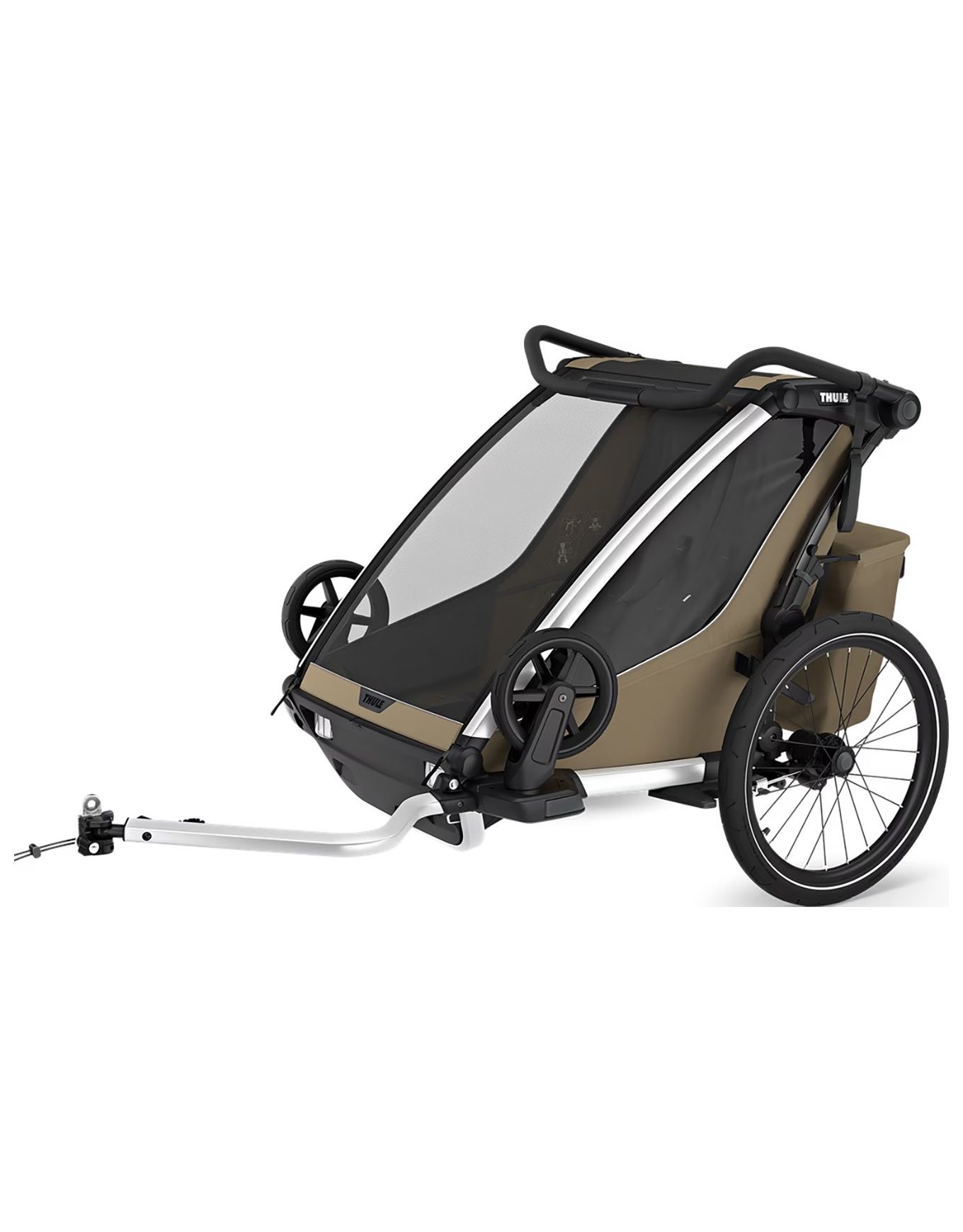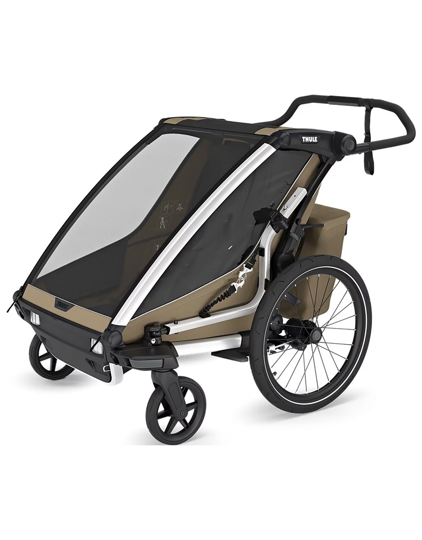 Thule Chariot Cross 2 Double Faded Khaki : poussette-remorque 2 places multisports pour marcher, pédaler, courir ou skier grâce aux kits compatibles. Système VersaWing pour changement rapide d’activité, sièges matelassés, ventilation réglable, capote transparente, guidon ajustable et éclairage arrière intégrés.