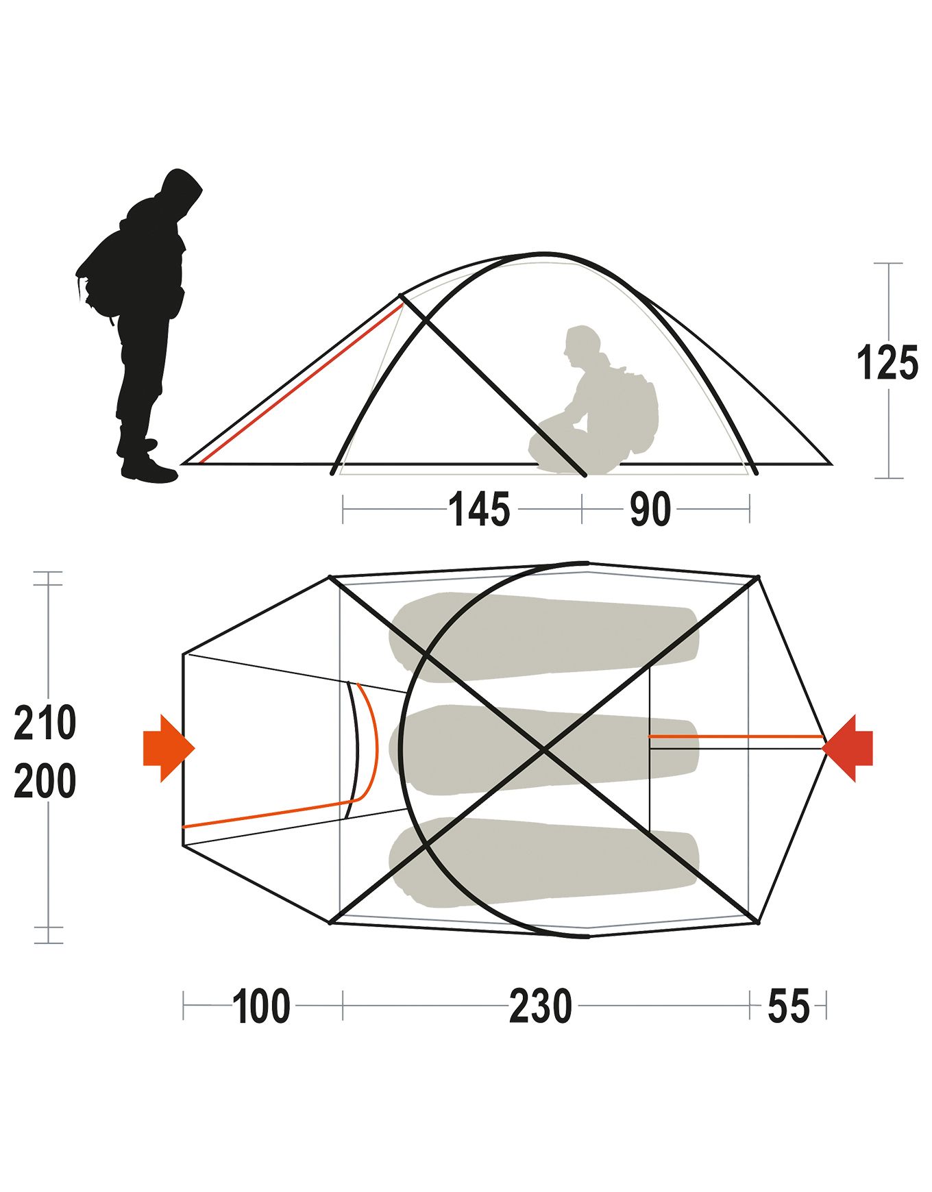 - Hauteur sous tente : 125 cm