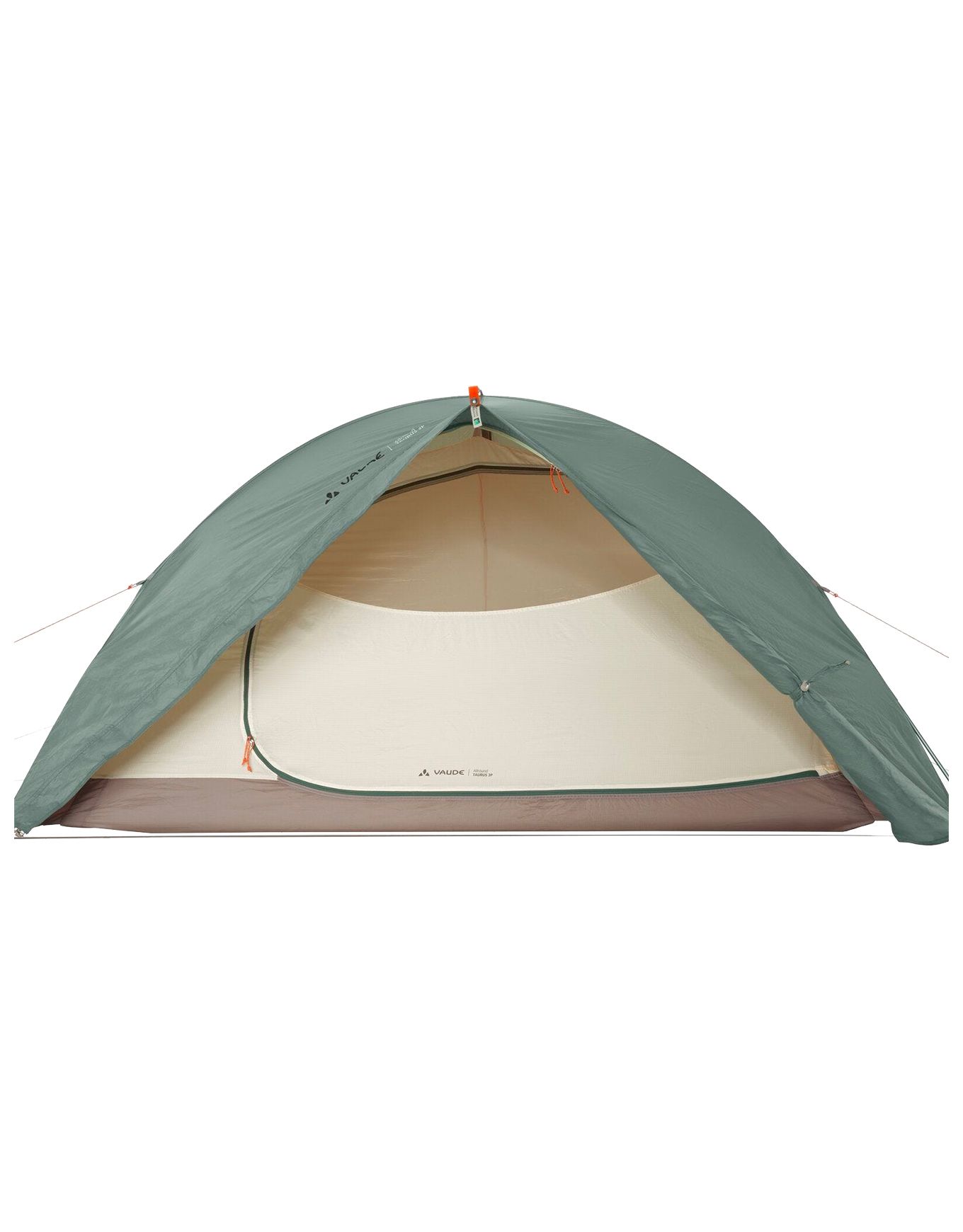 Tente Allround Taurus 3P Agave Vaude 3 places, géodésique légère pour trekking et bikepacking, montage rapide, toile Eco Finish sans PFC, plafond confortable, abside spacieuse, aération réglable et mesh antimoustique.