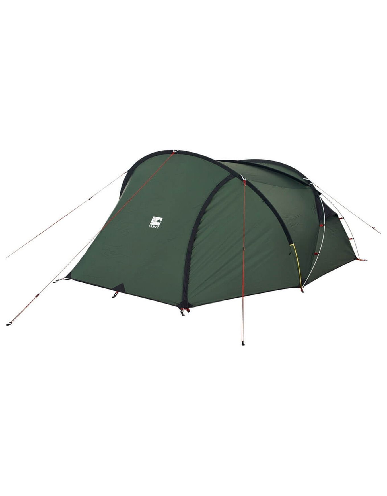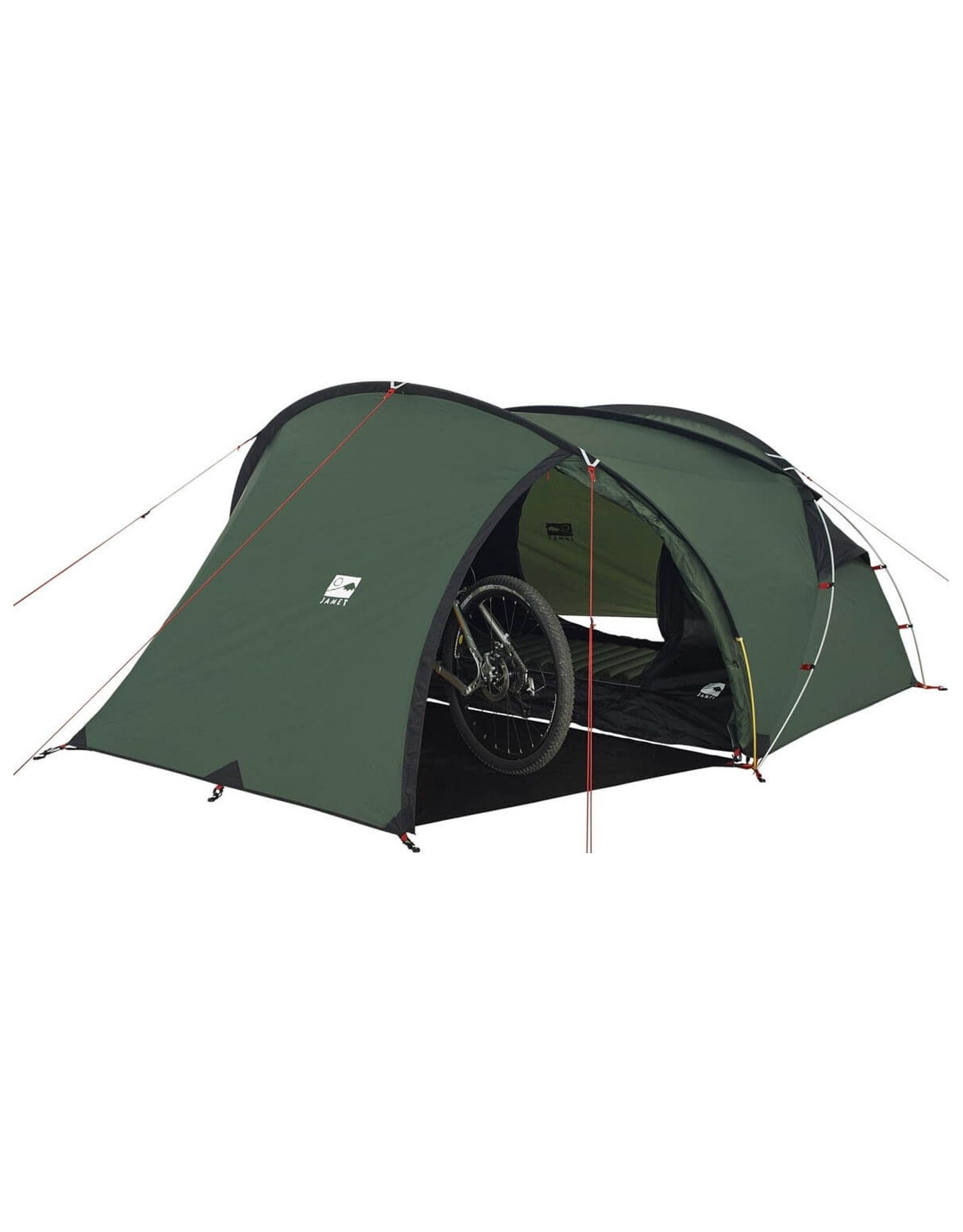La tente trois saisons Jamet Cyclo abrite 2 cyclistes et leurs vélos sous dôme ripstop 70D résistant vent-pluie, abside spacieuse, aération et moustiquaire intégrées.