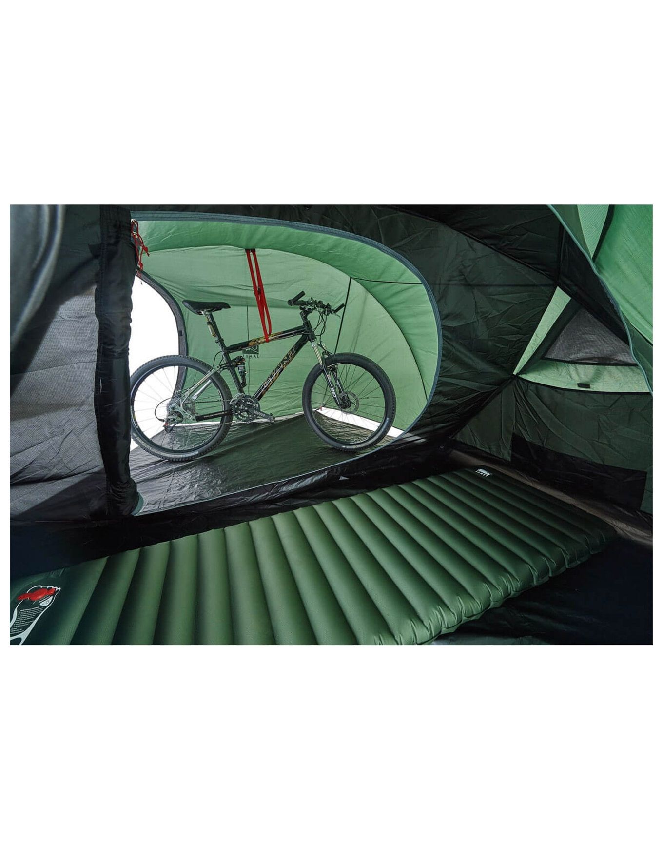 Son abside généreuse offre l’espace nécessaire pour que deux personnes puissent passer la nuit paisiblement tout en abritant leurs deux bicyclettes des intempéries. La réalisation en polyester ripstop 70D garantit une protection efficace contre les précipitations et les bourrasques.